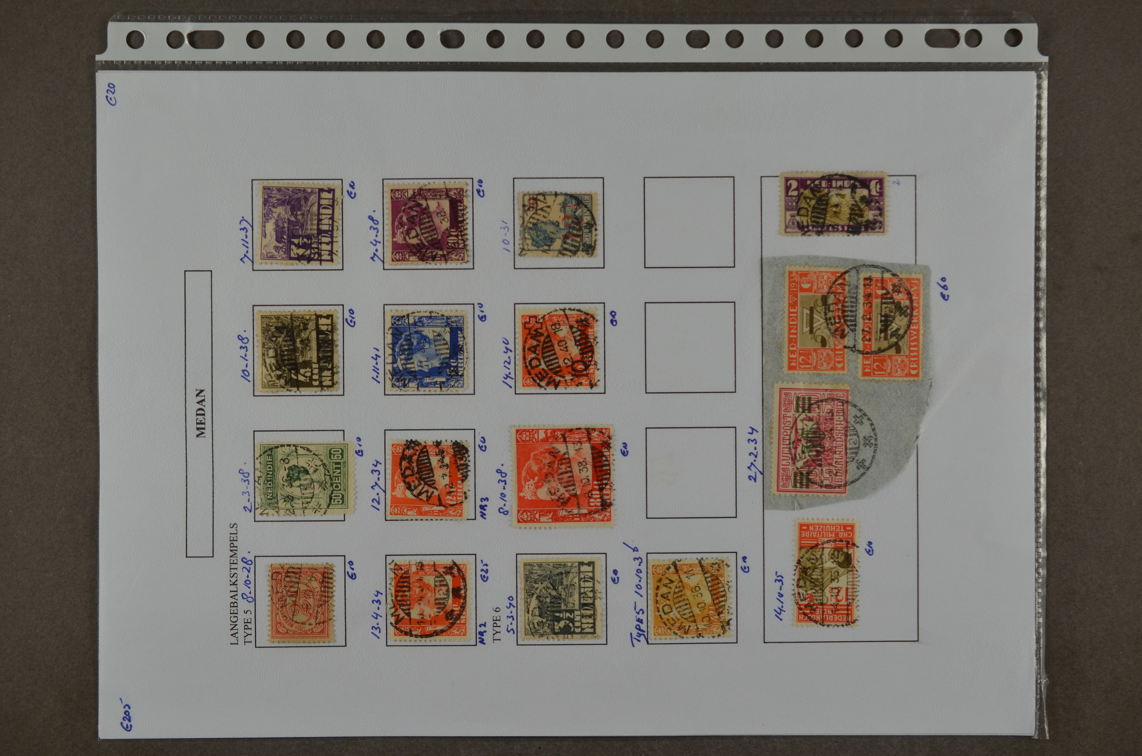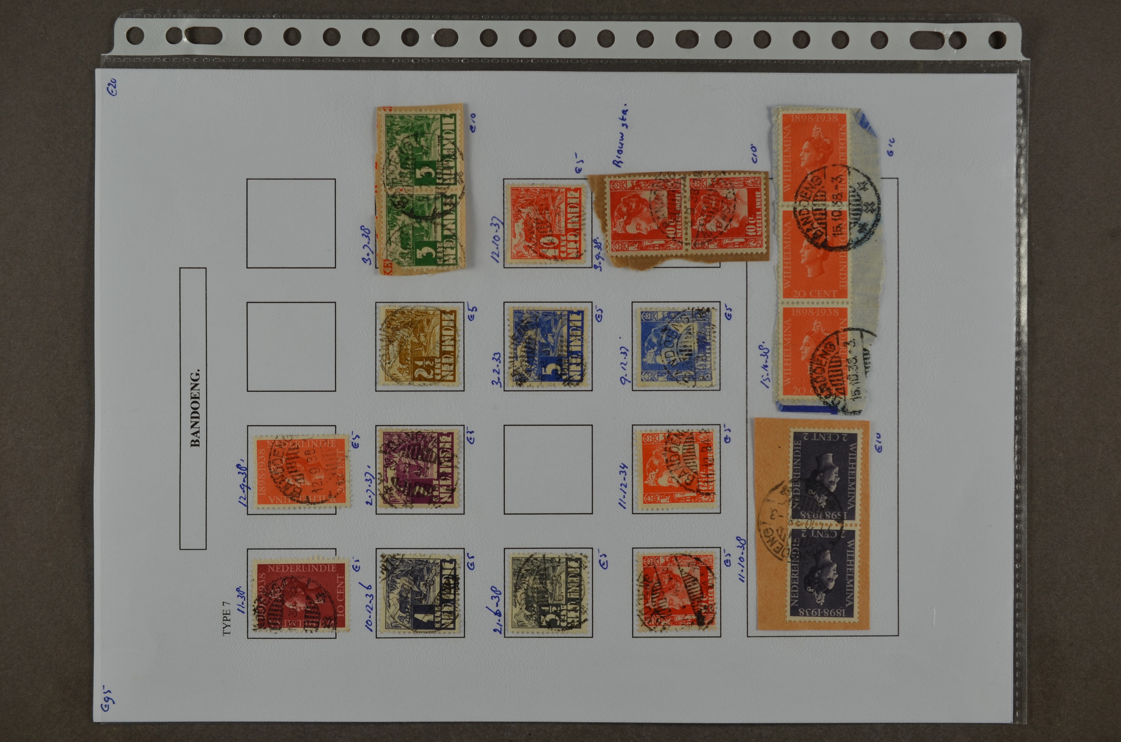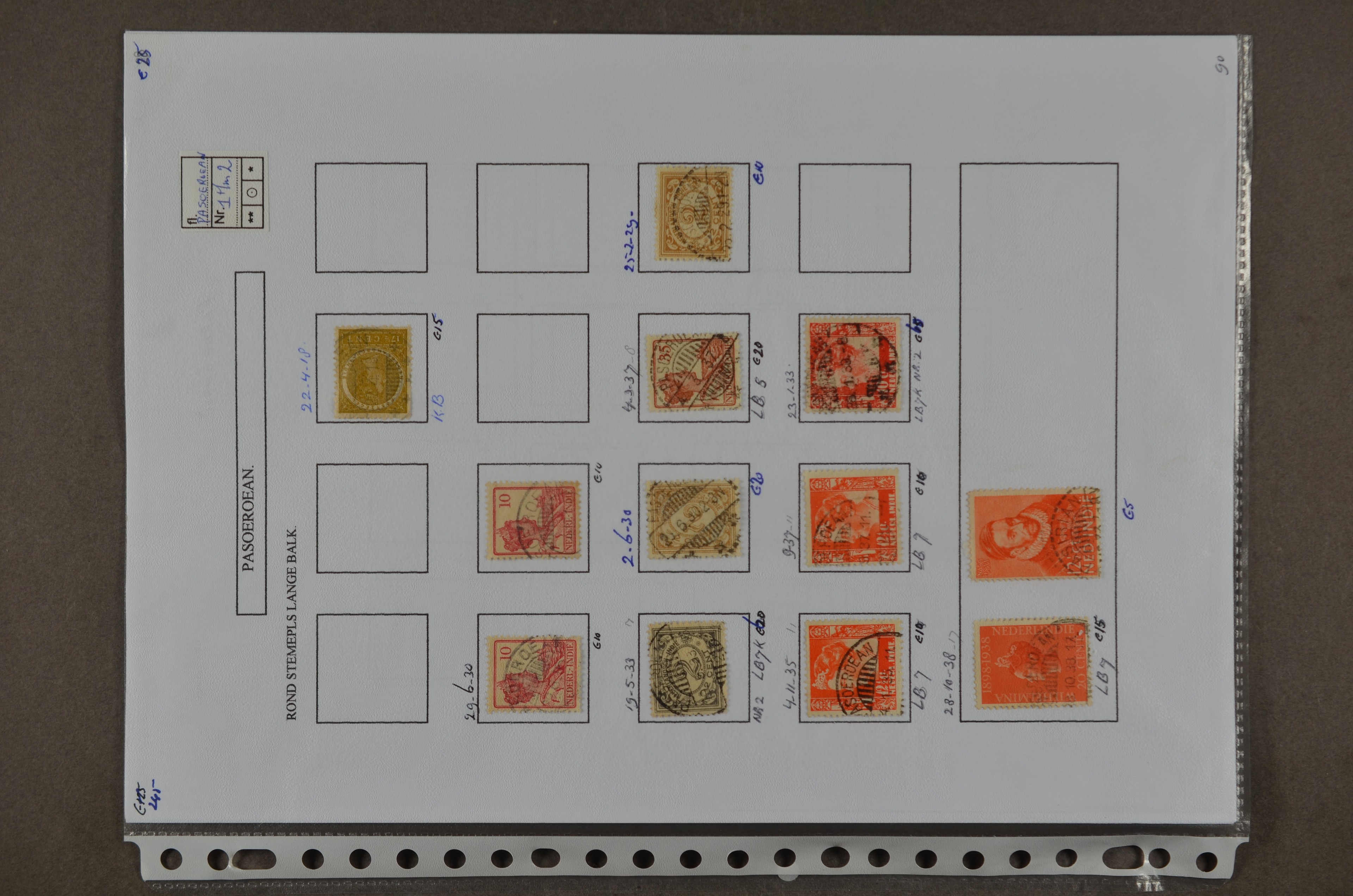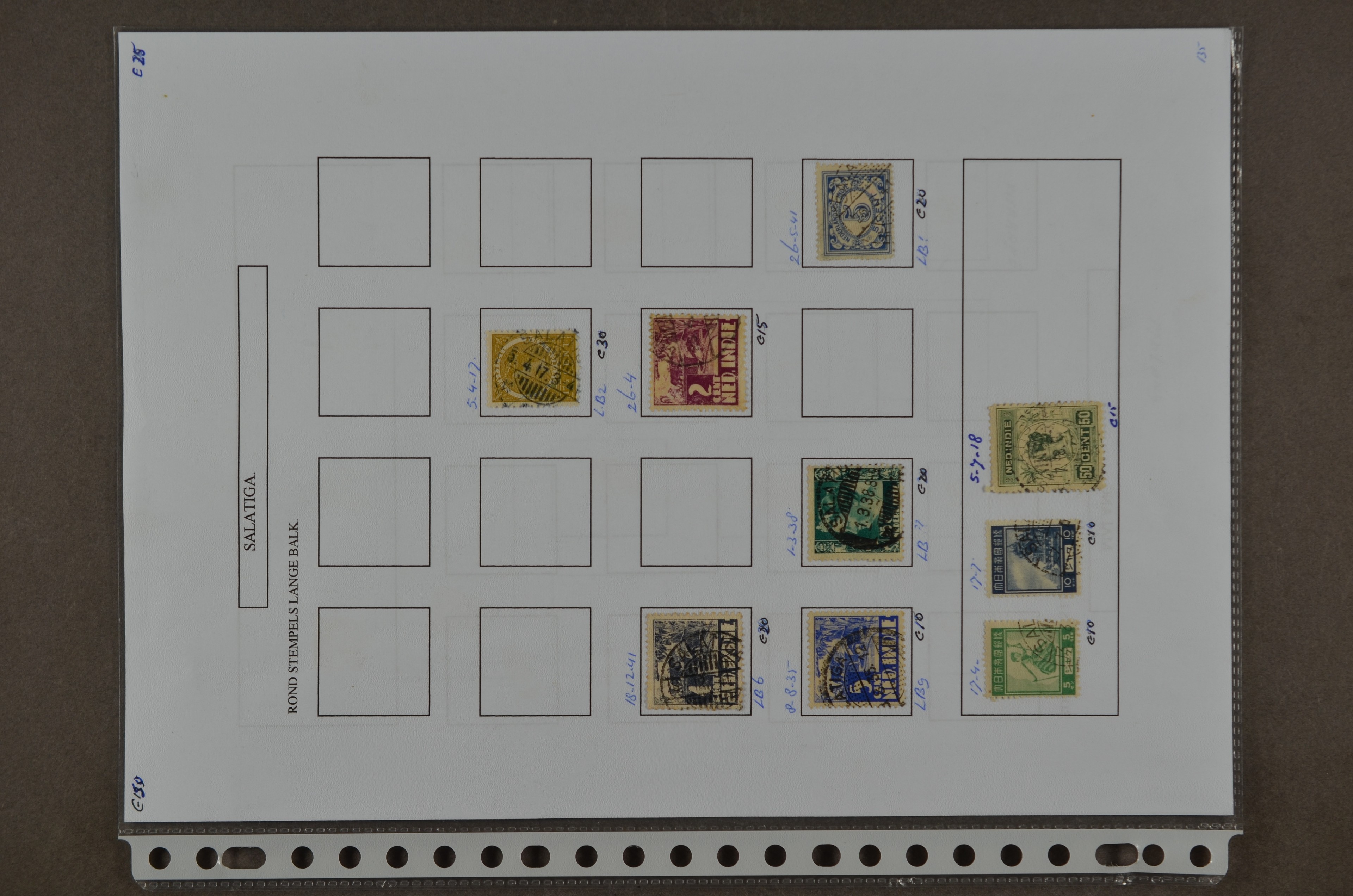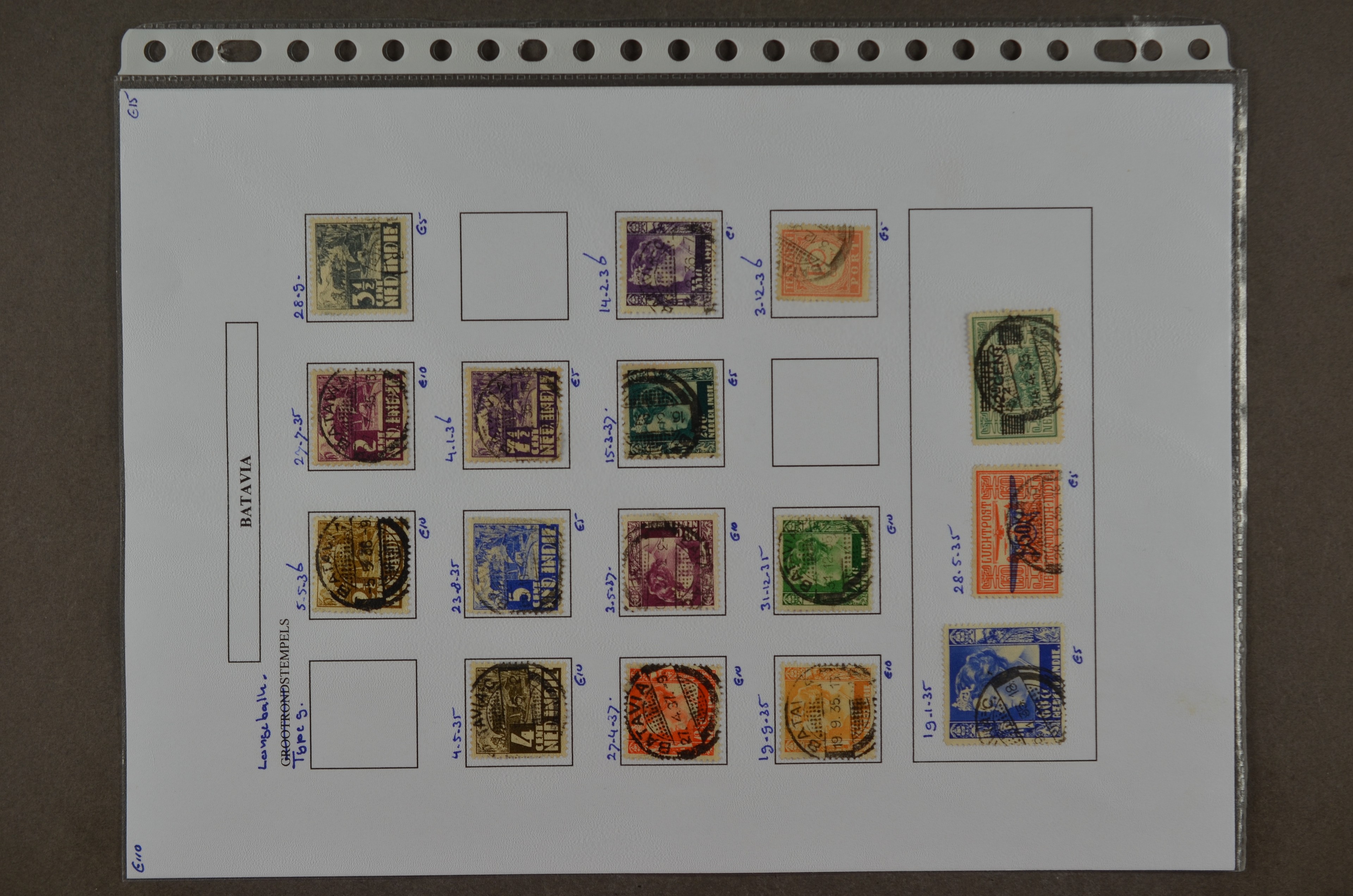 NED.- INDIË Langebalkstempels vanaf 1917, uitgebreide collectie met meerdere schaarse kantoren, verschillende typen per kantoor, veel mooie afstempelingen, ook andere typen als KB, PV1, PV2, LBnr, opgezet op bladen (w.o. door verzamelaar diverse foutief genoemde kantoornamen) in 8 ringbanden