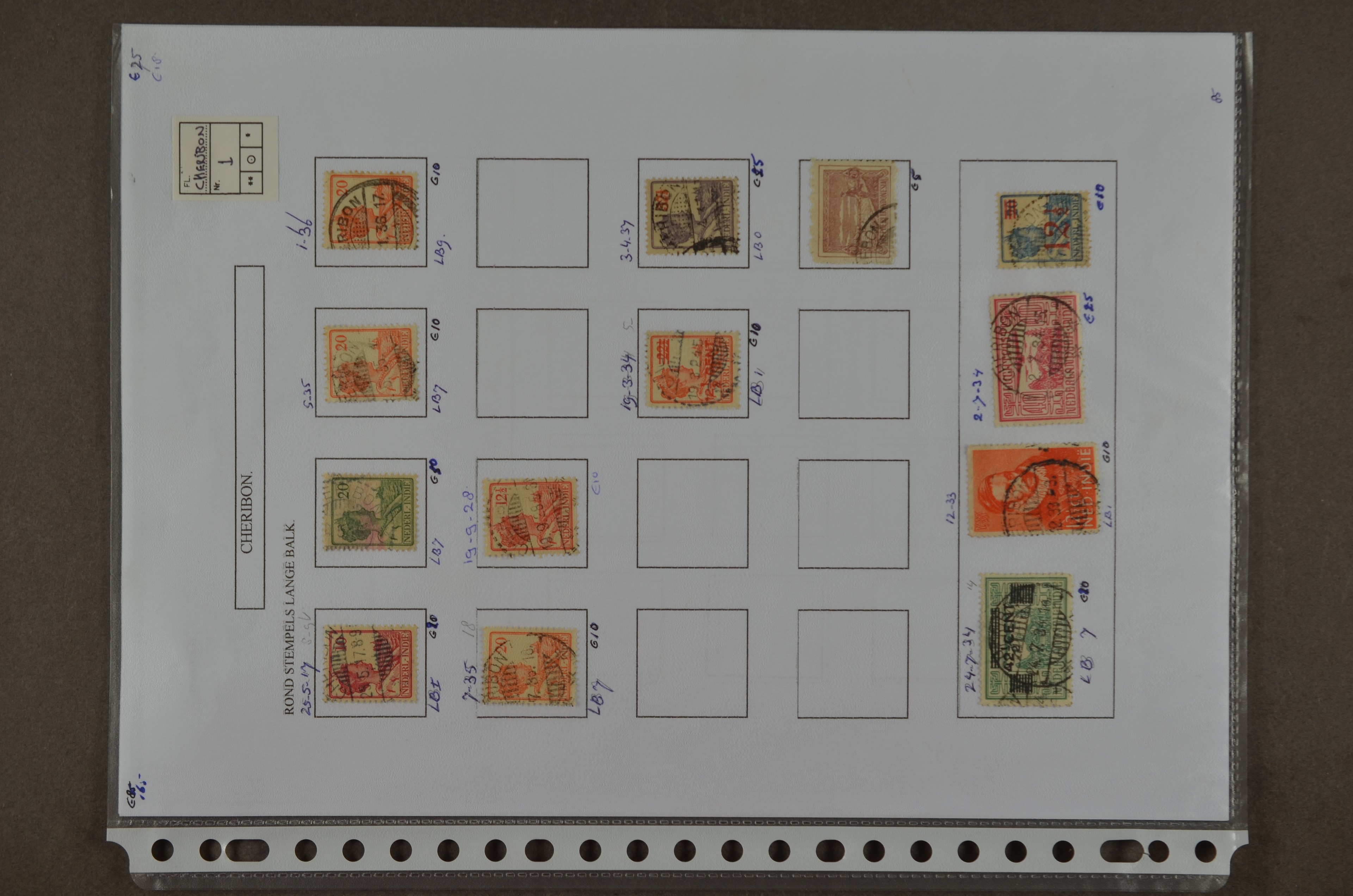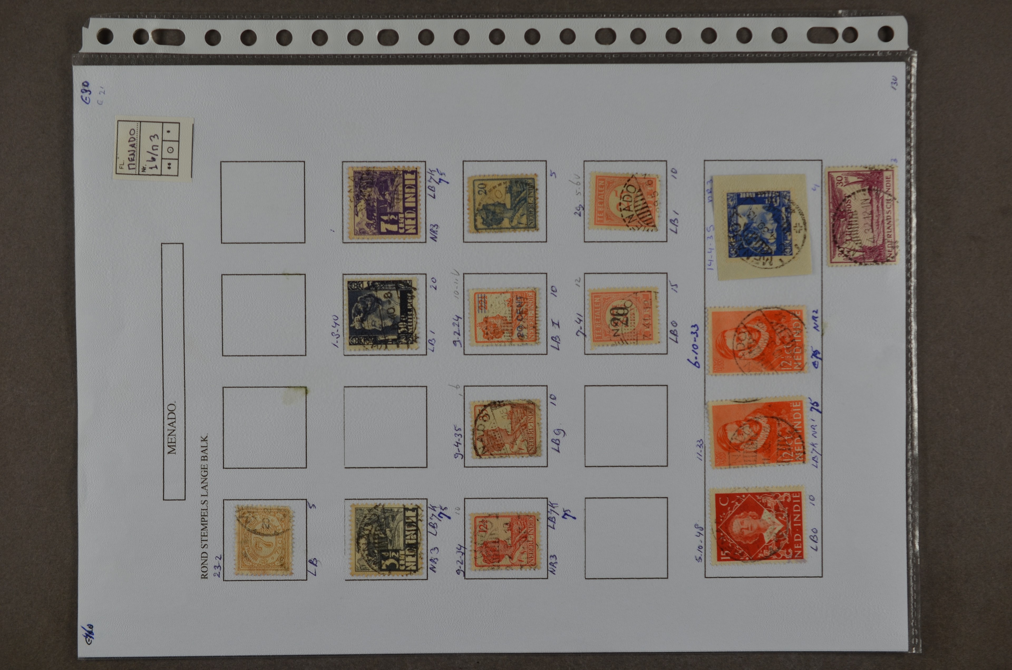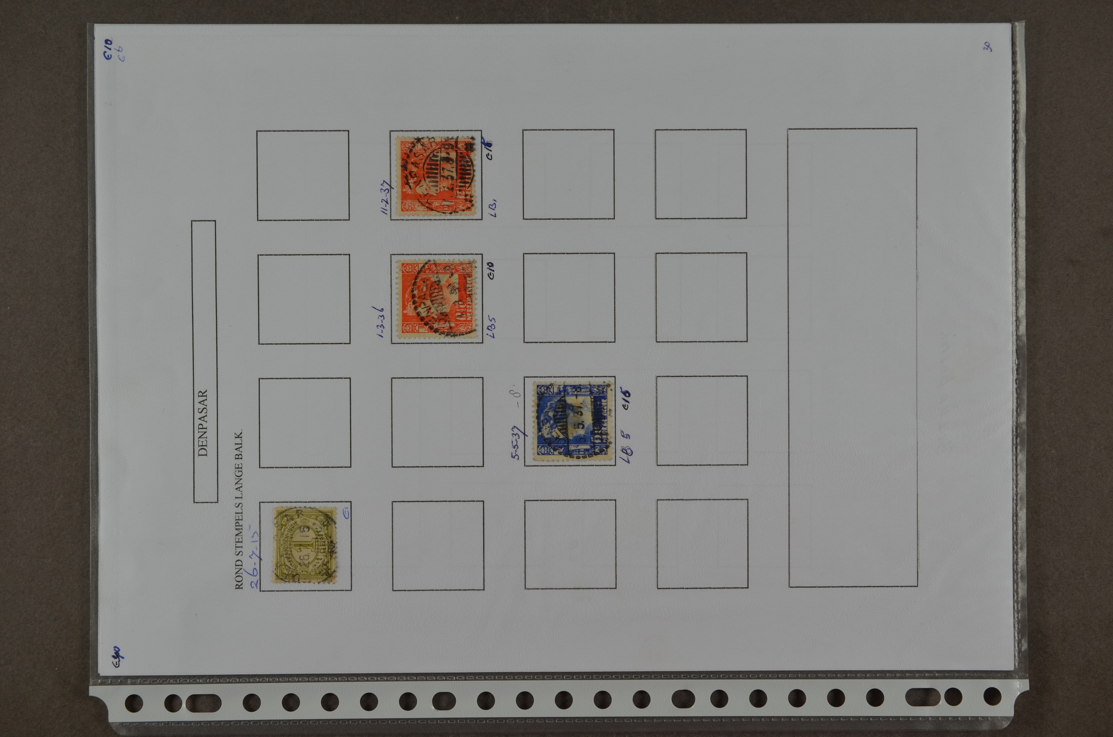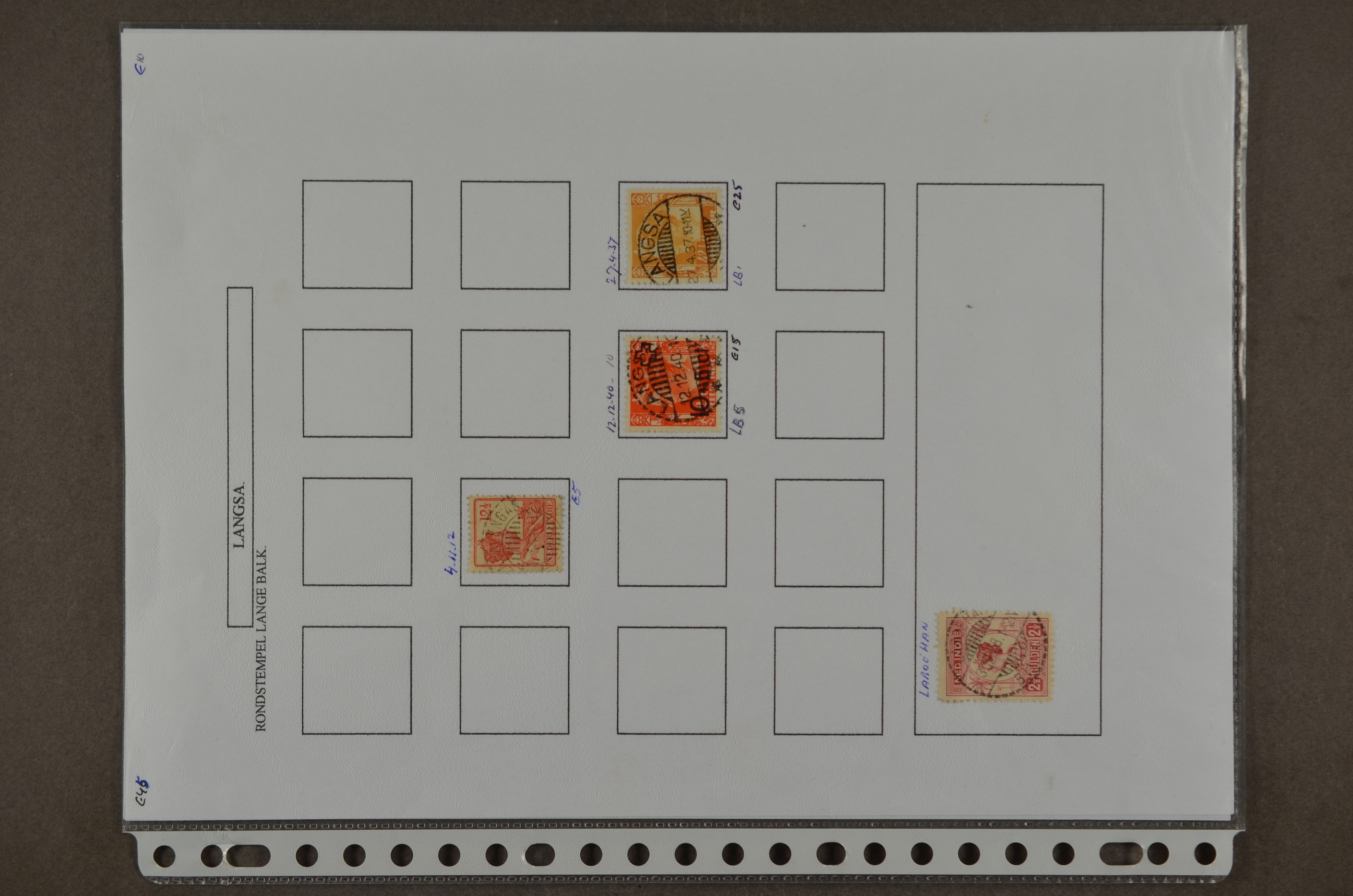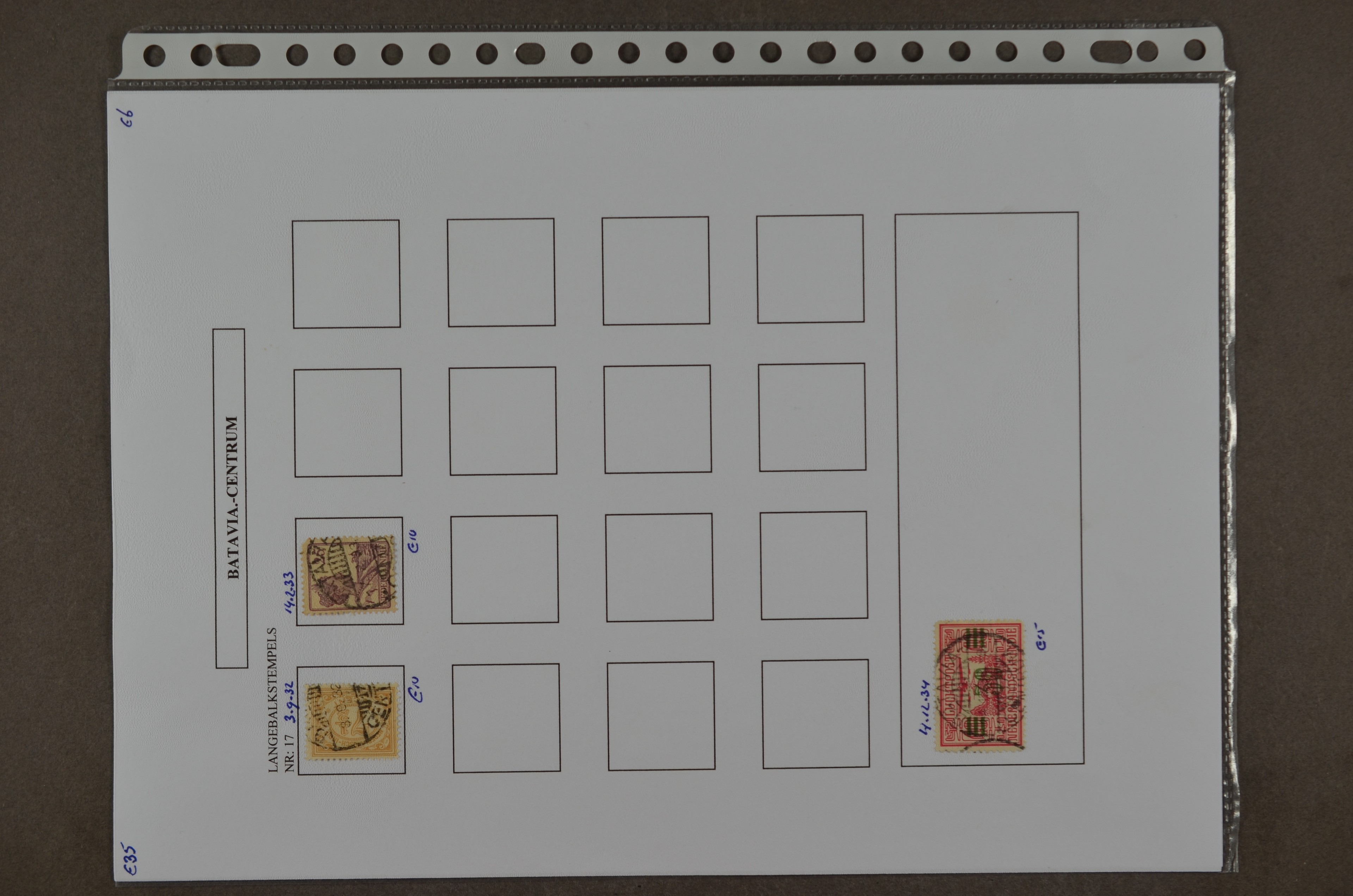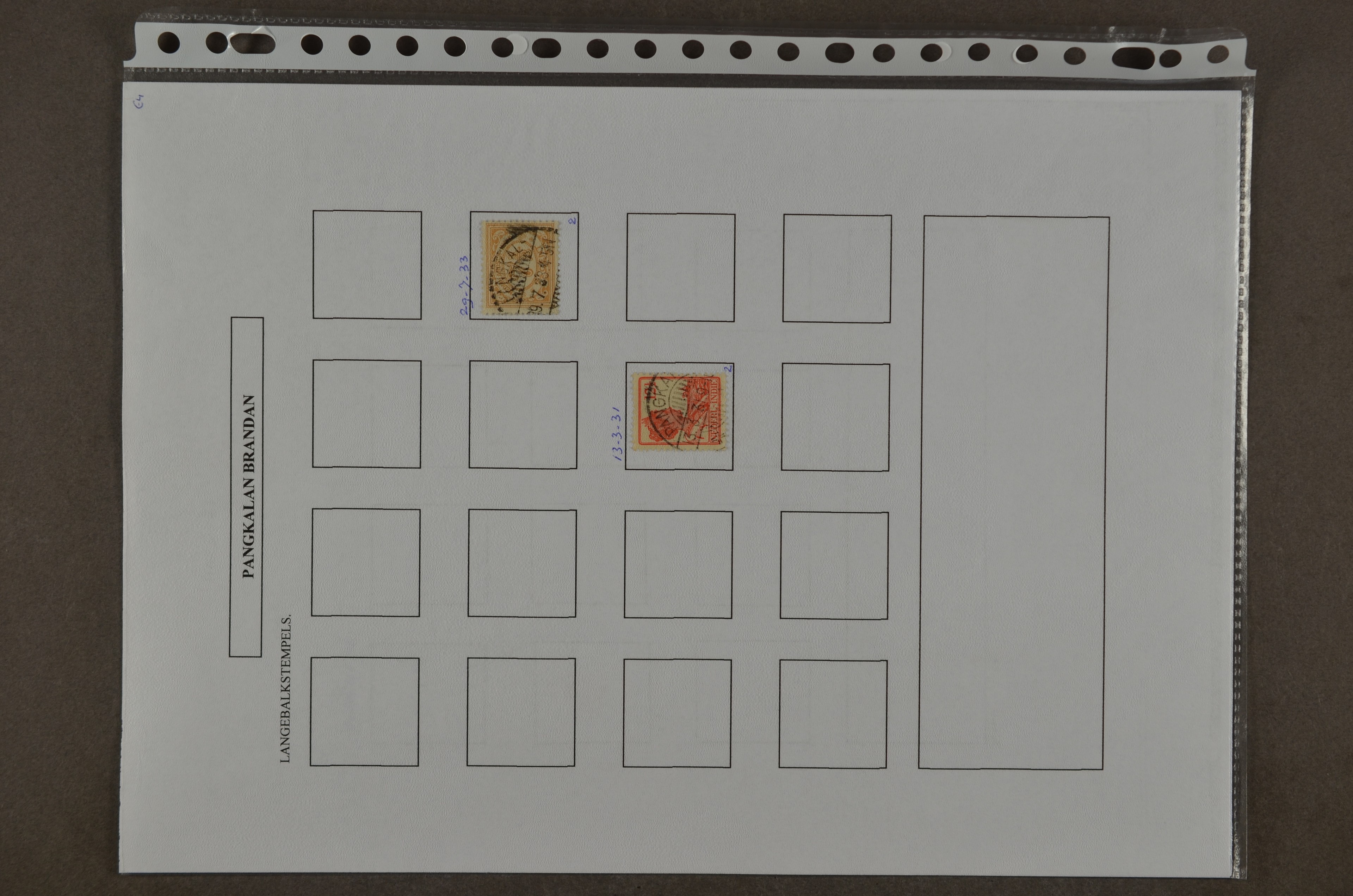 NED.- INDIË Langebalkstempels vanaf 1917, uitgebreide collectie met meerdere schaarse kantoren, verschillende typen per kantoor, veel mooie afstempelingen, ook andere typen als KB, PV1, PV2, LBnr, opgezet op bladen (w.o. door verzamelaar diverse foutief genoemde kantoornamen) in 8 ringbanden