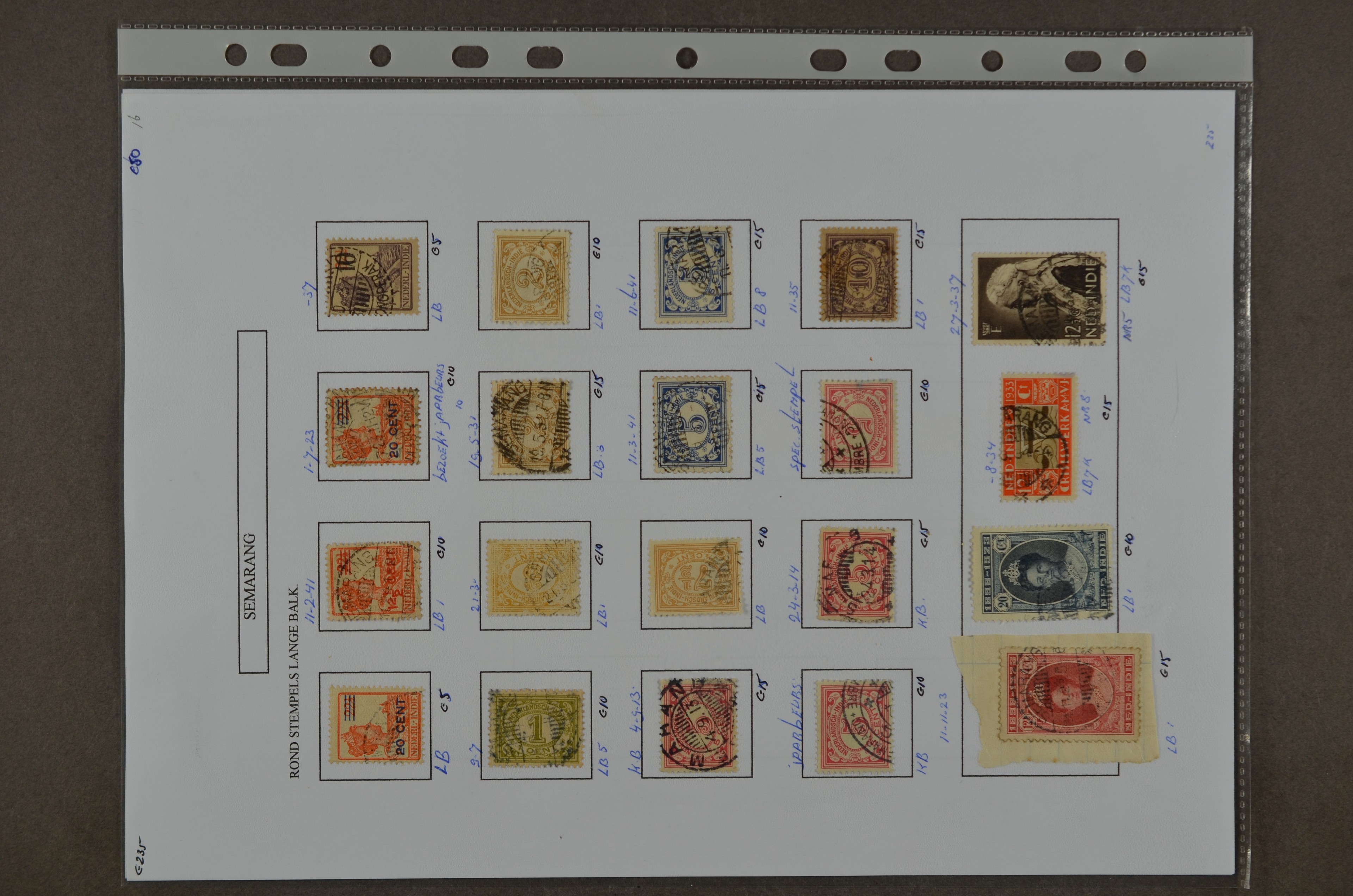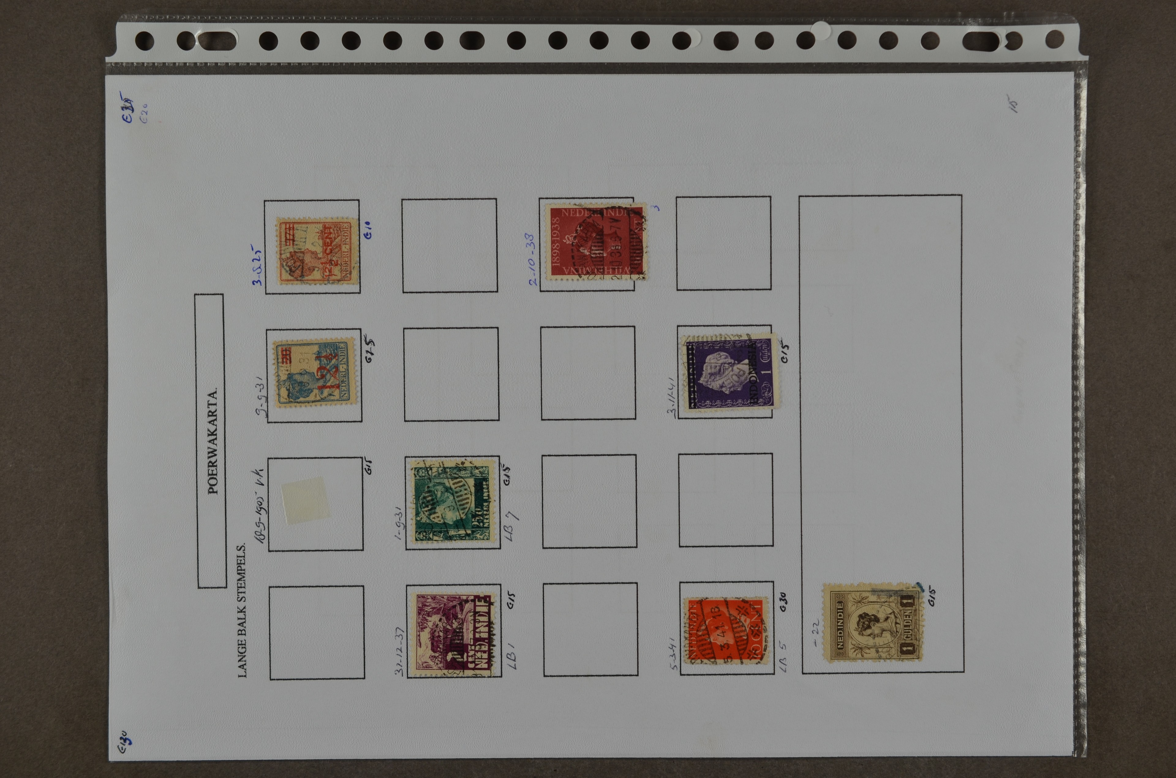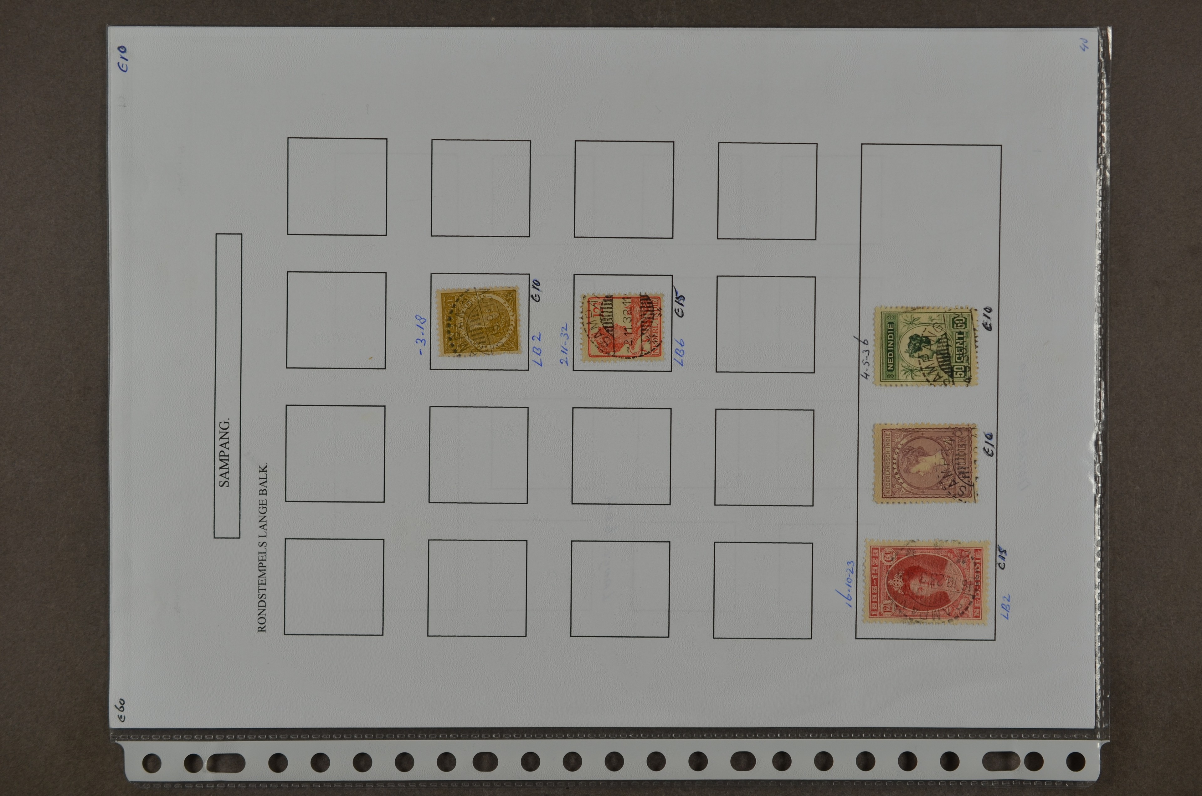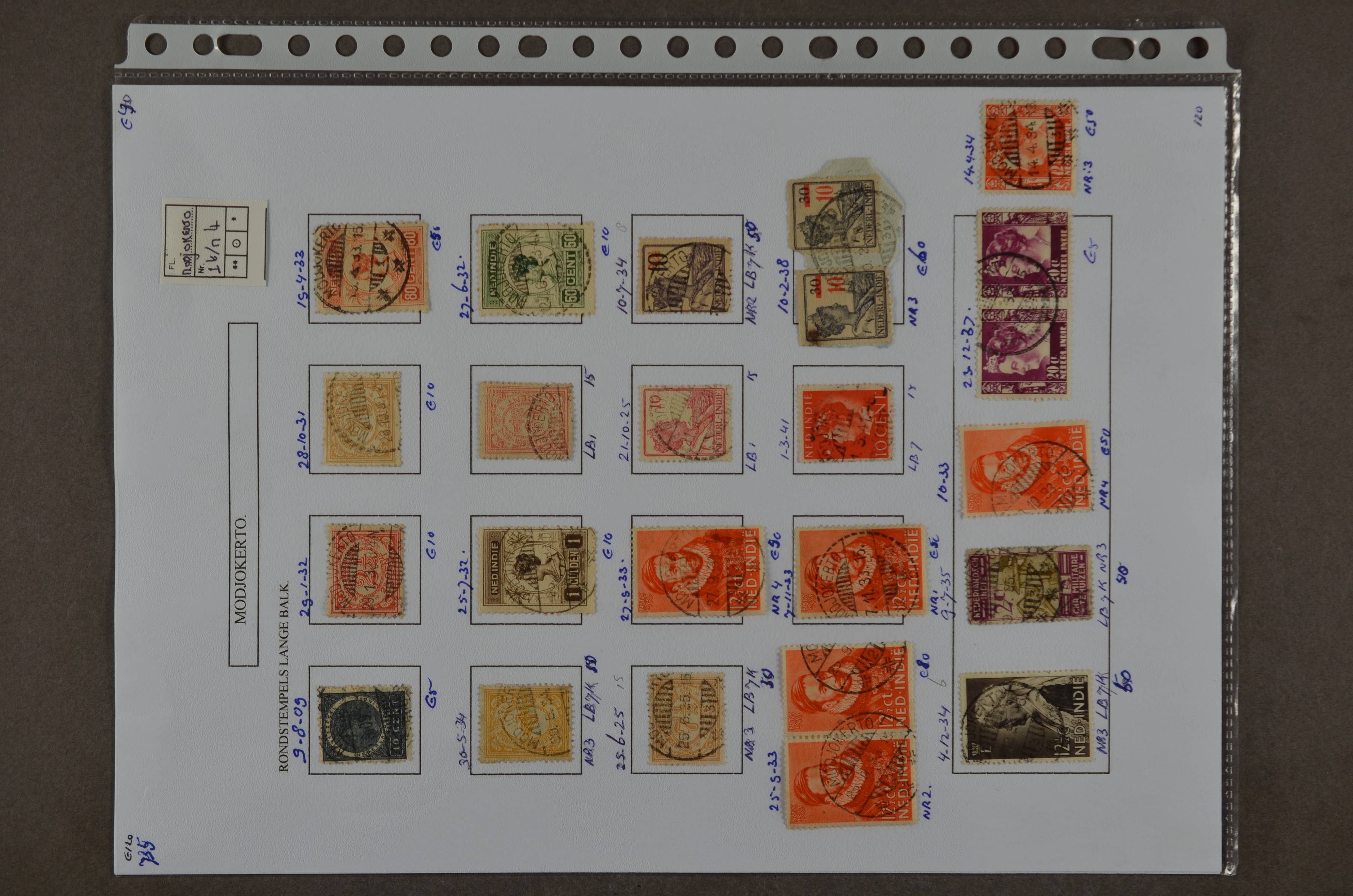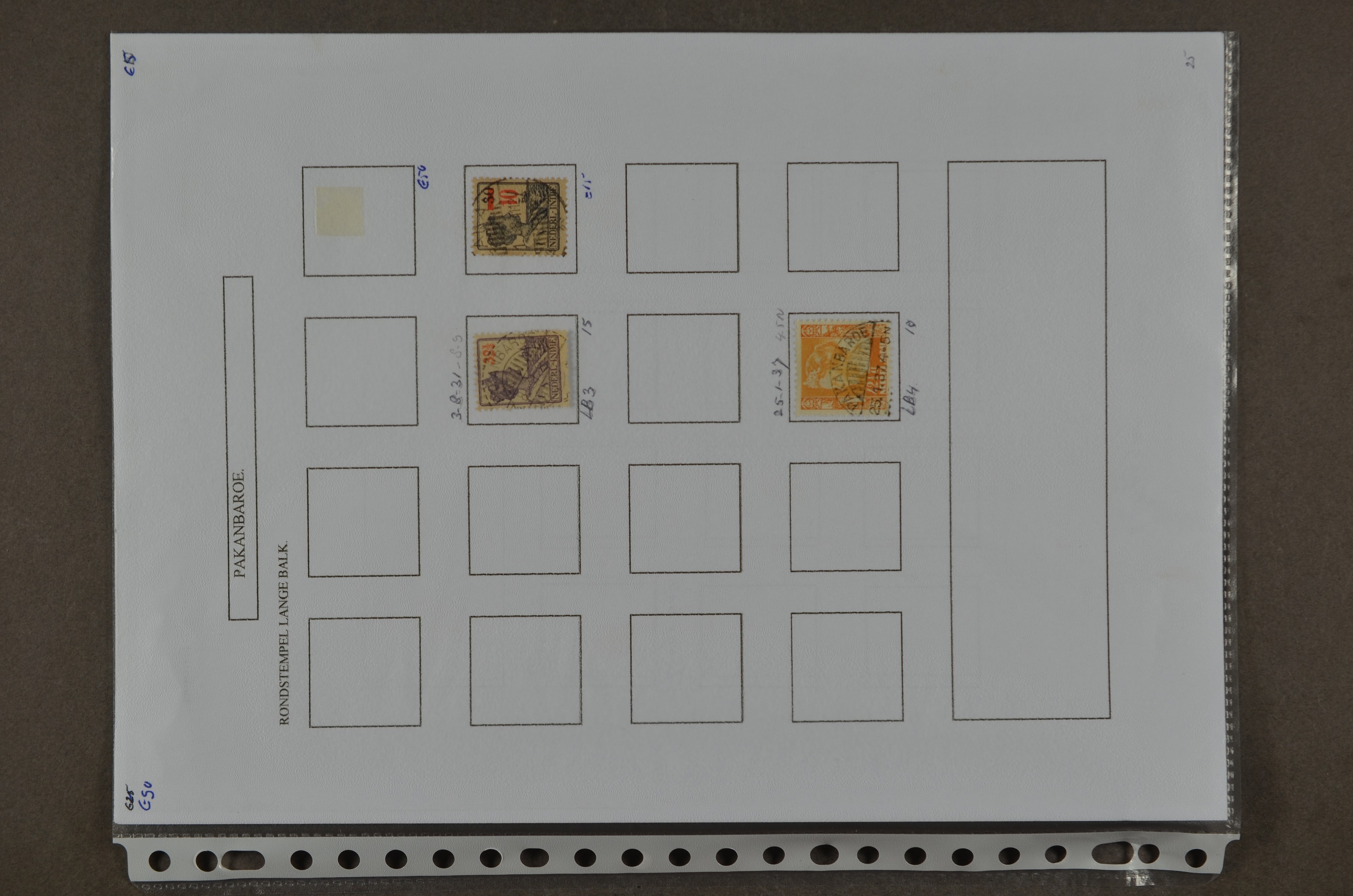 NED.- INDIË Langebalkstempels vanaf 1917, uitgebreide collectie met meerdere schaarse kantoren, verschillende typen per kantoor, veel mooie afstempelingen, ook andere typen als KB, PV1, PV2, LBnr, opgezet op bladen (w.o. door verzamelaar diverse foutief genoemde kantoornamen) in 8 ringbanden
