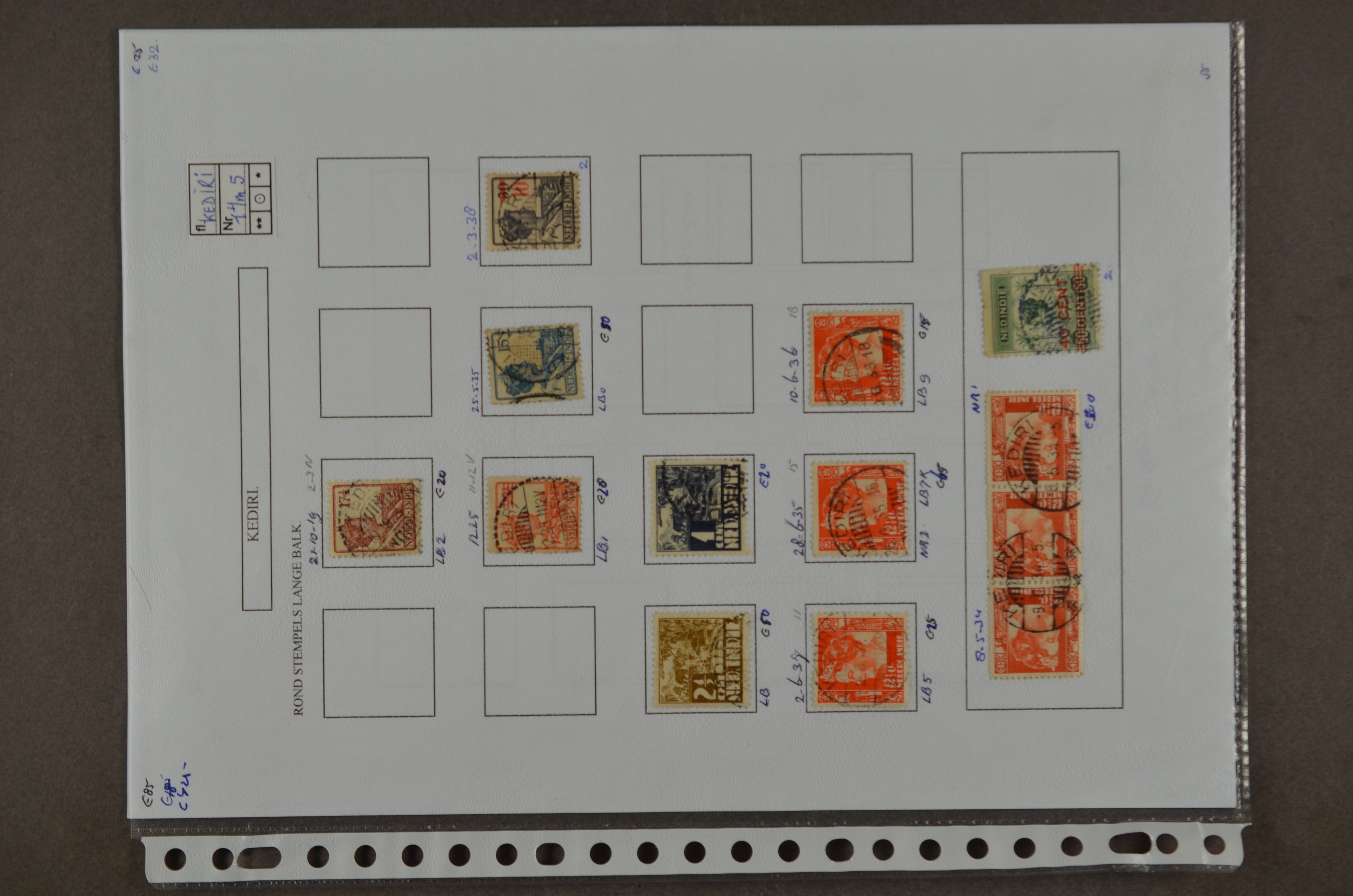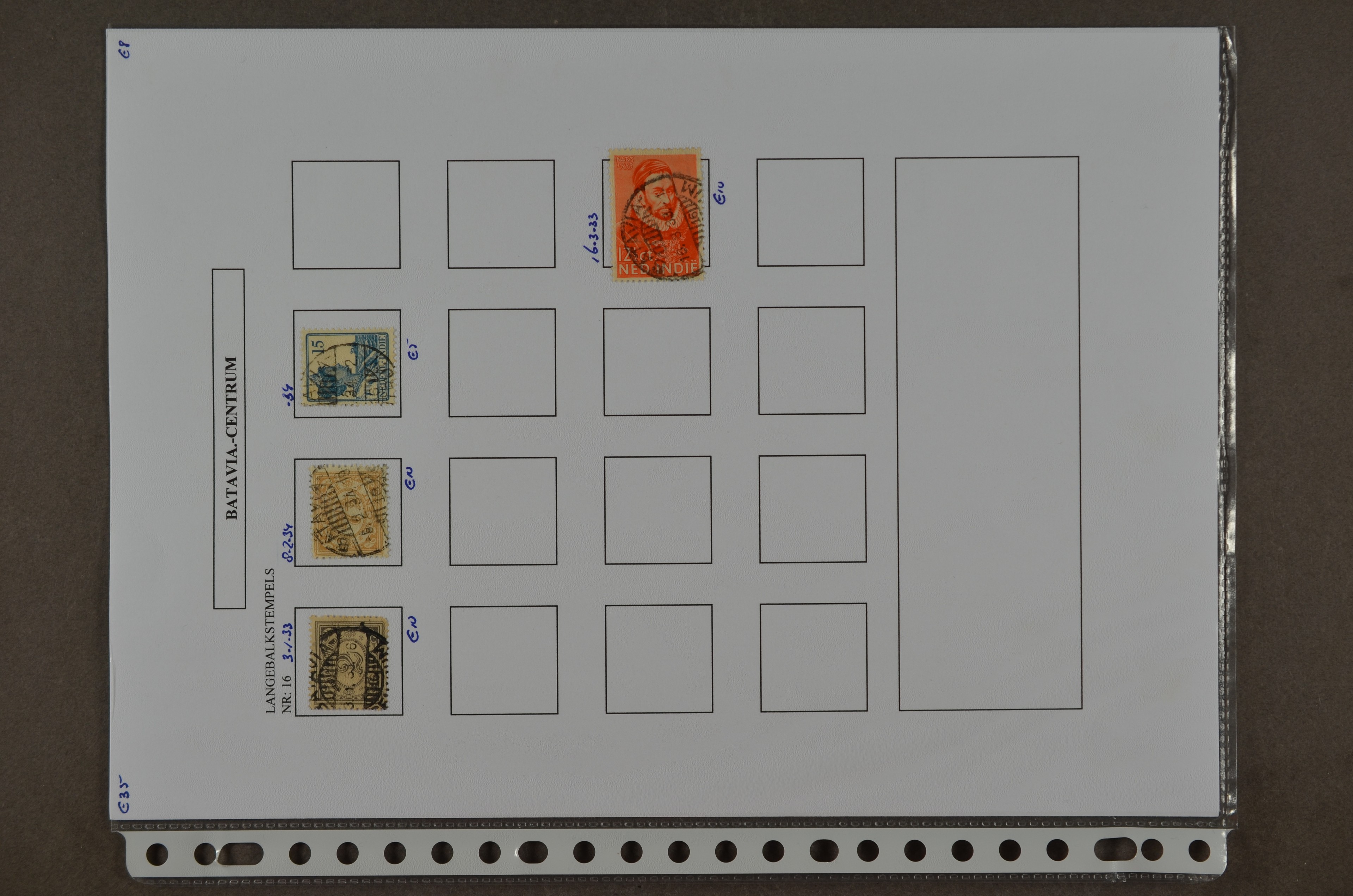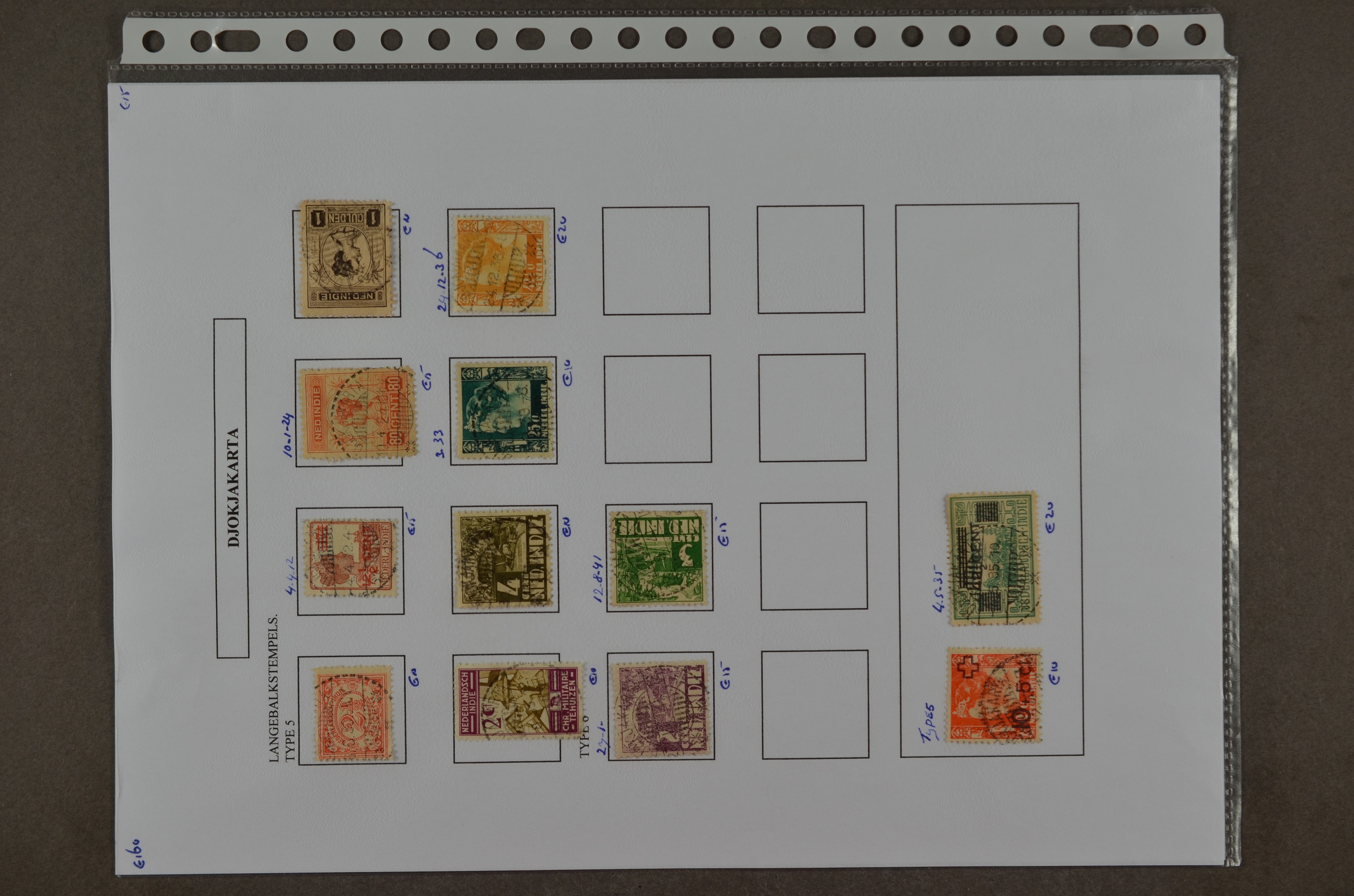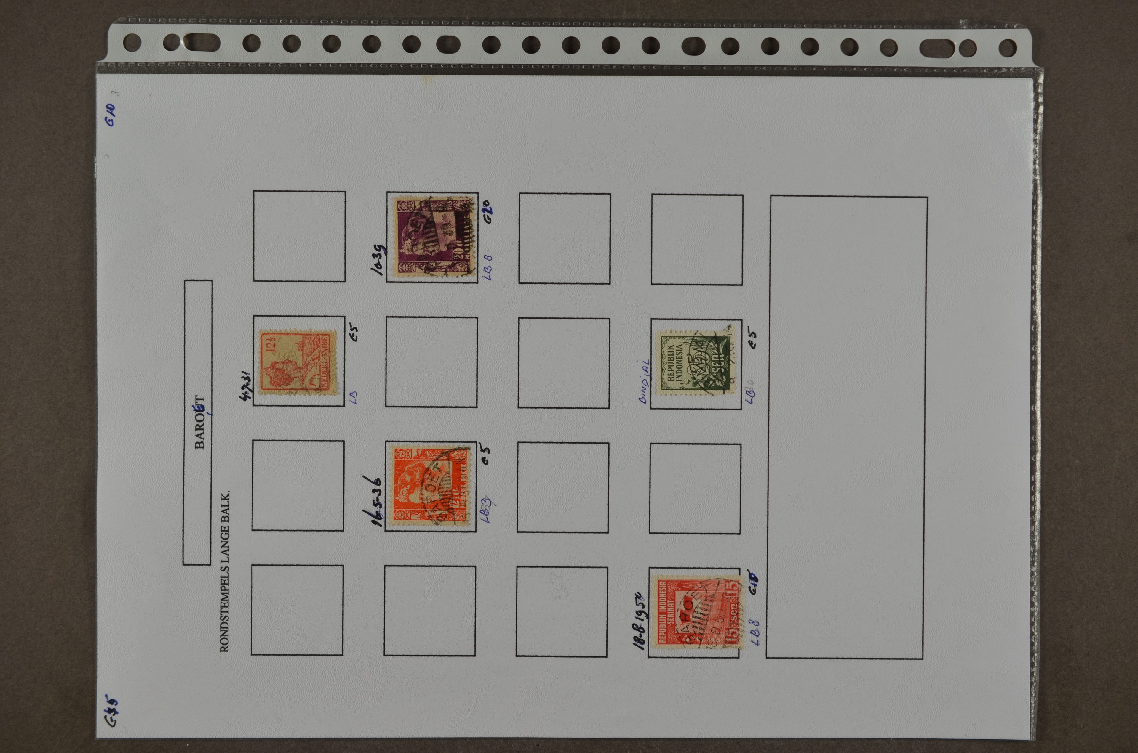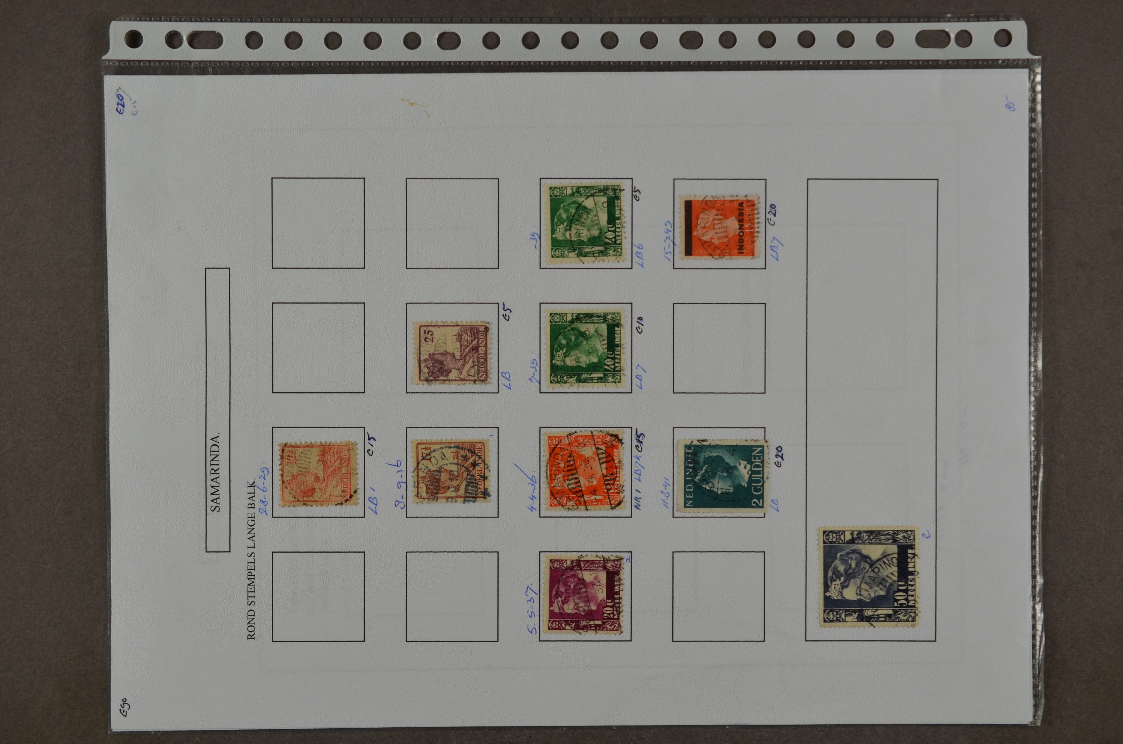 NED.- INDIË Langebalkstempels vanaf 1917, uitgebreide collectie met meerdere schaarse kantoren, verschillende typen per kantoor, veel mooie afstempelingen, ook andere typen als KB, PV1, PV2, LBnr, opgezet op bladen (w.o. door verzamelaar diverse foutief genoemde kantoornamen) in 8 ringbanden