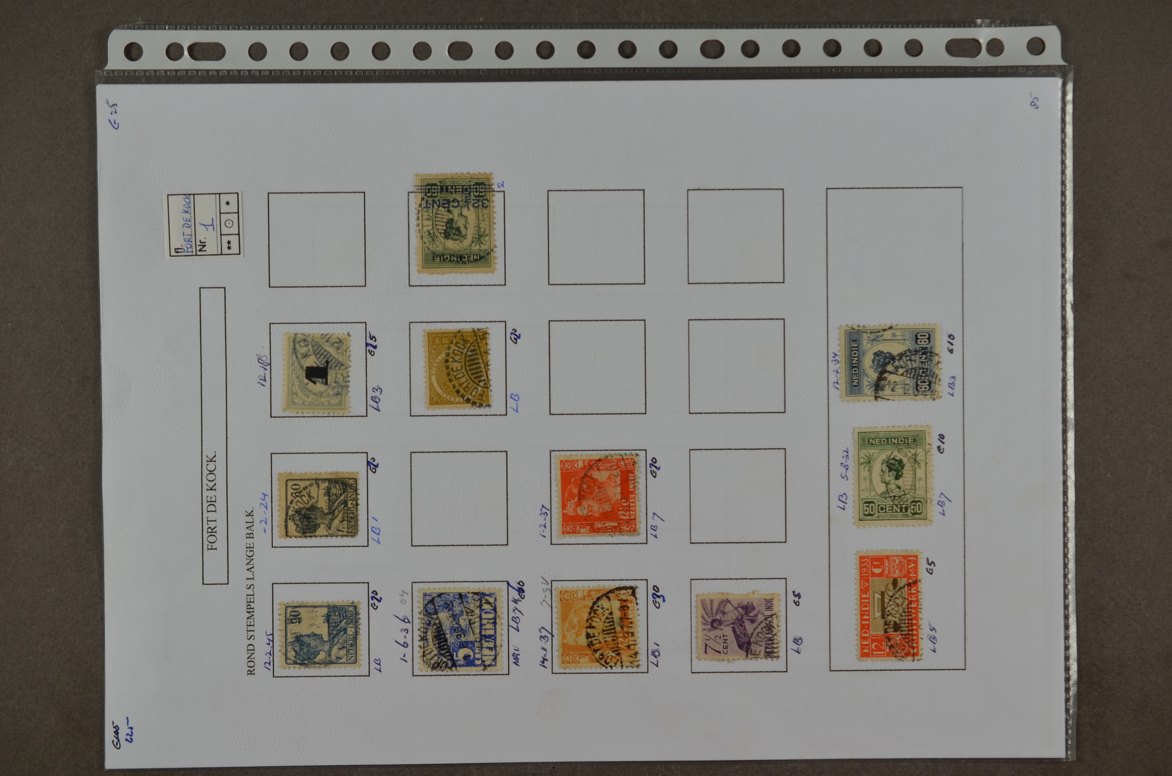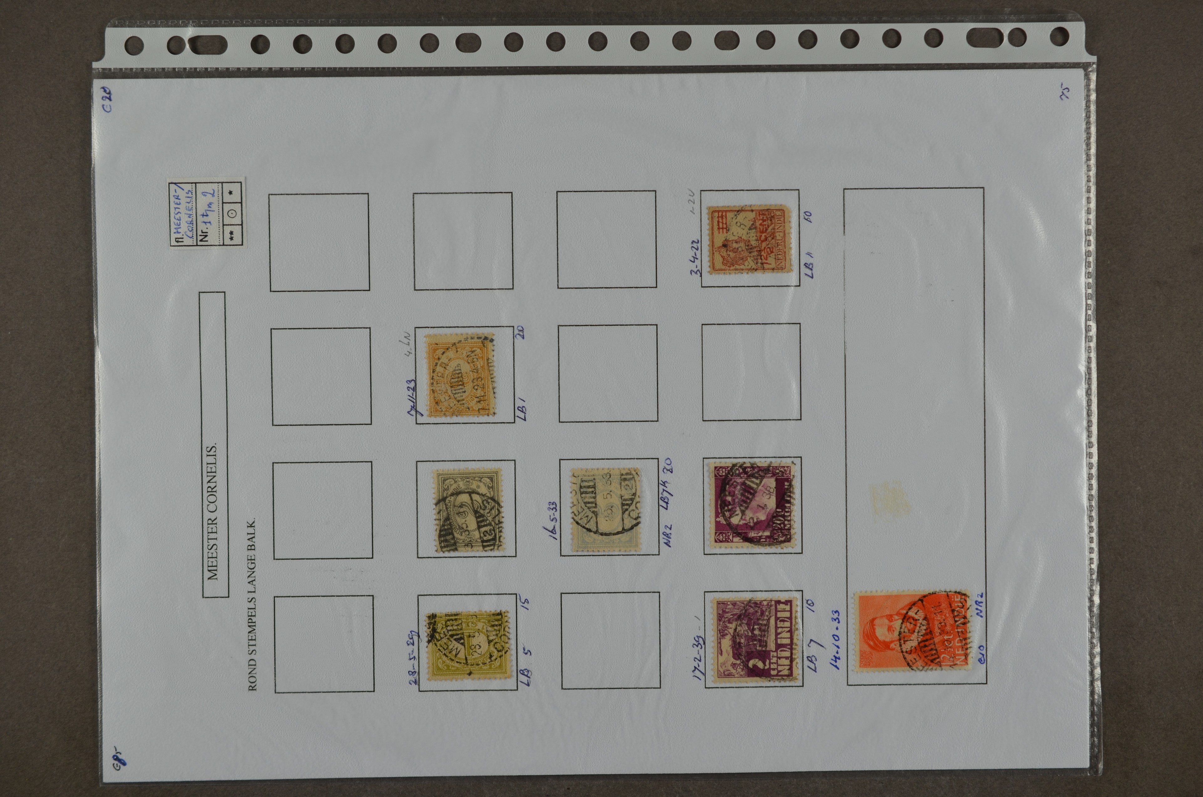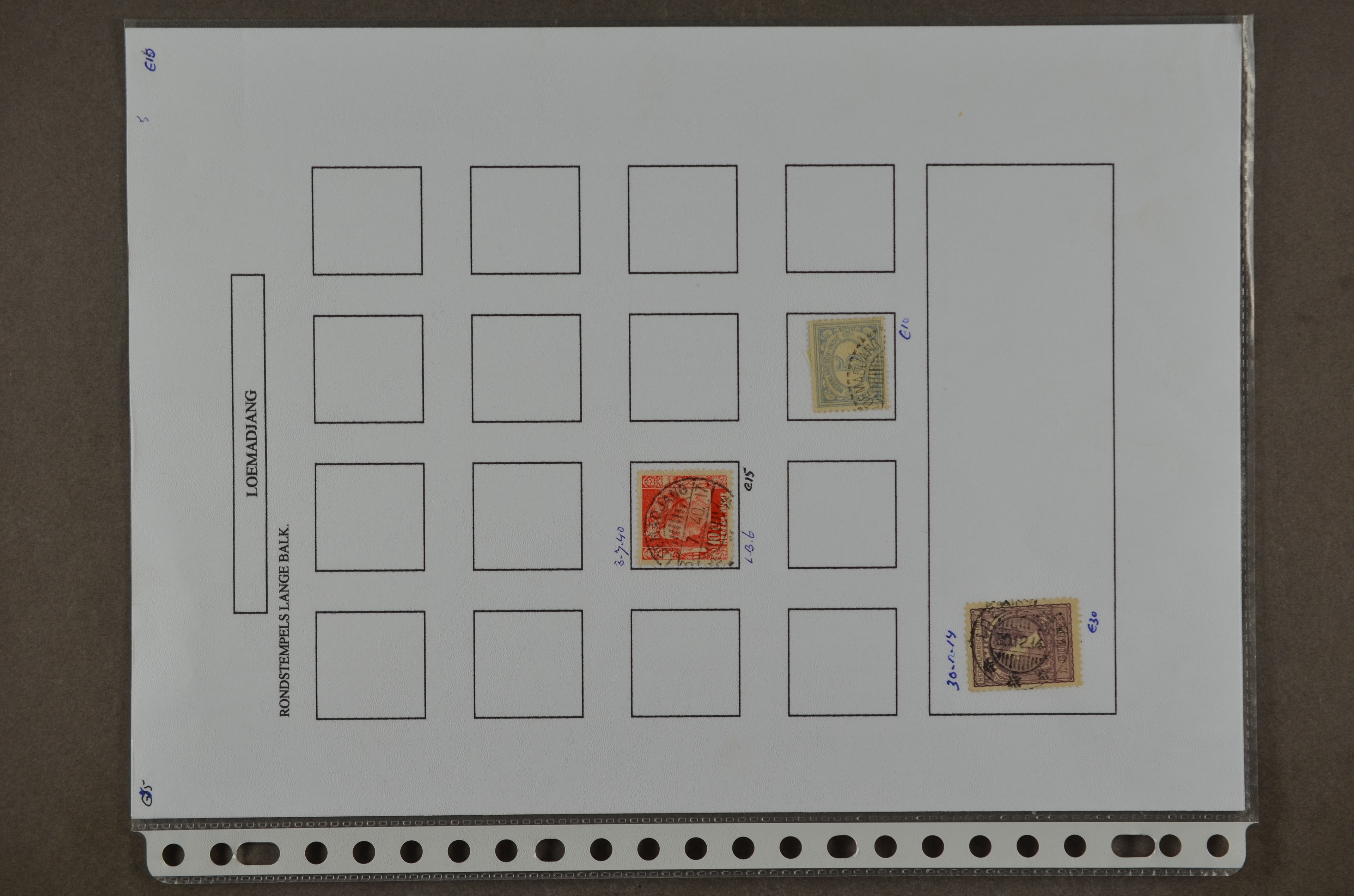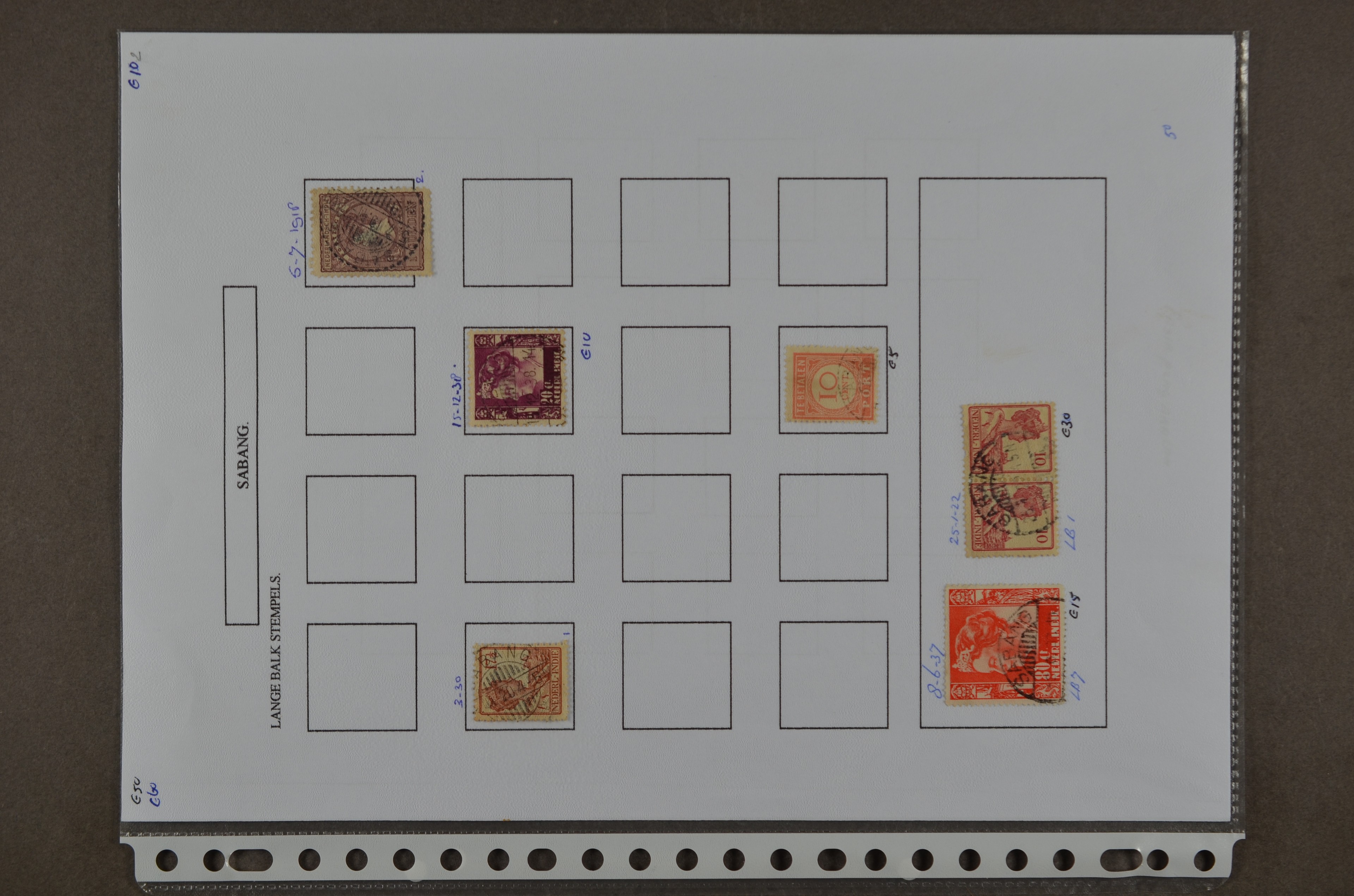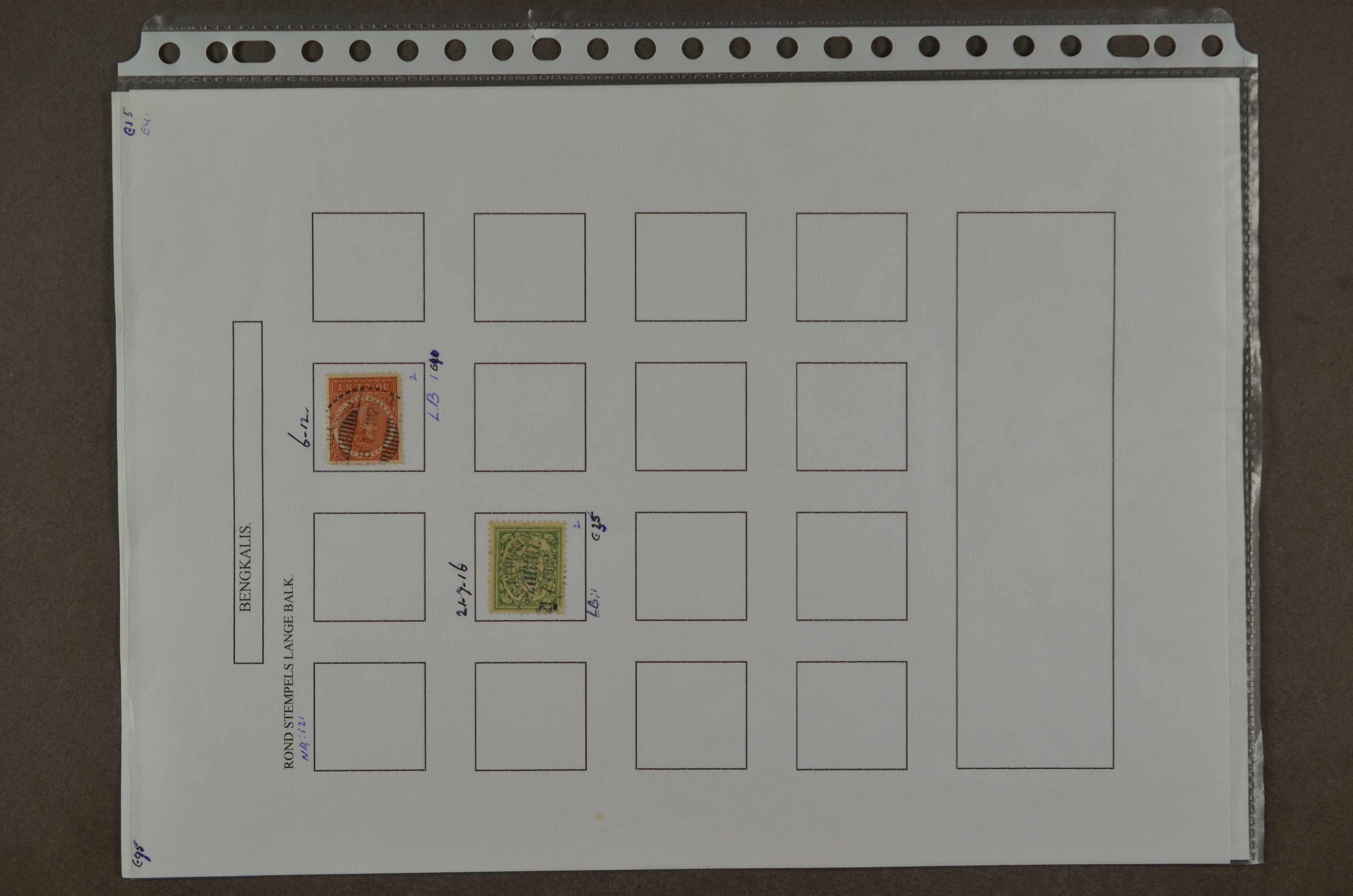 NED.- INDIË Langebalkstempels vanaf 1917, uitgebreide collectie met meerdere schaarse kantoren, verschillende typen per kantoor, veel mooie afstempelingen, ook andere typen als KB, PV1, PV2, LBnr, opgezet op bladen (w.o. door verzamelaar diverse foutief genoemde kantoornamen) in 8 ringbanden
