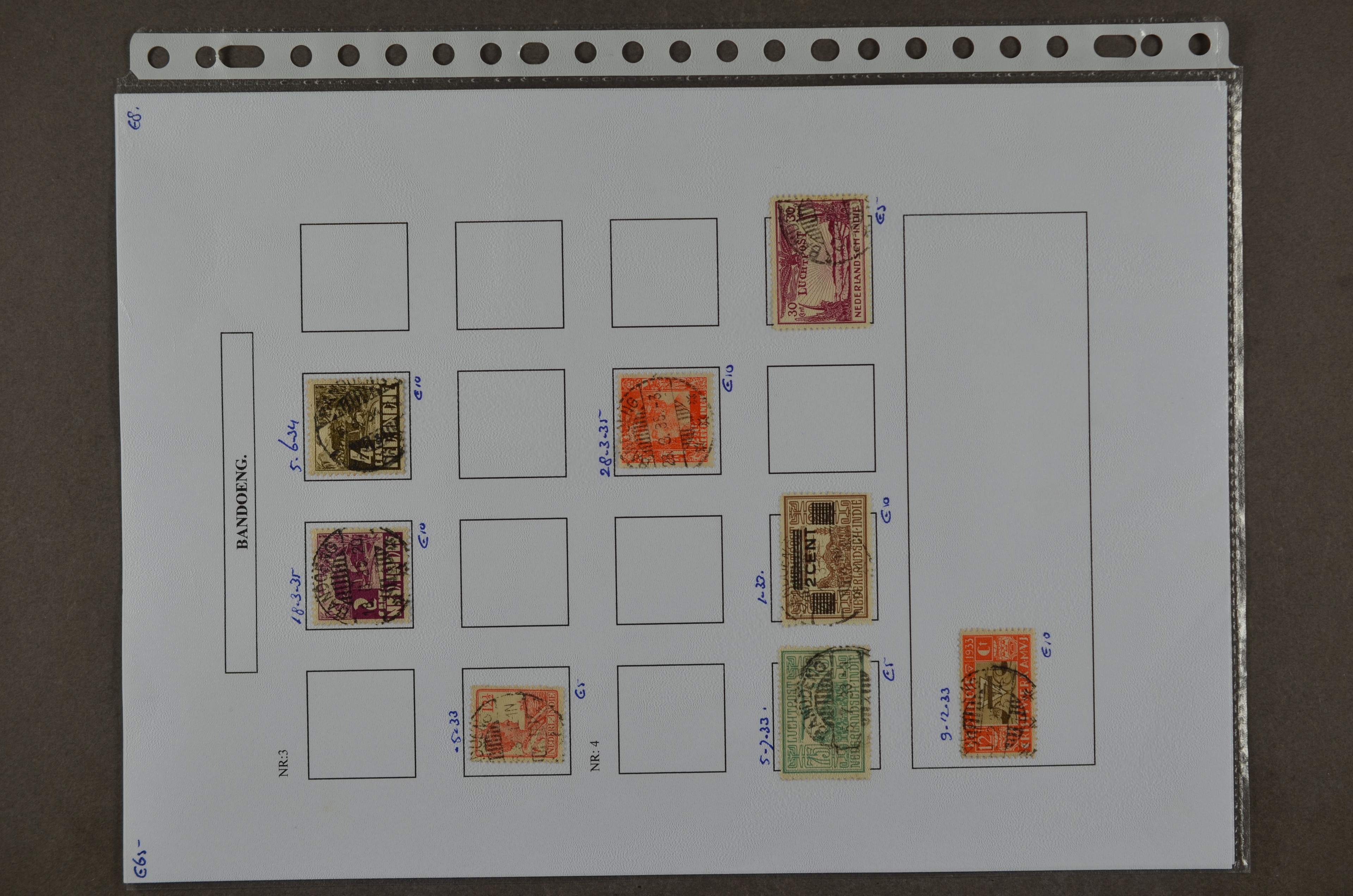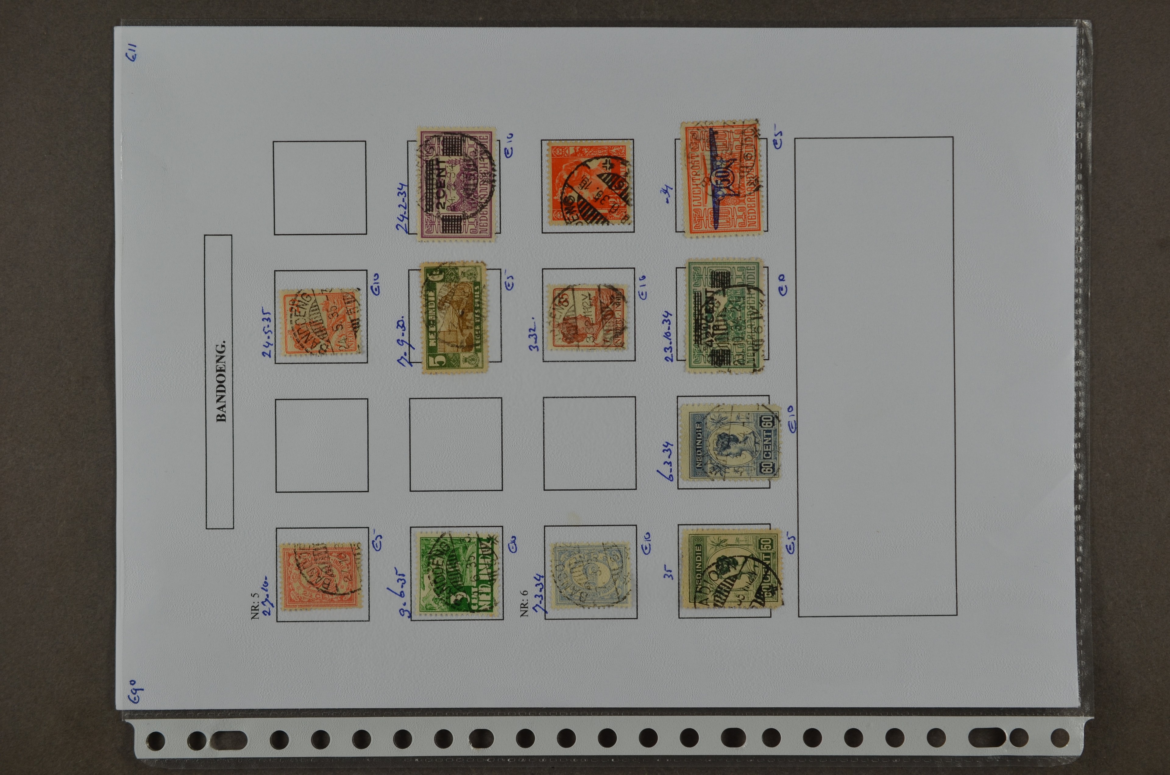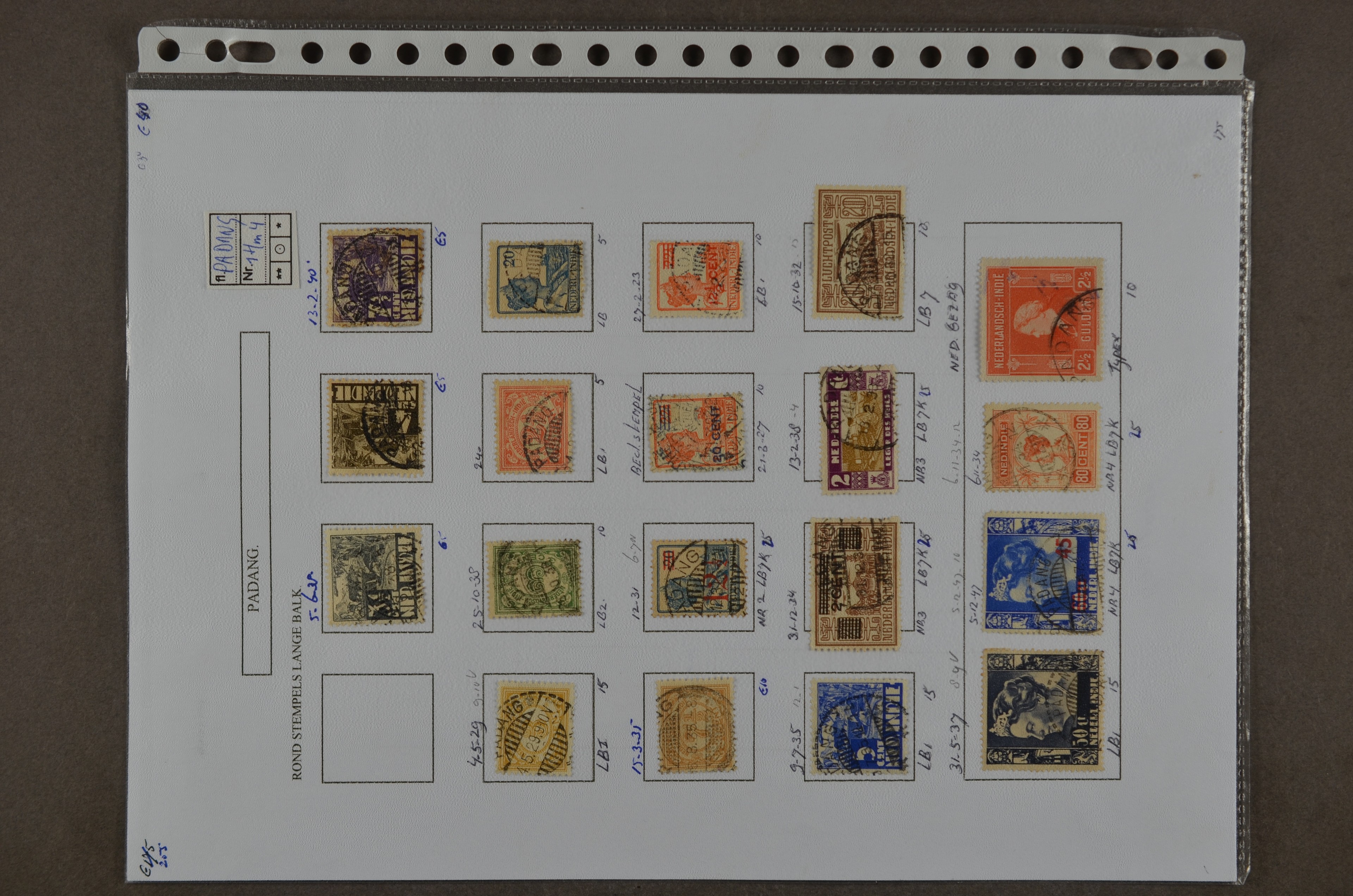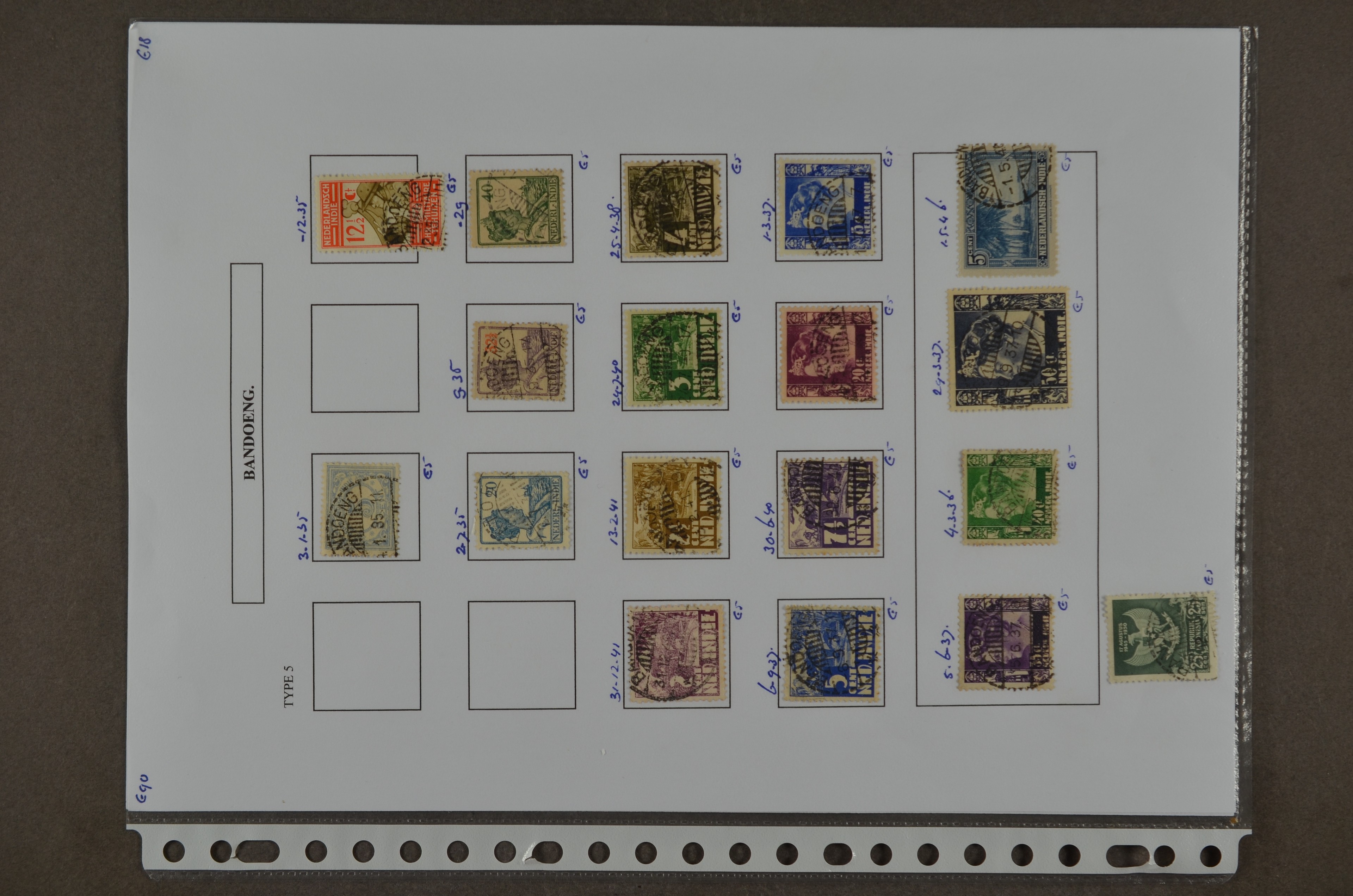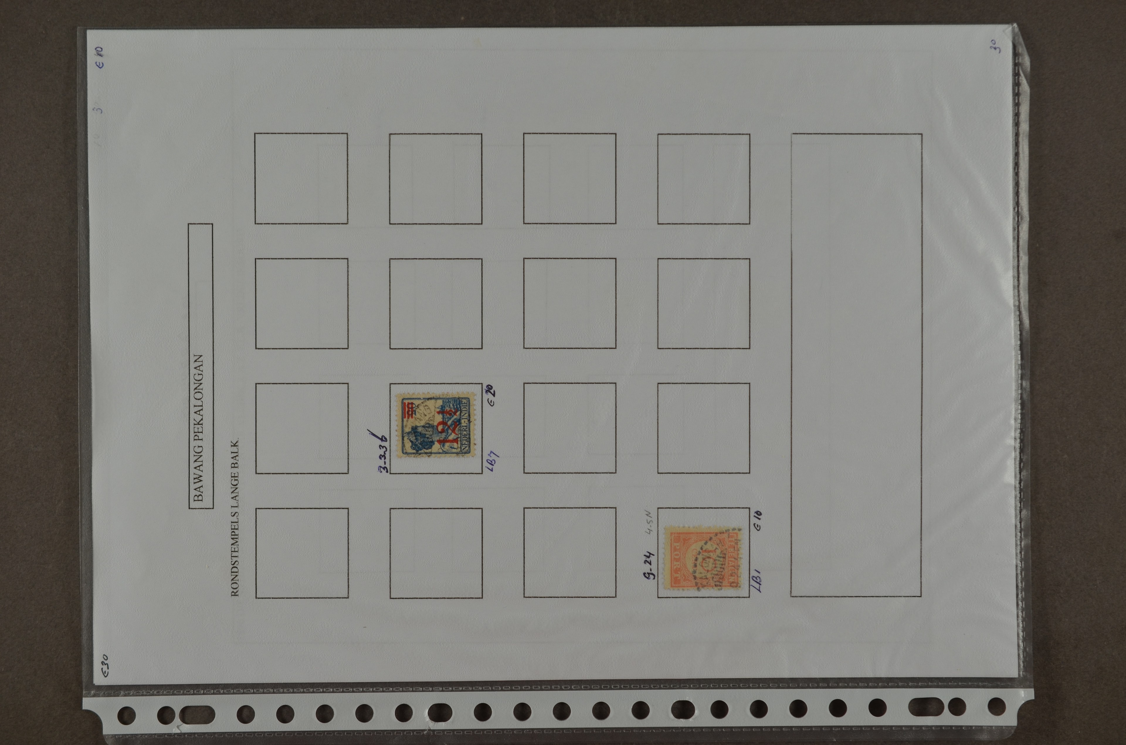 NED.- INDIË Langebalkstempels vanaf 1917, uitgebreide collectie met meerdere schaarse kantoren, verschillende typen per kantoor, veel mooie afstempelingen, ook andere typen als KB, PV1, PV2, LBnr, opgezet op bladen (w.o. door verzamelaar diverse foutief genoemde kantoornamen) in 8 ringbanden