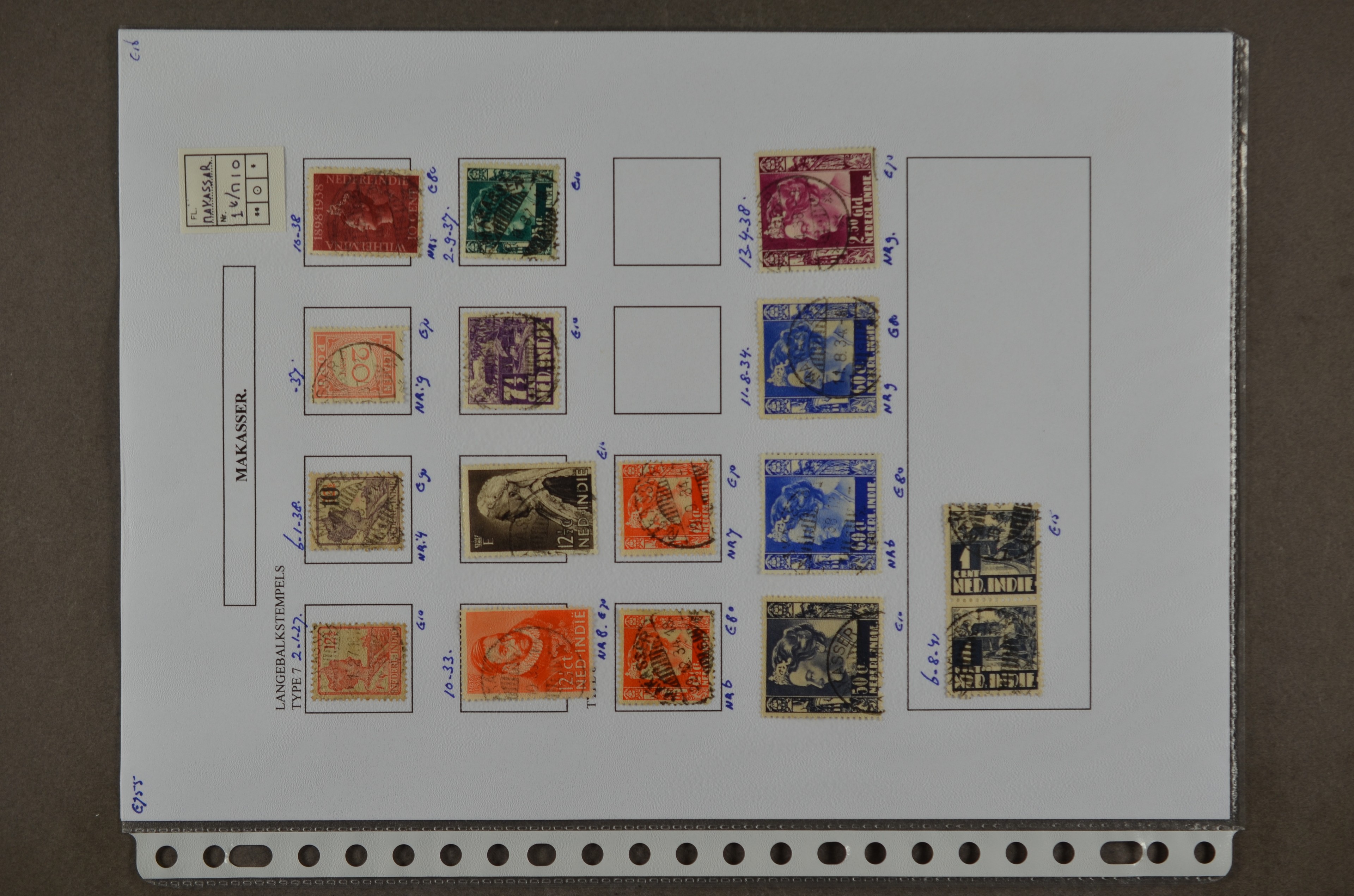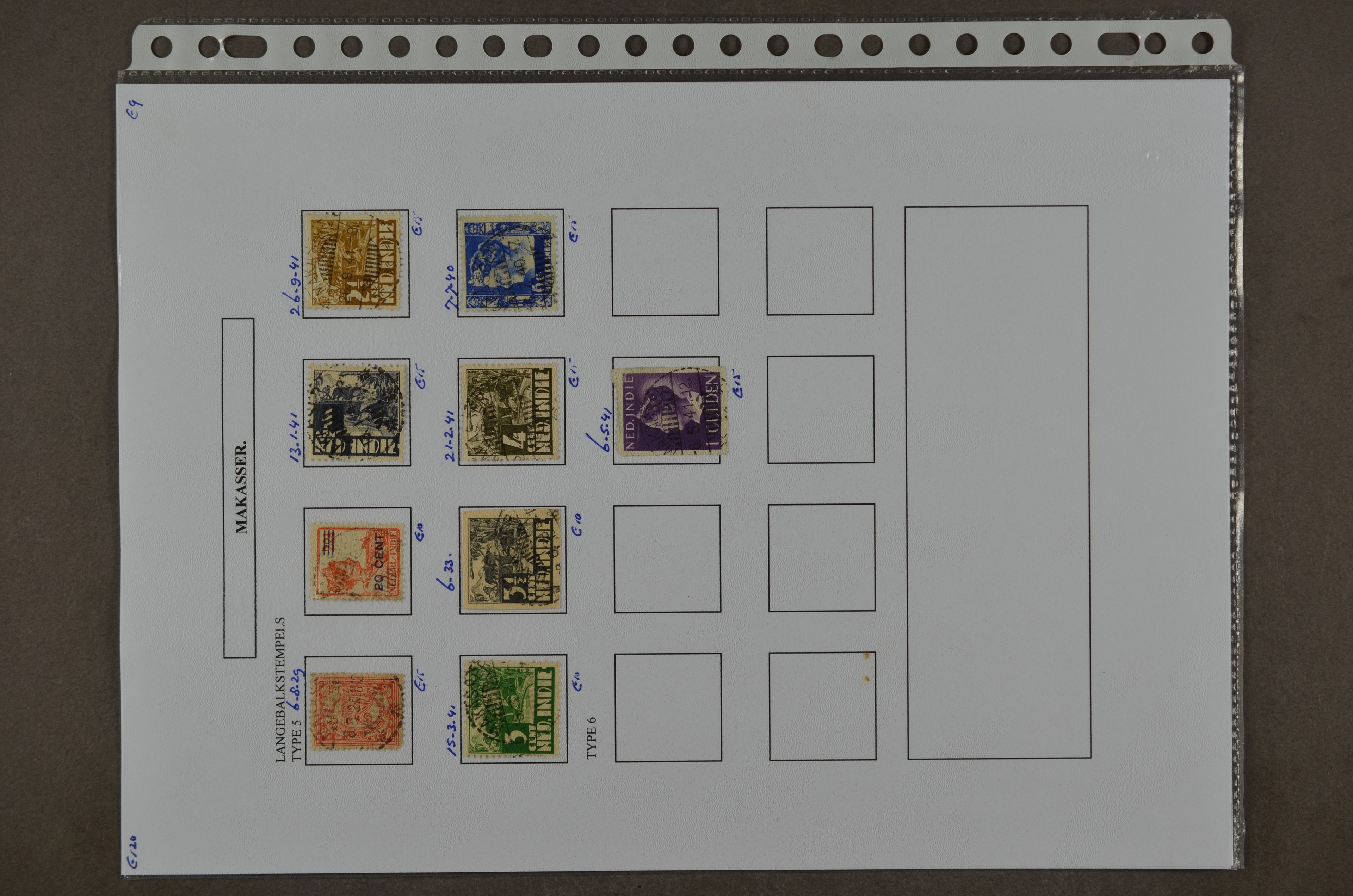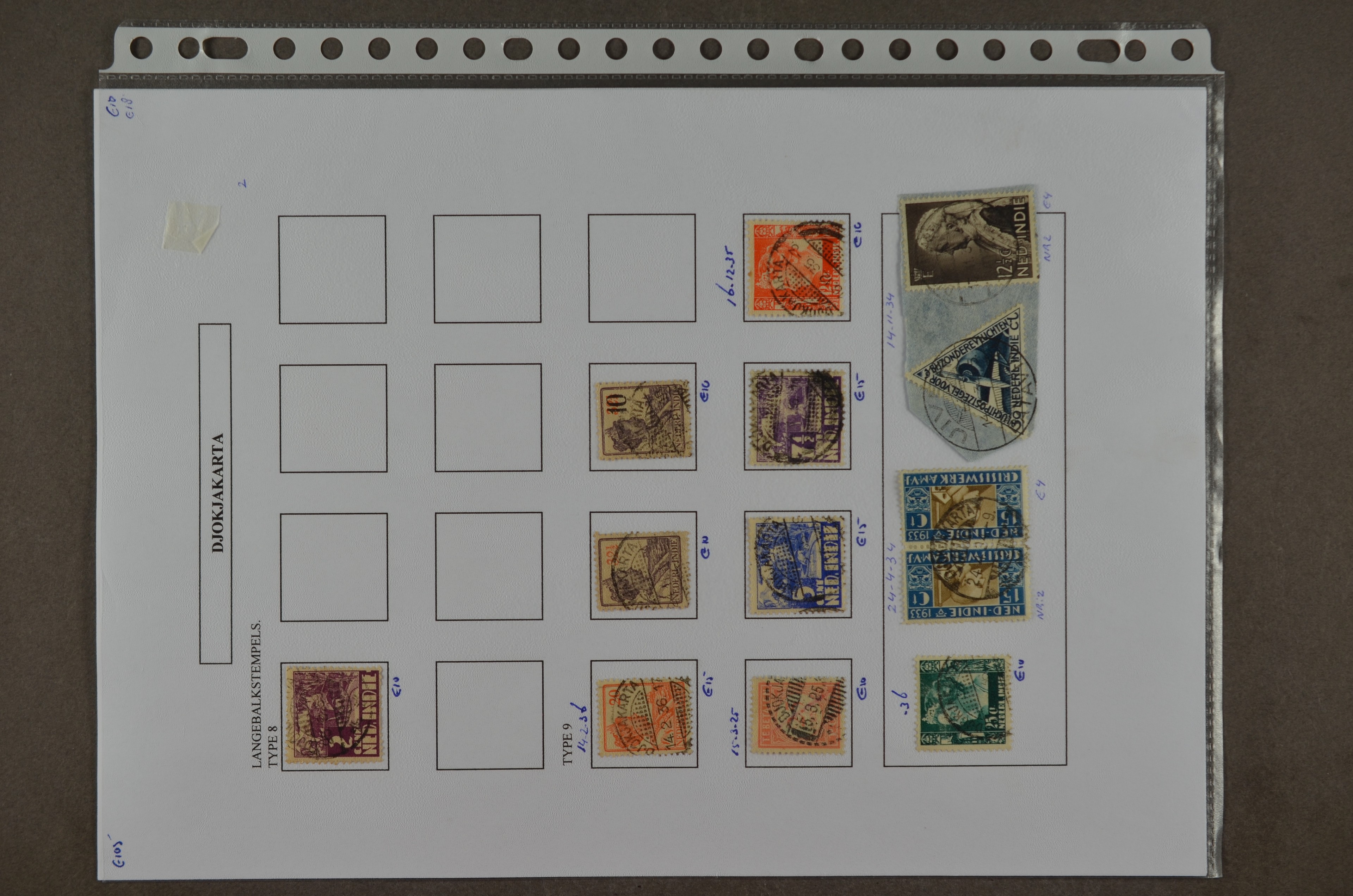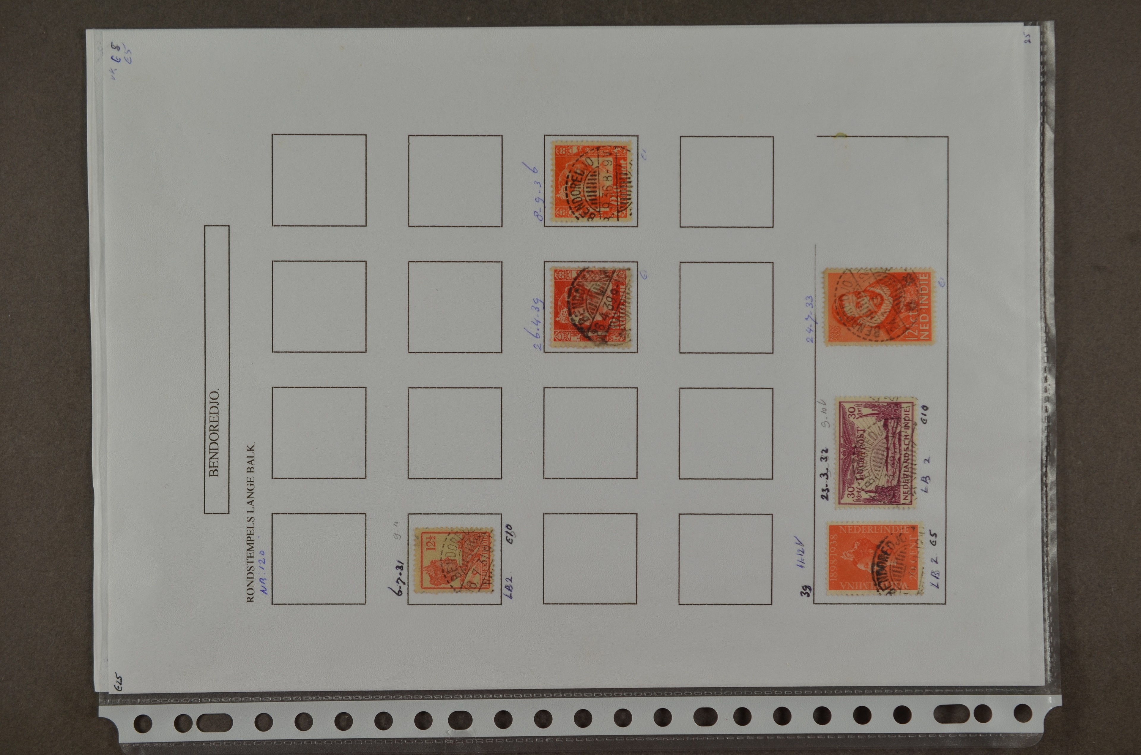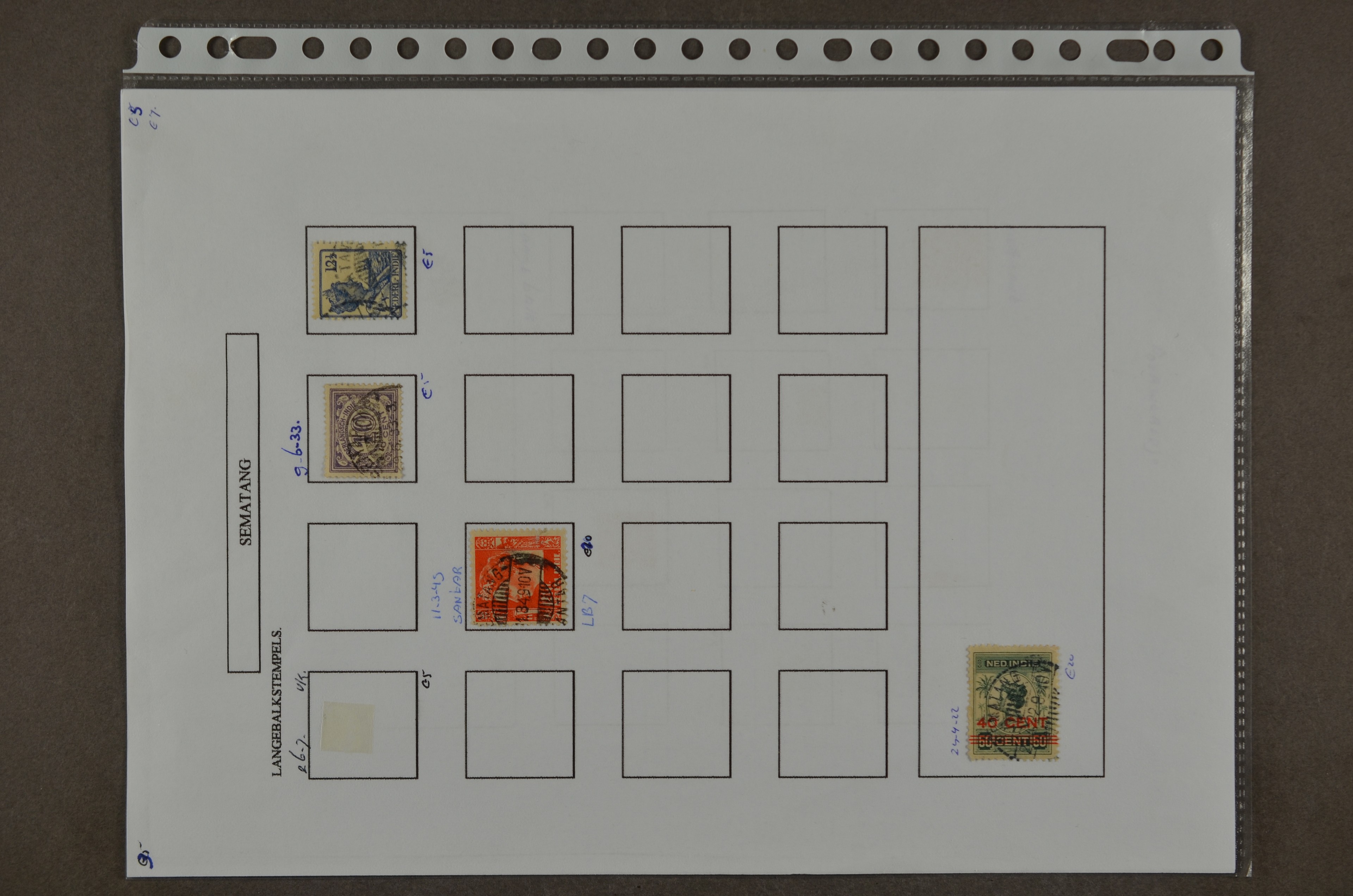 NED.- INDIË Langebalkstempels vanaf 1917, uitgebreide collectie met meerdere schaarse kantoren, verschillende typen per kantoor, veel mooie afstempelingen, ook andere typen als KB, PV1, PV2, LBnr, opgezet op bladen (w.o. door verzamelaar diverse foutief genoemde kantoornamen) in 8 ringbanden