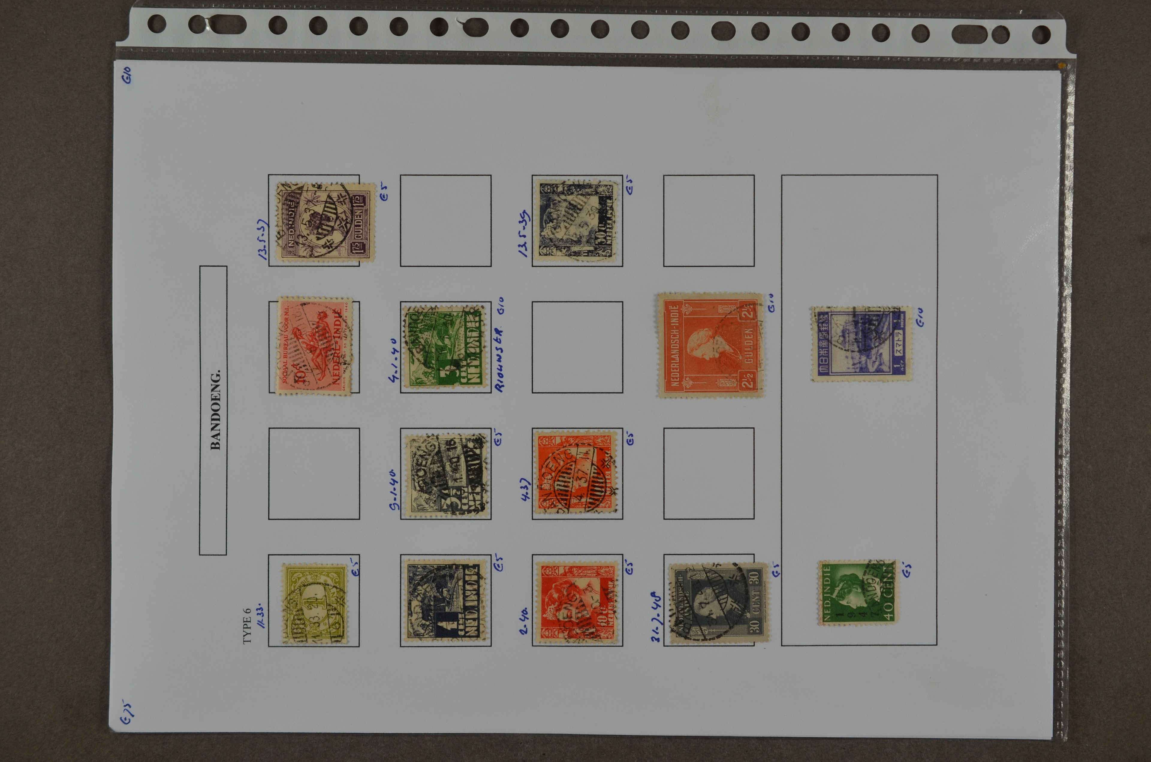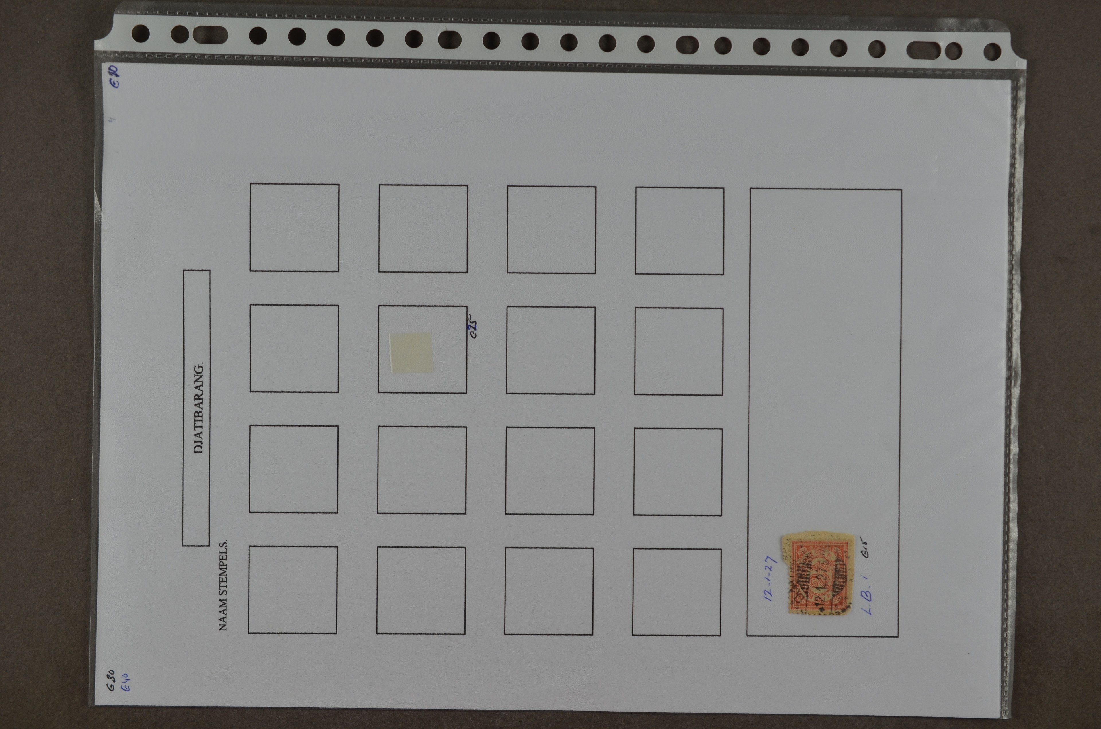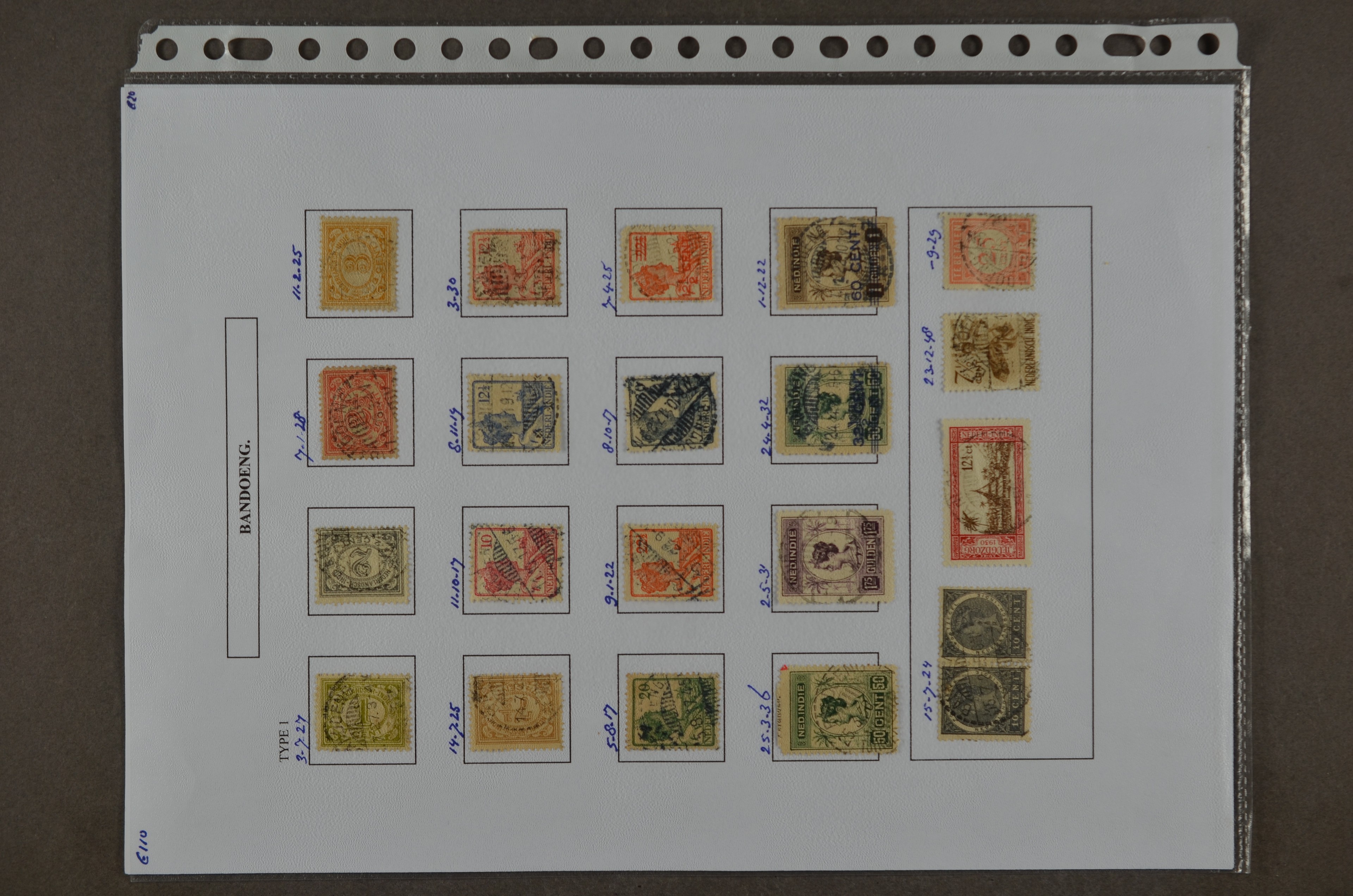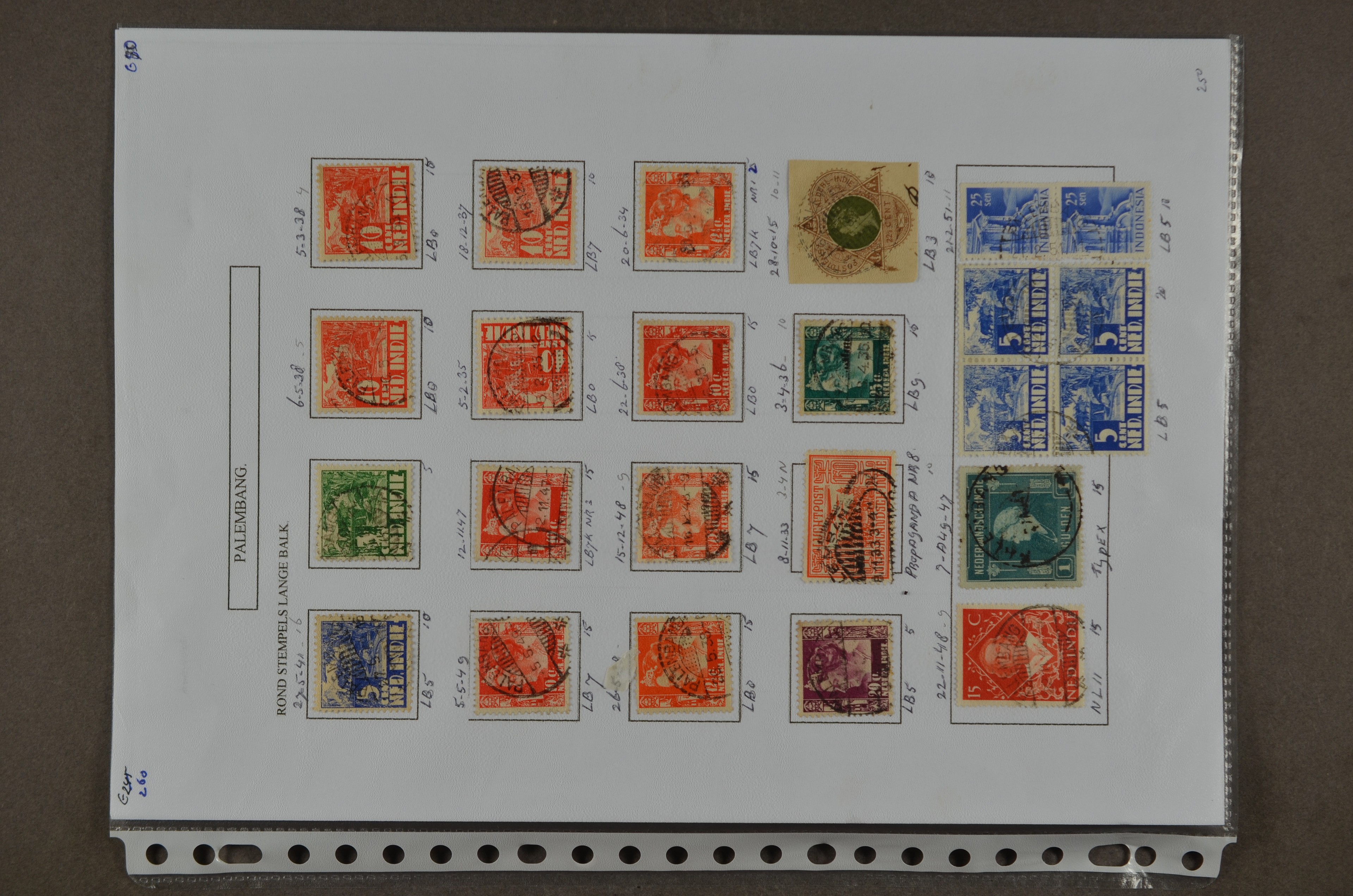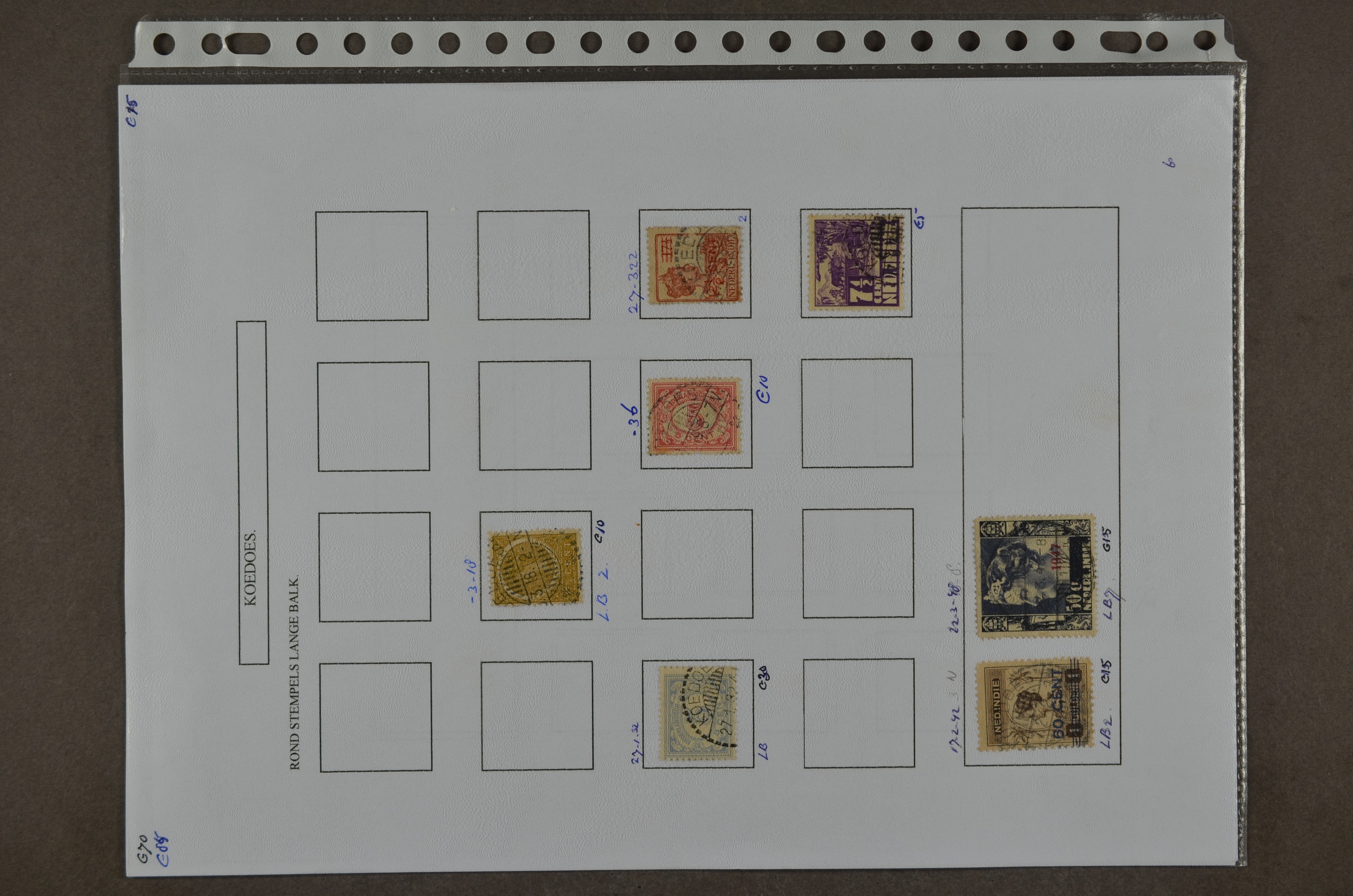 NED.- INDIË Langebalkstempels vanaf 1917, uitgebreide collectie met meerdere schaarse kantoren, verschillende typen per kantoor, veel mooie afstempelingen, ook andere typen als KB, PV1, PV2, LBnr, opgezet op bladen (w.o. door verzamelaar diverse foutief genoemde kantoornamen) in 8 ringbanden