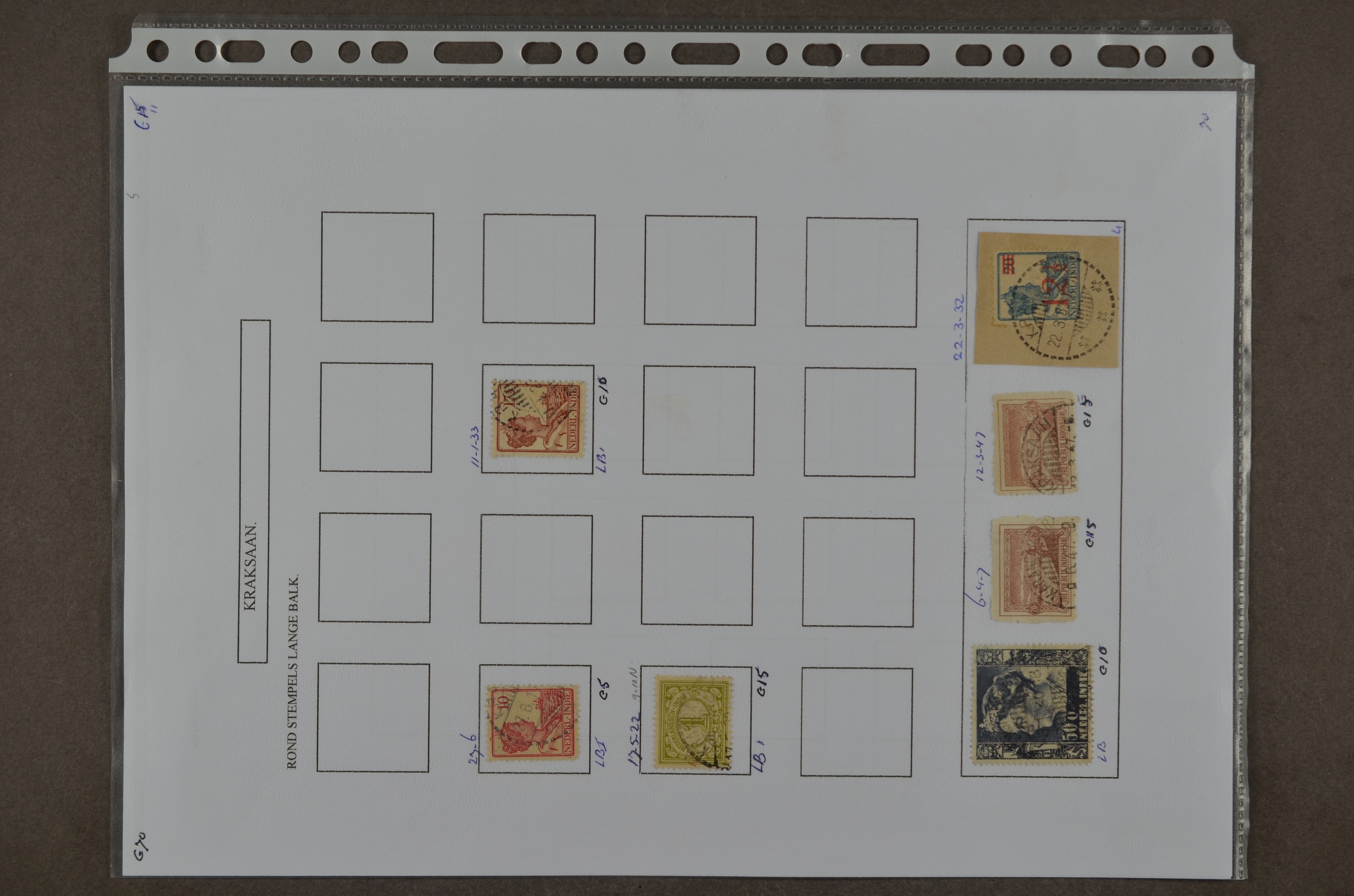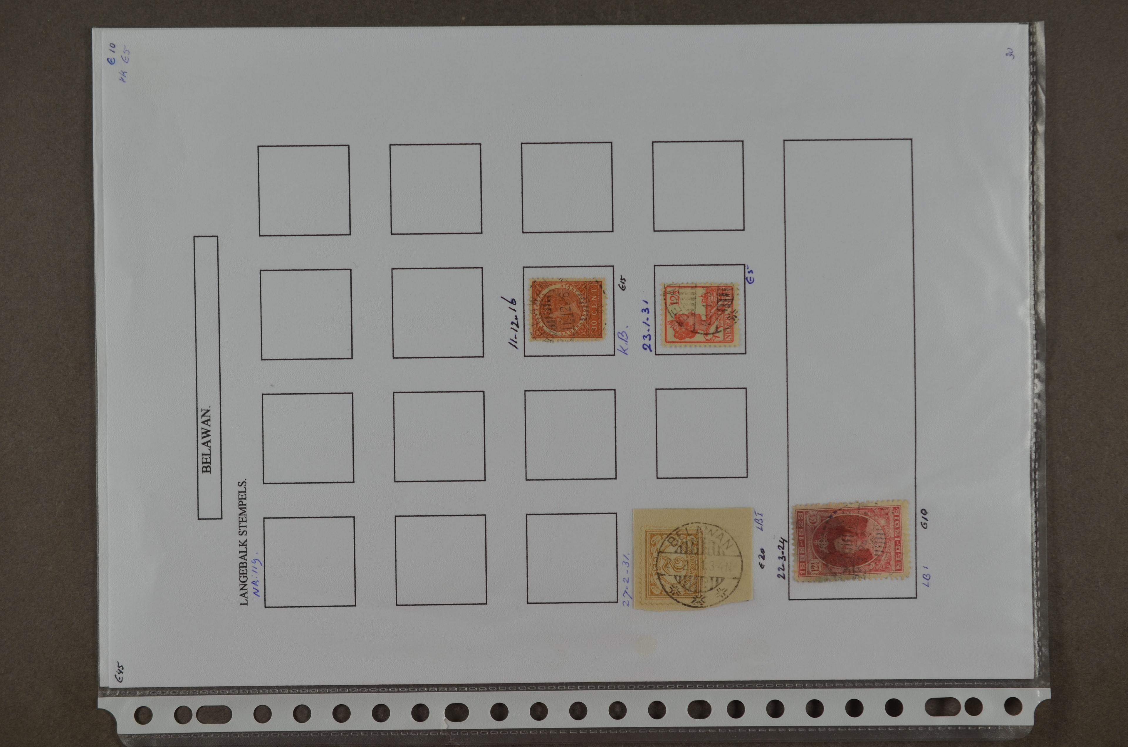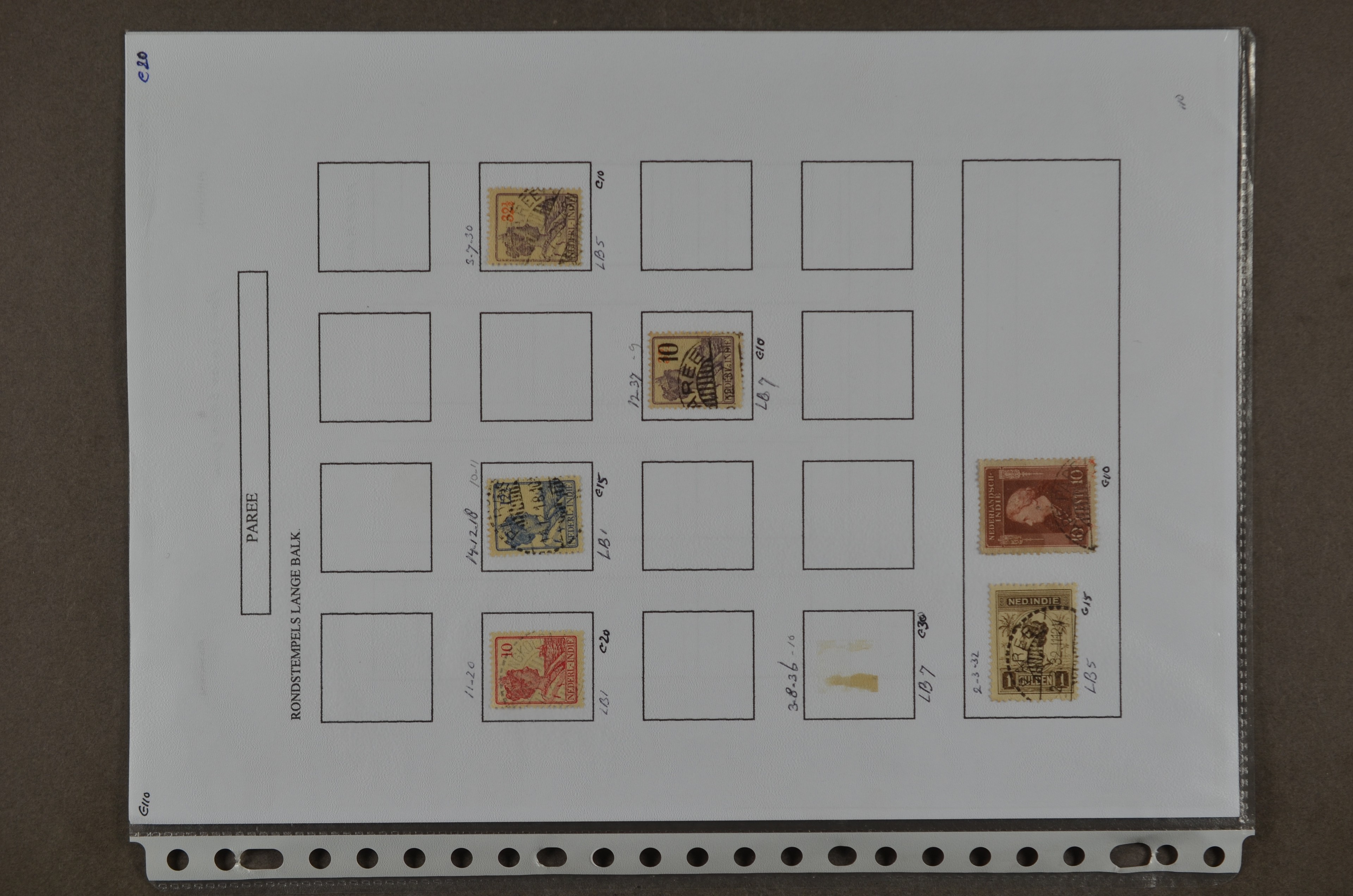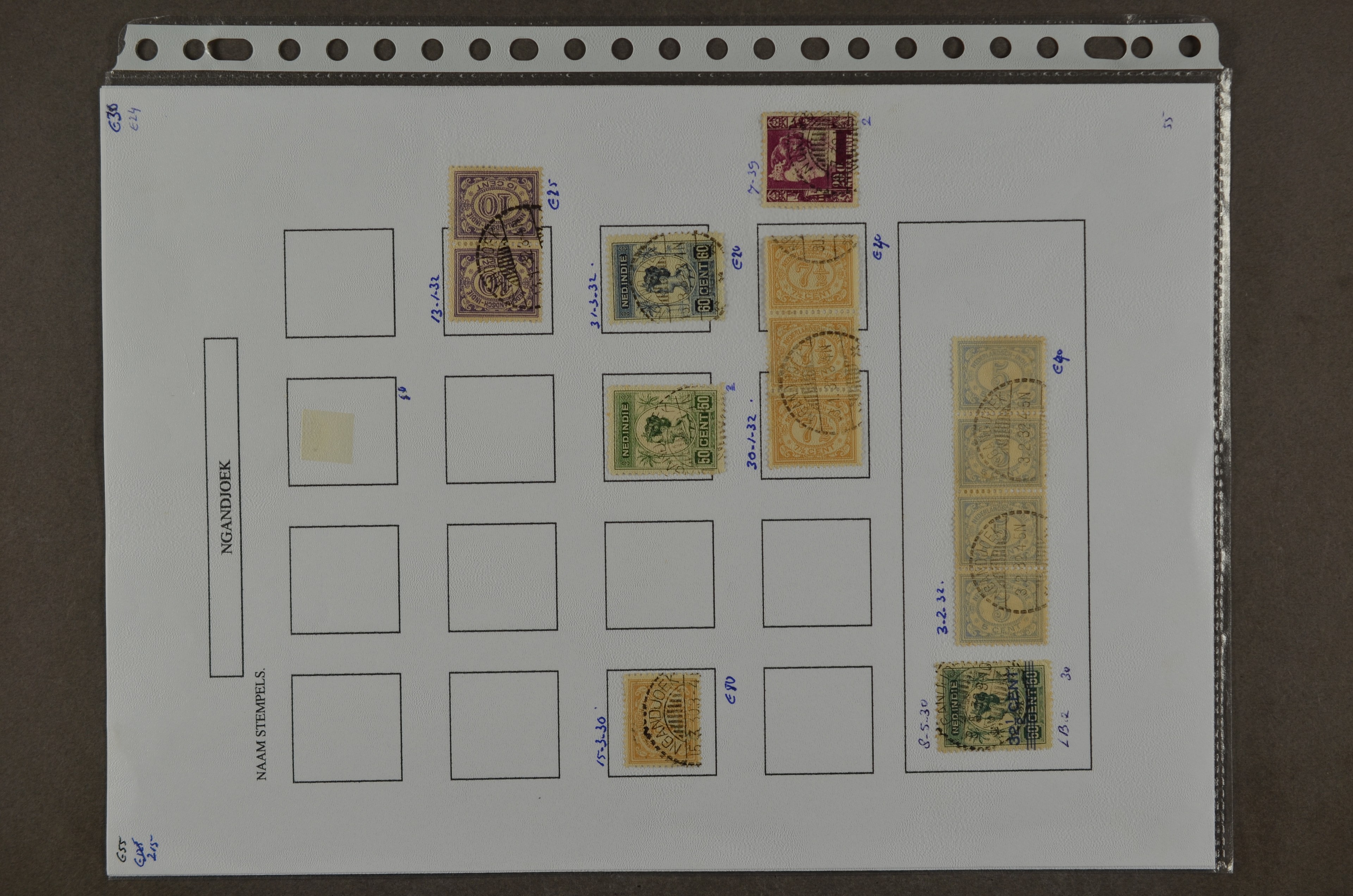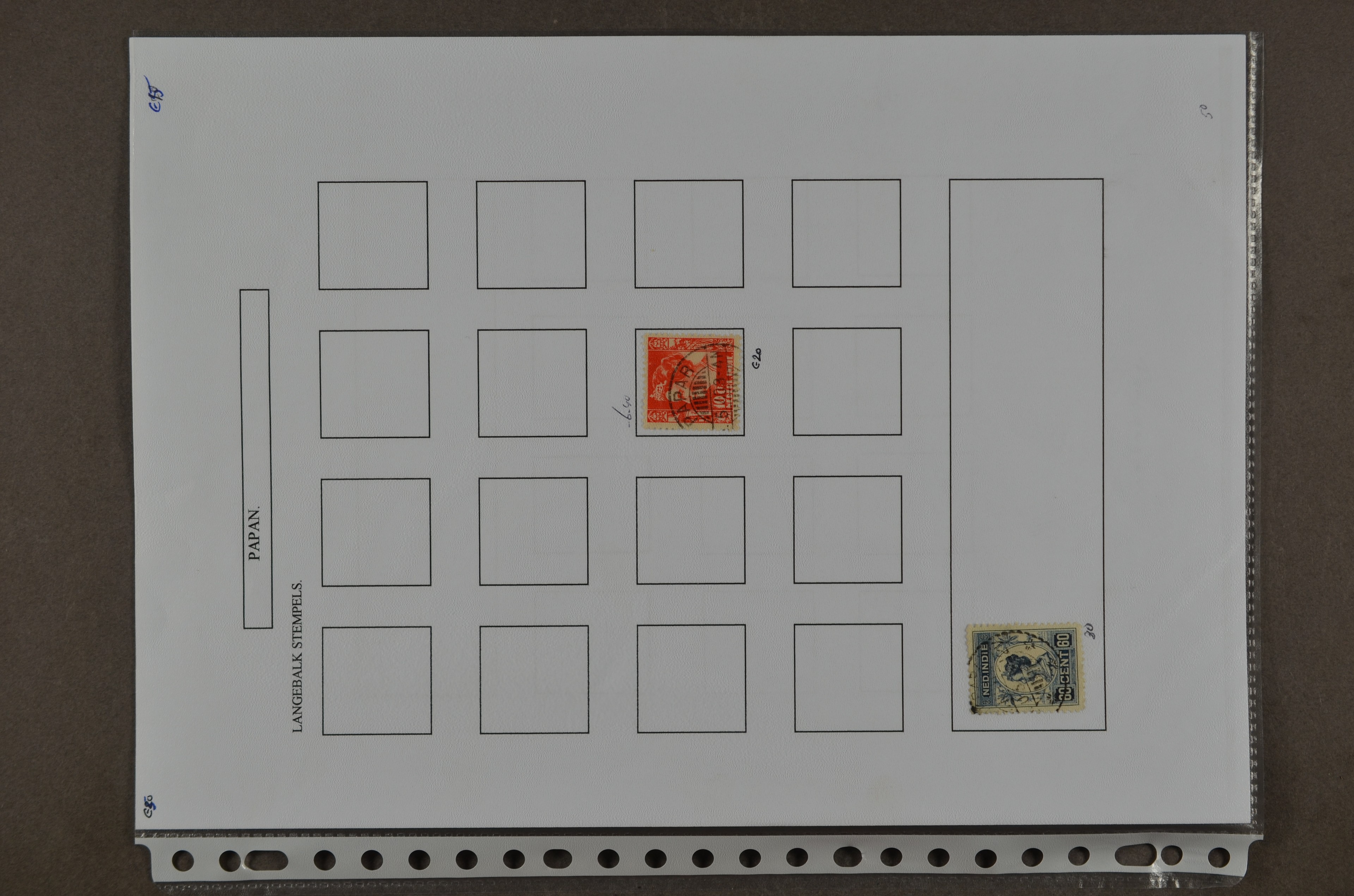 NED.- INDIË Langebalkstempels vanaf 1917, uitgebreide collectie met meerdere schaarse kantoren, verschillende typen per kantoor, veel mooie afstempelingen, ook andere typen als KB, PV1, PV2, LBnr, opgezet op bladen (w.o. door verzamelaar diverse foutief genoemde kantoornamen) in 8 ringbanden
