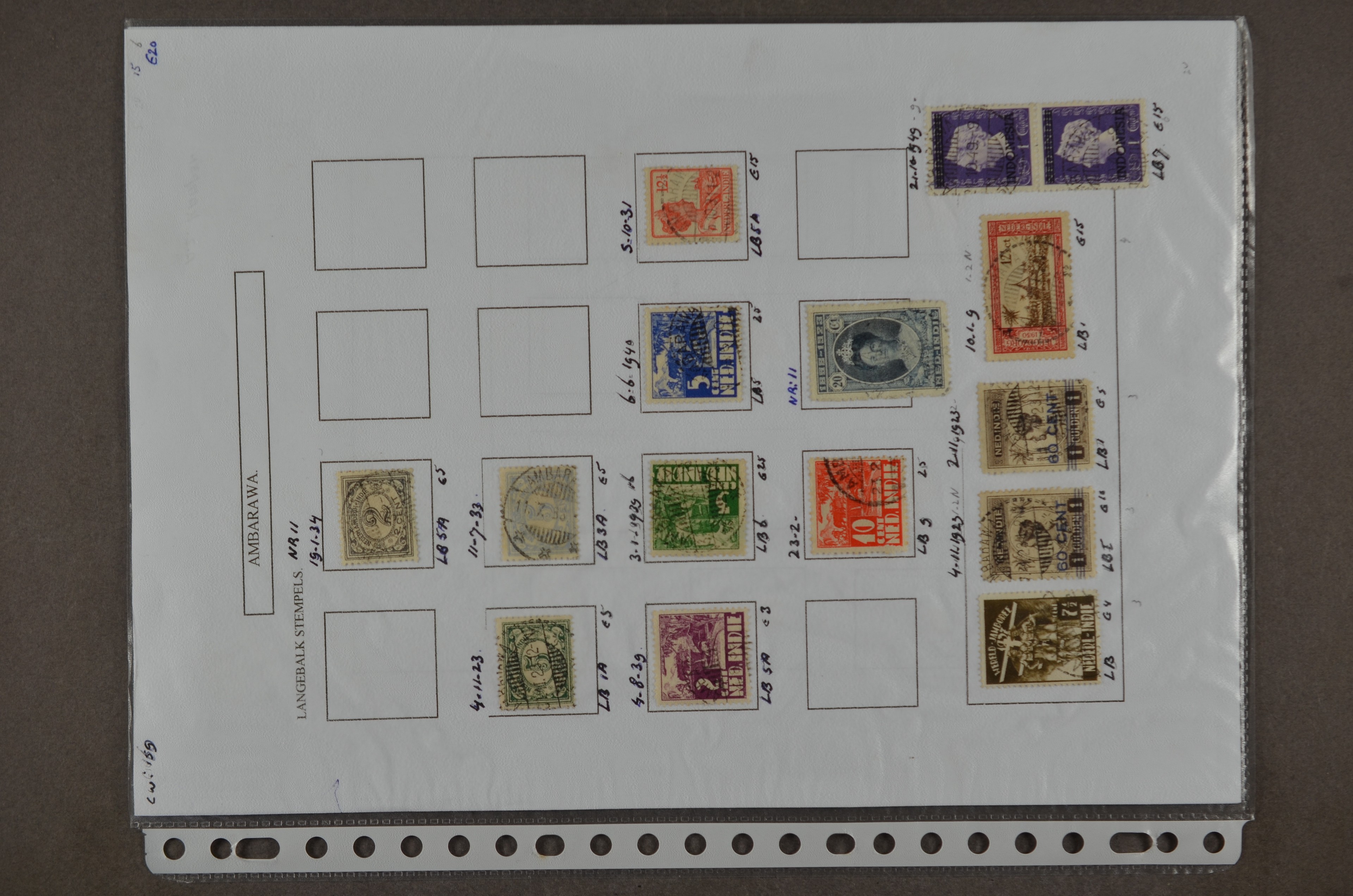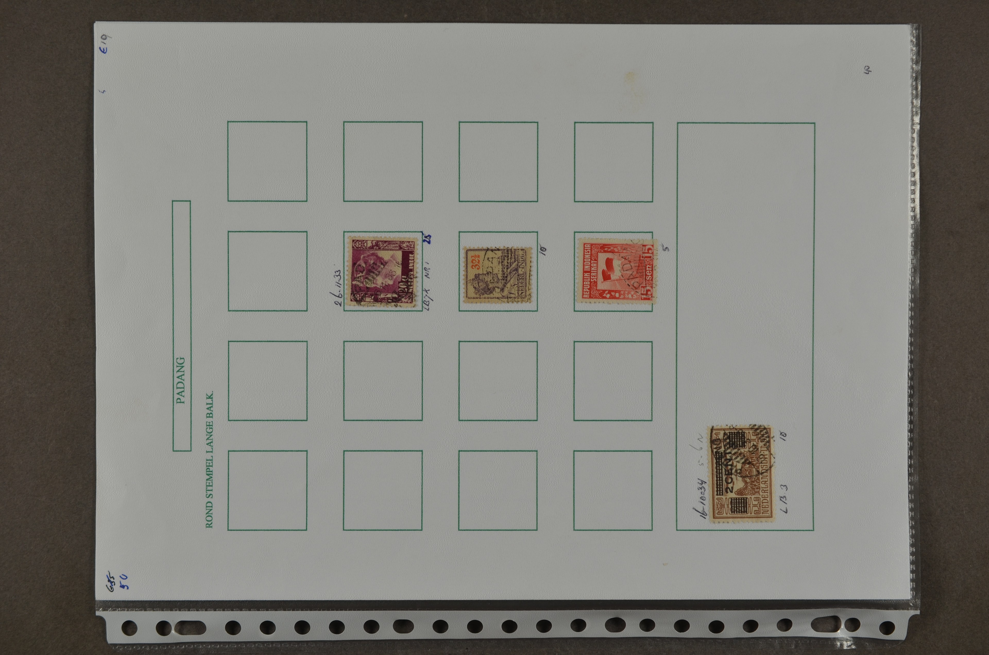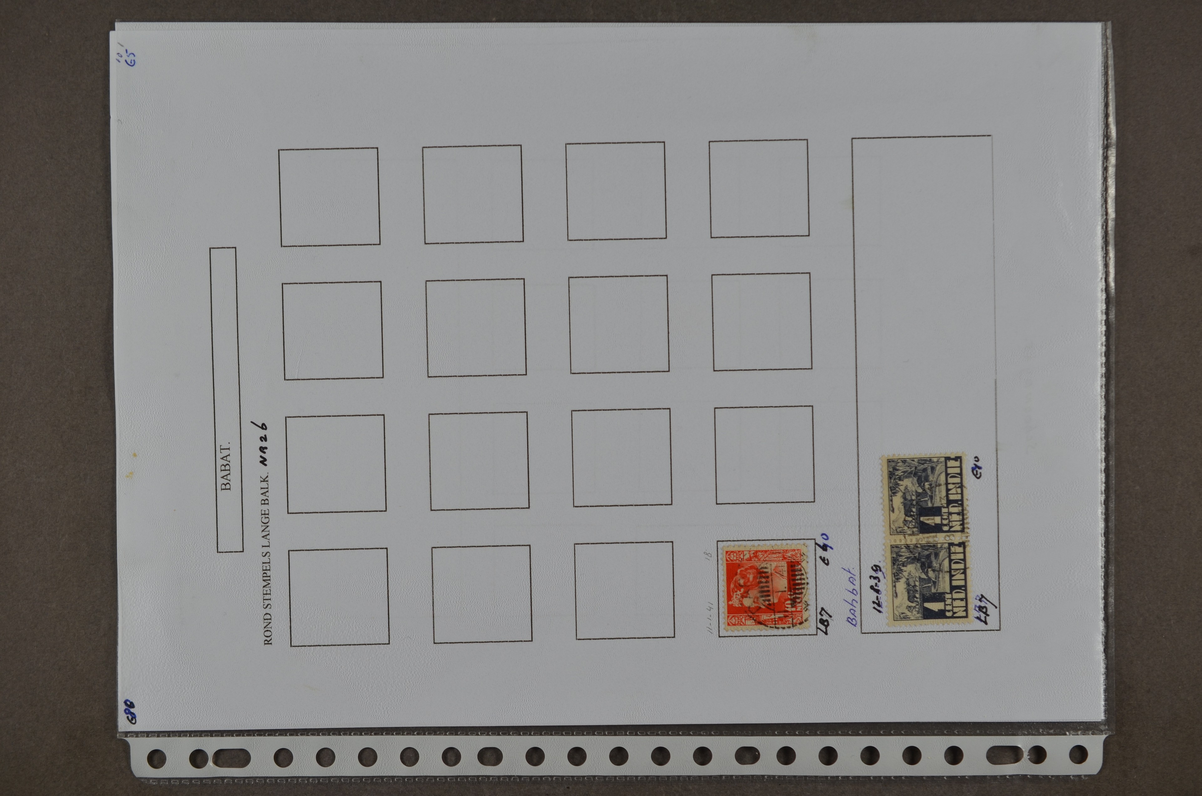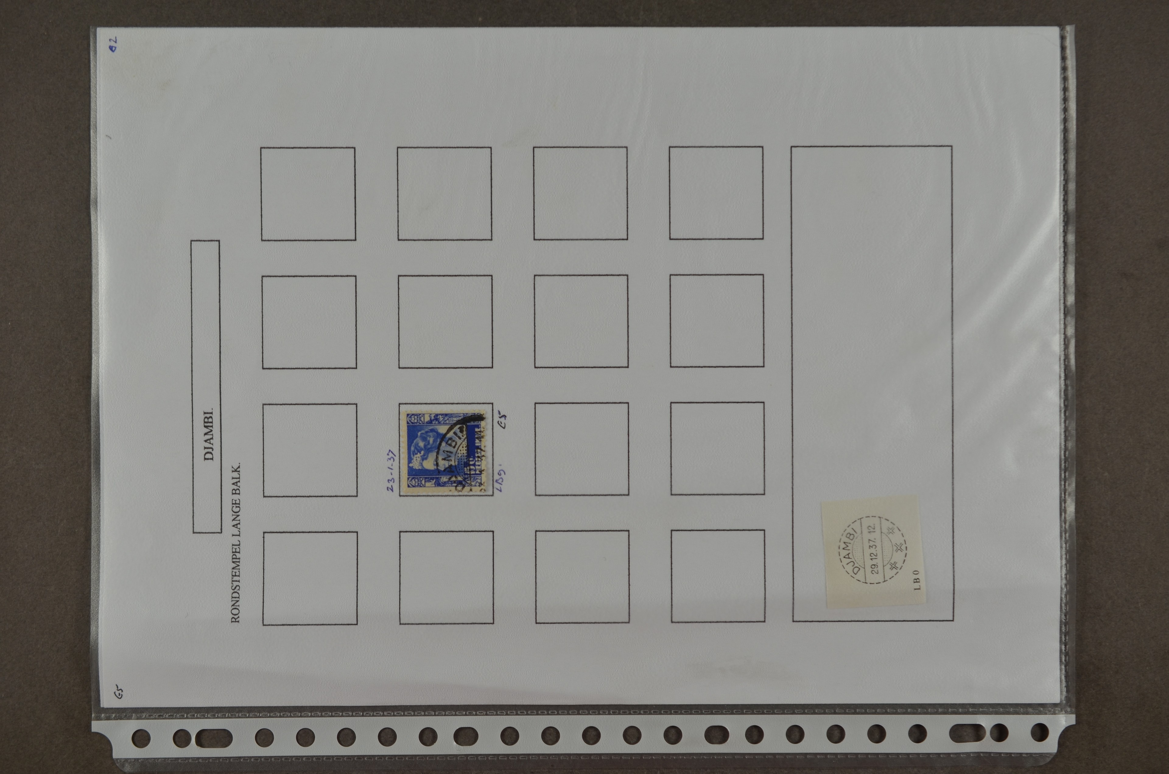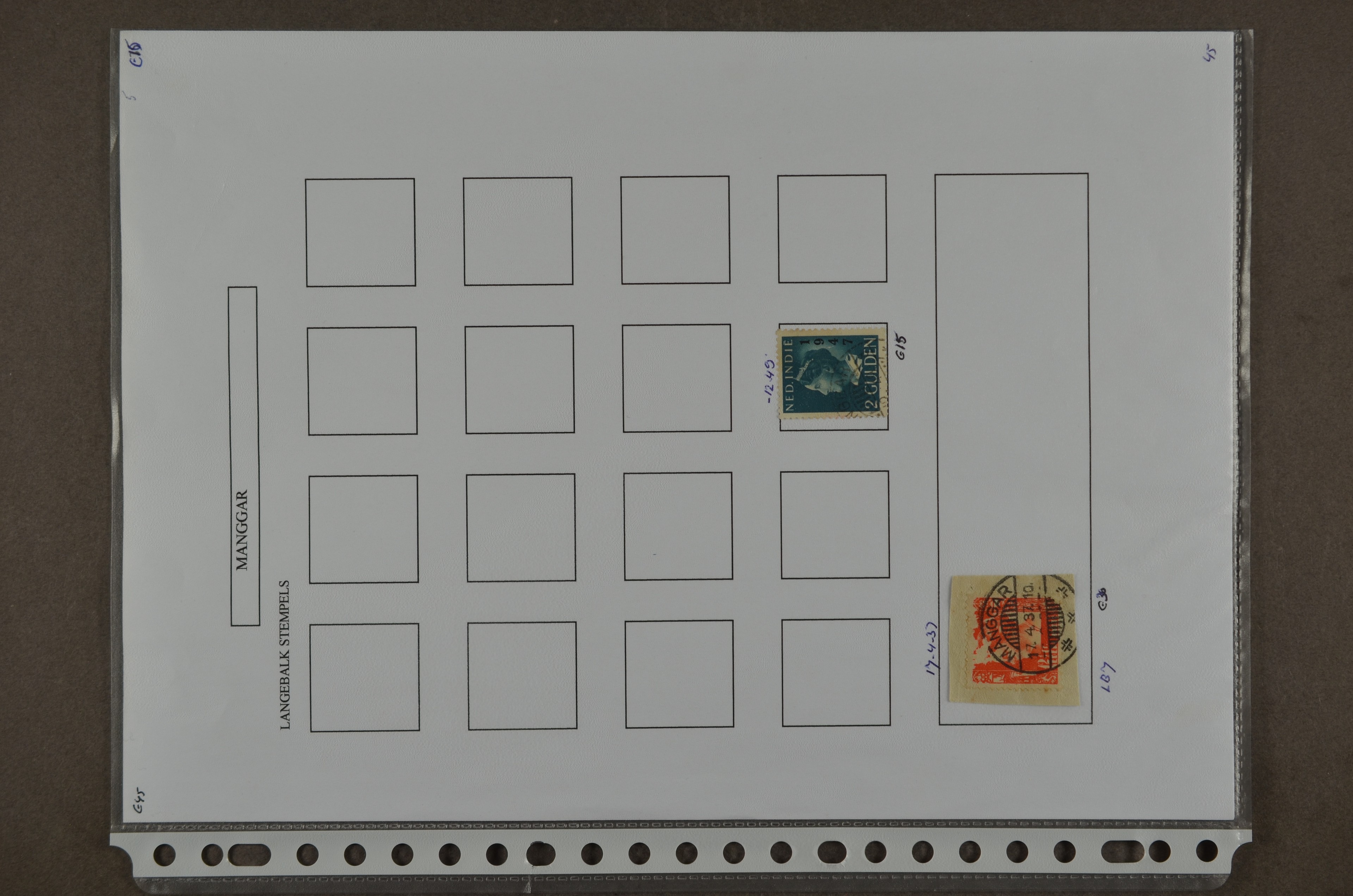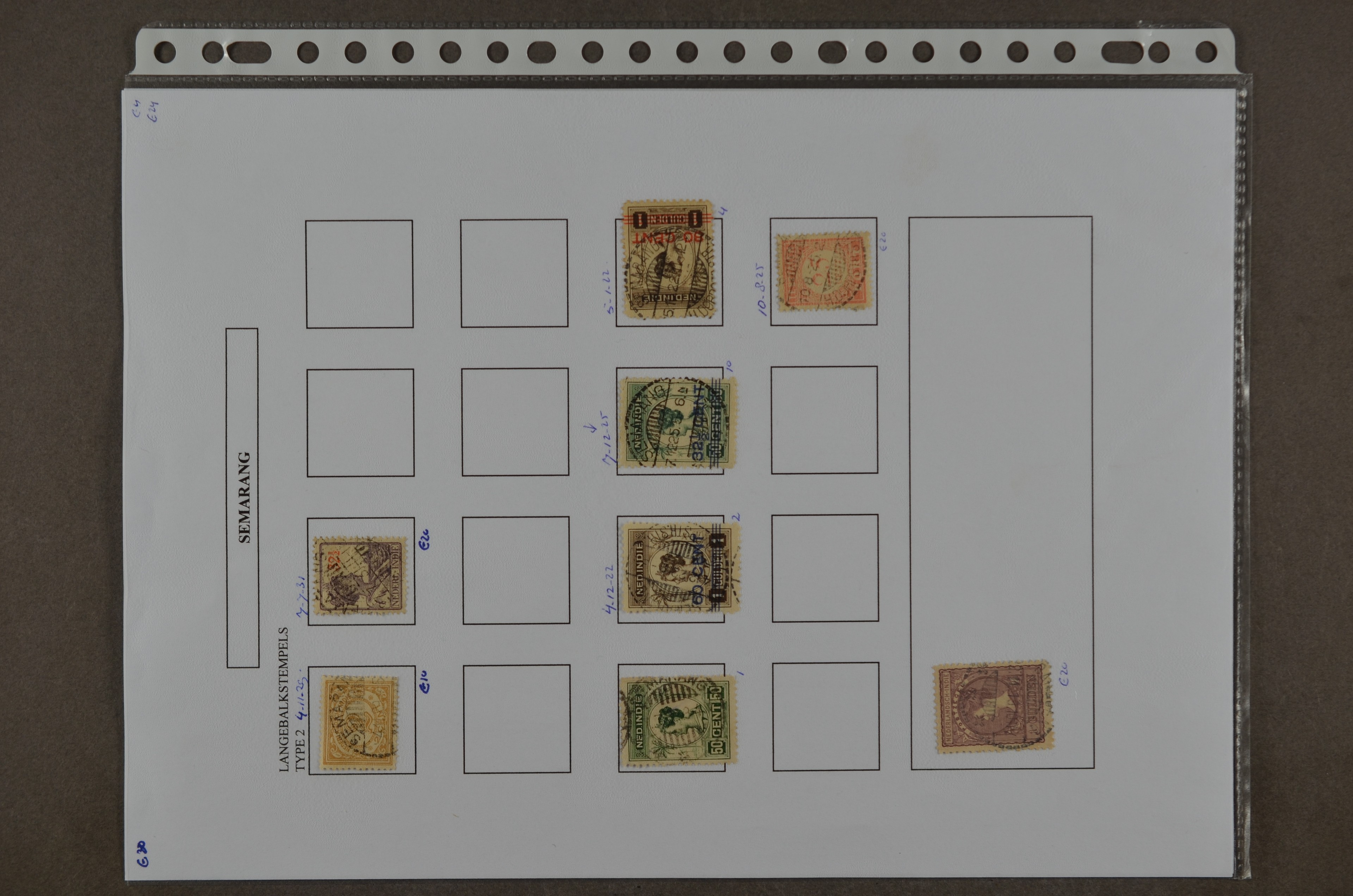 NED.- INDIË Langebalkstempels vanaf 1917, uitgebreide collectie met meerdere schaarse kantoren, verschillende typen per kantoor, veel mooie afstempelingen, ook andere typen als KB, PV1, PV2, LBnr, opgezet op bladen (w.o. door verzamelaar diverse foutief genoemde kantoornamen) in 8 ringbanden
