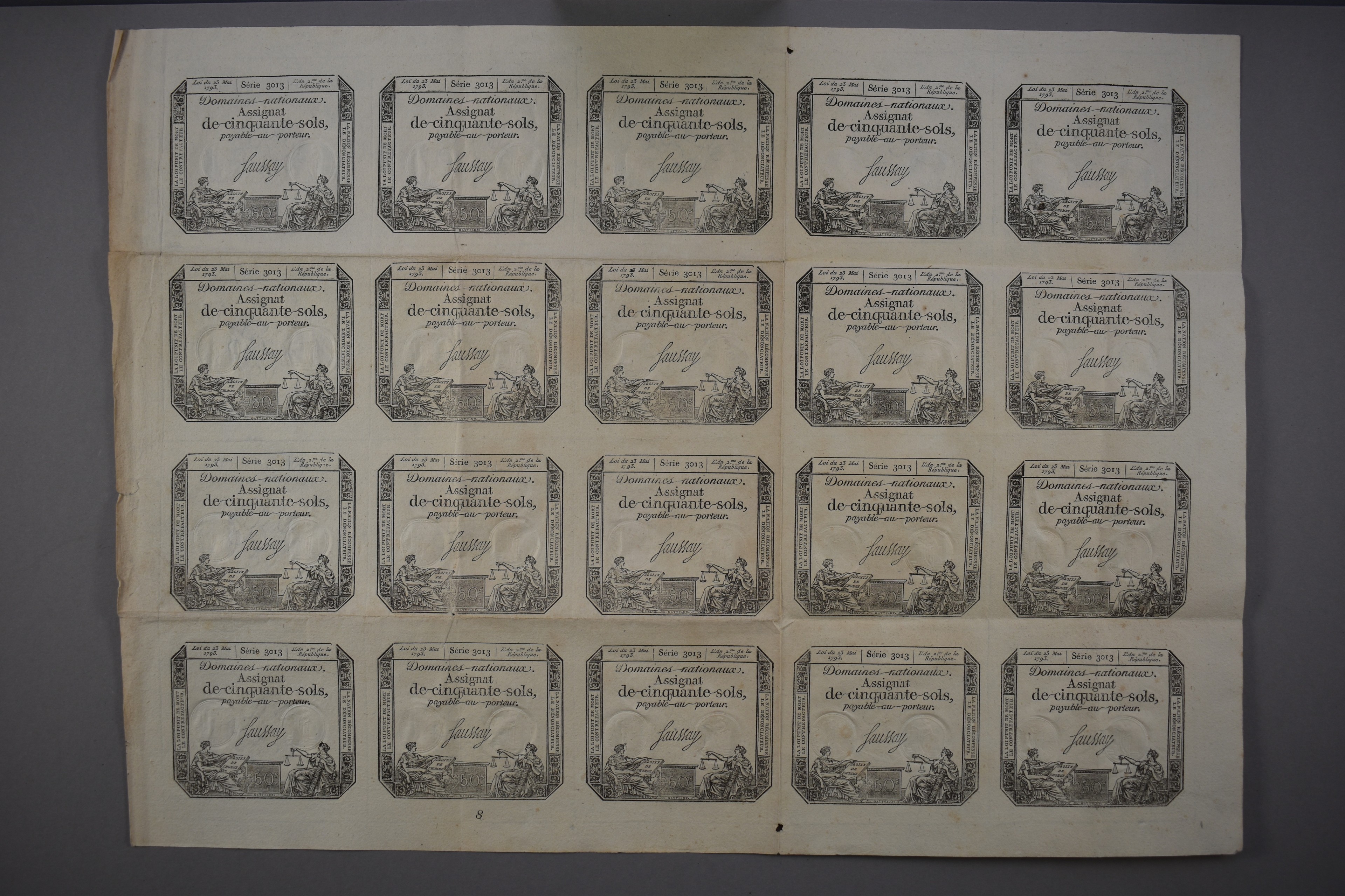 FRENCH Assignates, four complete unused sheets from which two sheets 'Cinq Livres', all with different signatures, one sheet '15 Sols' signed Bussin and one sheet 'SO Sols' signed Saussy. Interesting lot for the specialist!
