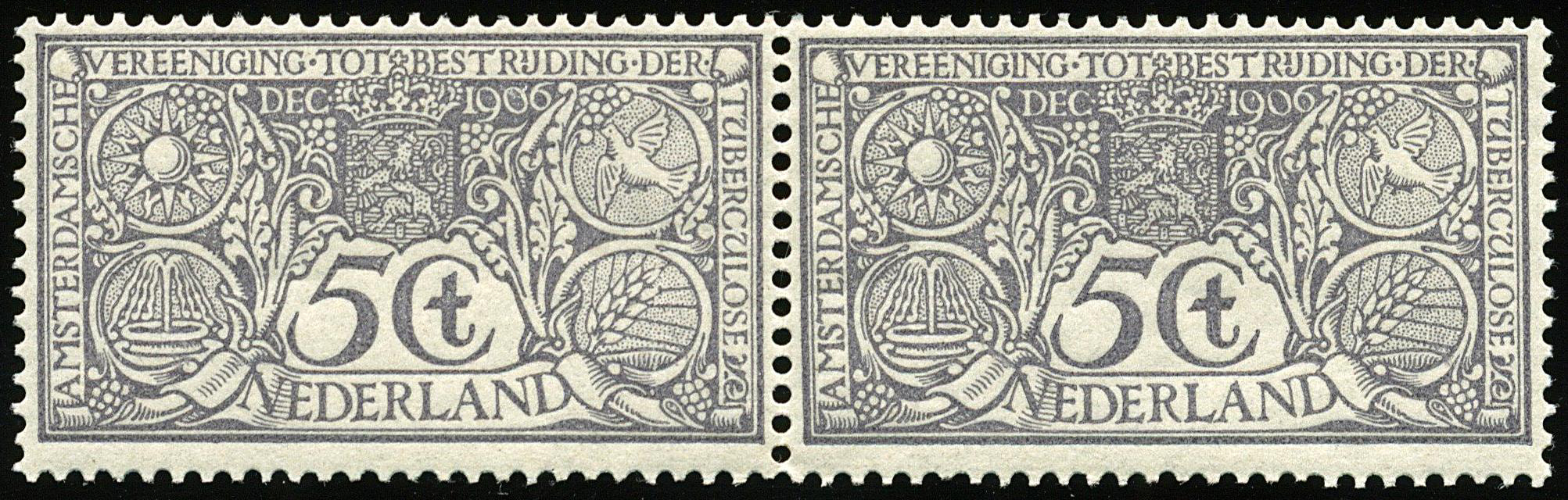 86PM10 + 86PM11, 5 cent TBC 1906 in horizontaal paar met plaatfouten 'Verticaal wit lijntje door korenaar' resp. 'Wit stipje boven UB', postfris prachtpaar. Cert. Vleeming (2024). Mast € 1440