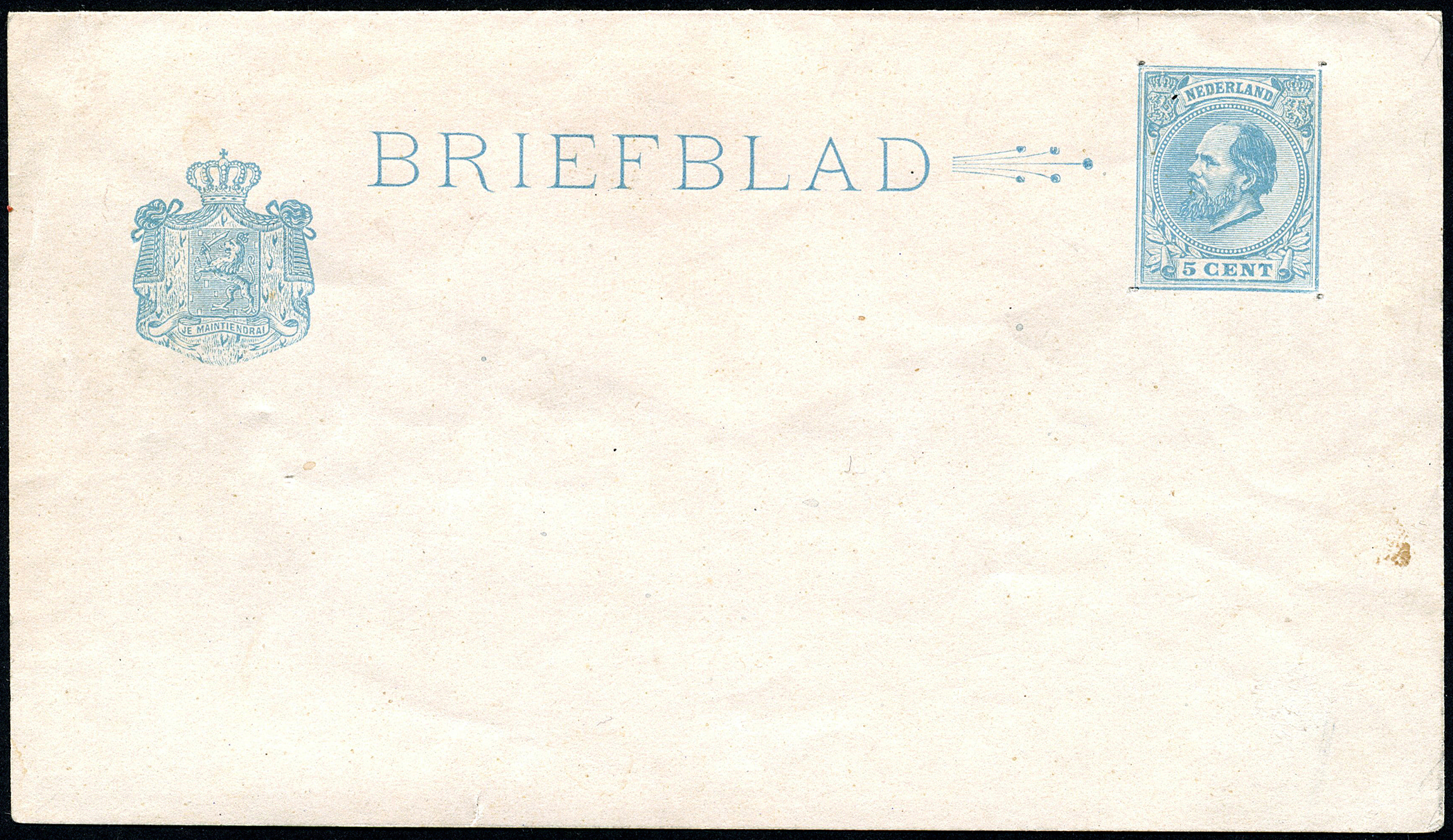 Proef voor het uit te geven postblad, hier nog genoemd ´Briefblad´ (Model sub 4), voorzijde en klep. Vrijwel prachtex. (vlekje en rondom zegelbeeld in de hoeken met potloodpunt? ingedrukte punten). Zie: H.E.R. Sandberg, Fil. Inf. 20, p.3520-4/6. Info bijgevoegd