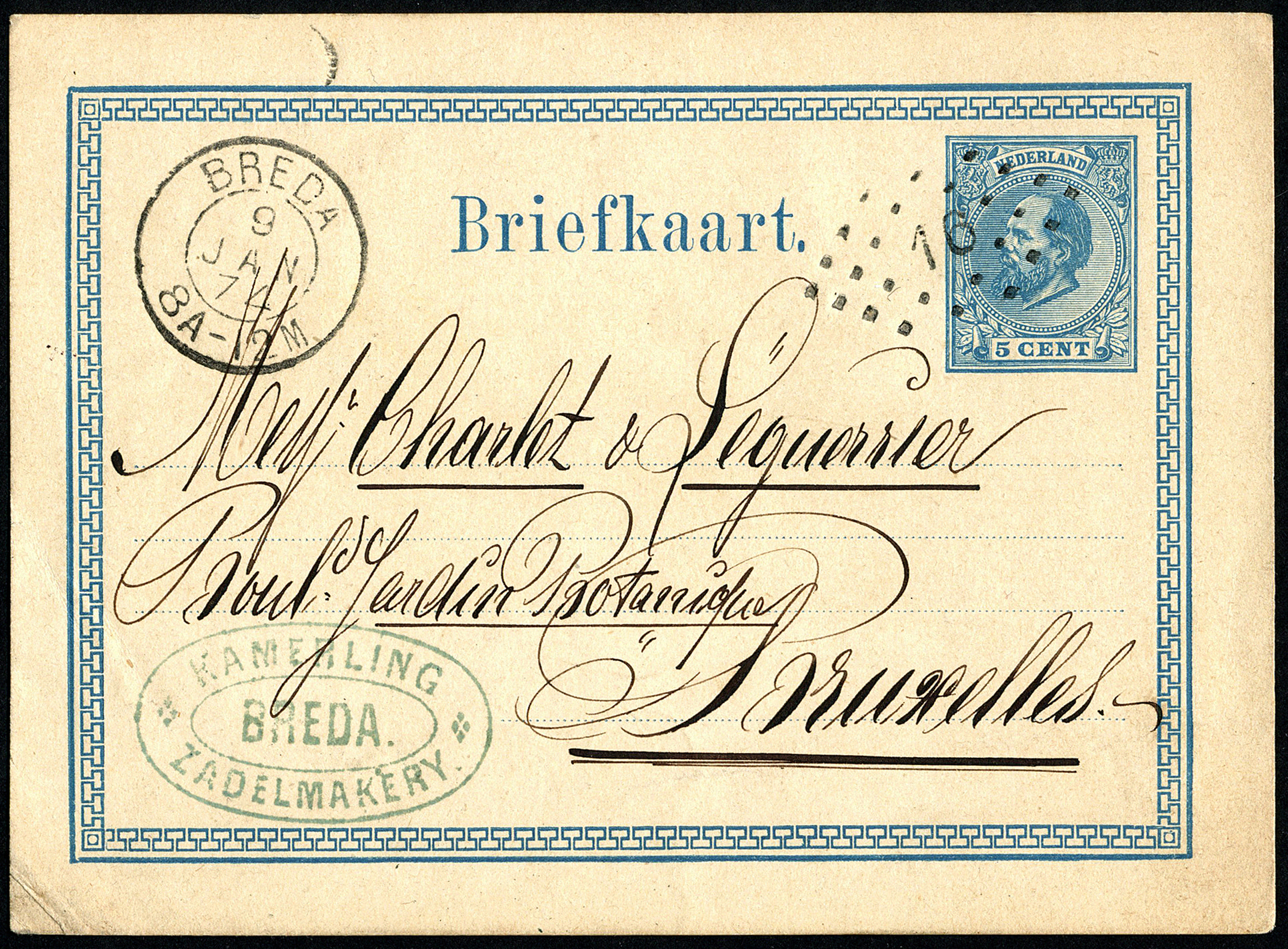 Briefkaart G8 verzonden op 9-1-1874, de vroegst bekende datum (!), en tegen de voorschriften afgestempeld met puntstempel