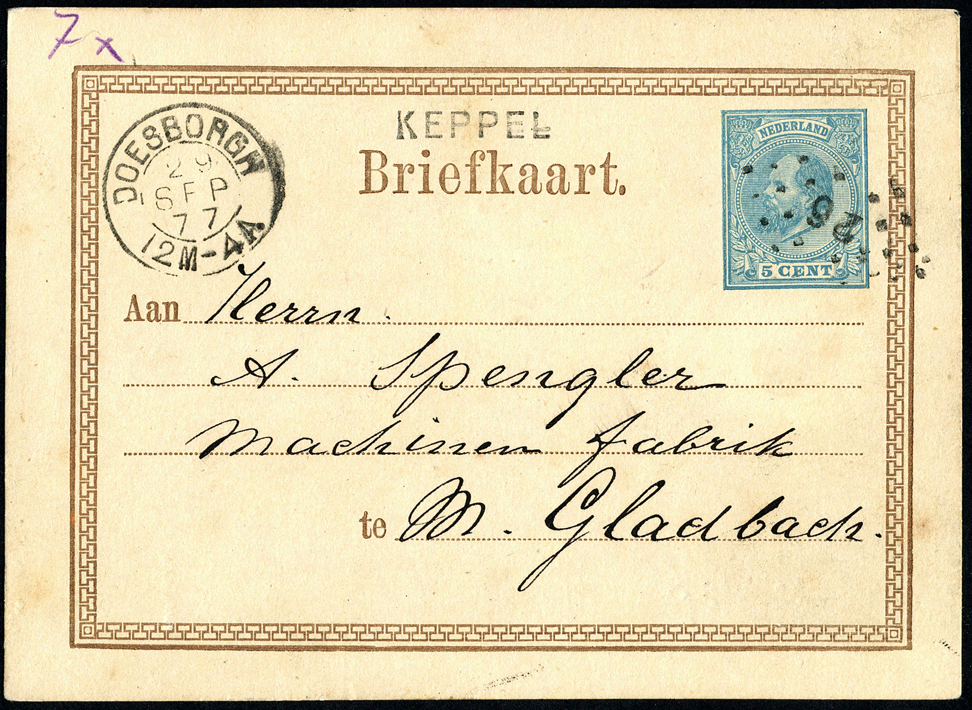 Briefkaart G11, geschreven te Lochem, via Keppel (naamstempel) via Doesborgh 29-9-1877, waar het zegelbeeld tegen de voorschriften in met het puntstempel is afgestempeld, naar Mönchengladbach (Jans enig bekend ex.). Zie ook de tekst in Geuzendam bij deze briefkaart!