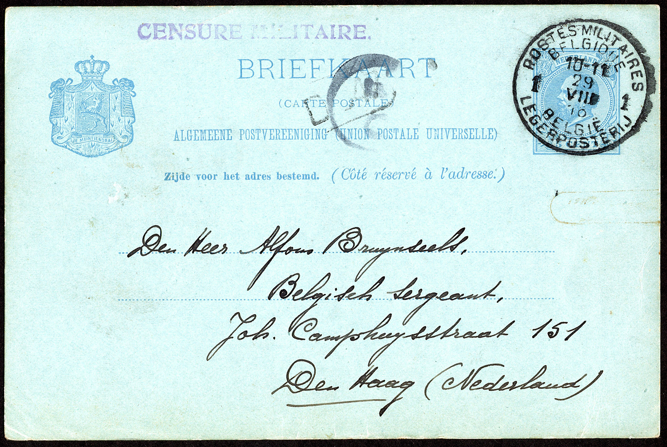 Eerste Wereldoorlog. Bk. G27 zeer laat gebruikt, verzonden via de Belgische Legerposterij op 29-8-1916, gecensureerd 'CENSURE MILITAIRE.', naar een Belgisch sergeant in Den Haag met een tekst over de Duitse bezetting '... mochten wij ons geliefd vaderland gezuiverd zien van al dat vreemd gespuis...' De Belgische post werd via Engeland verzonden (censuurstempel CF = Censor Folkstone), en omdat soldaten portvrij konden versturen kon deze ongeldige briefkaart zonder verhoogd port worden gebruikt (info inzender)