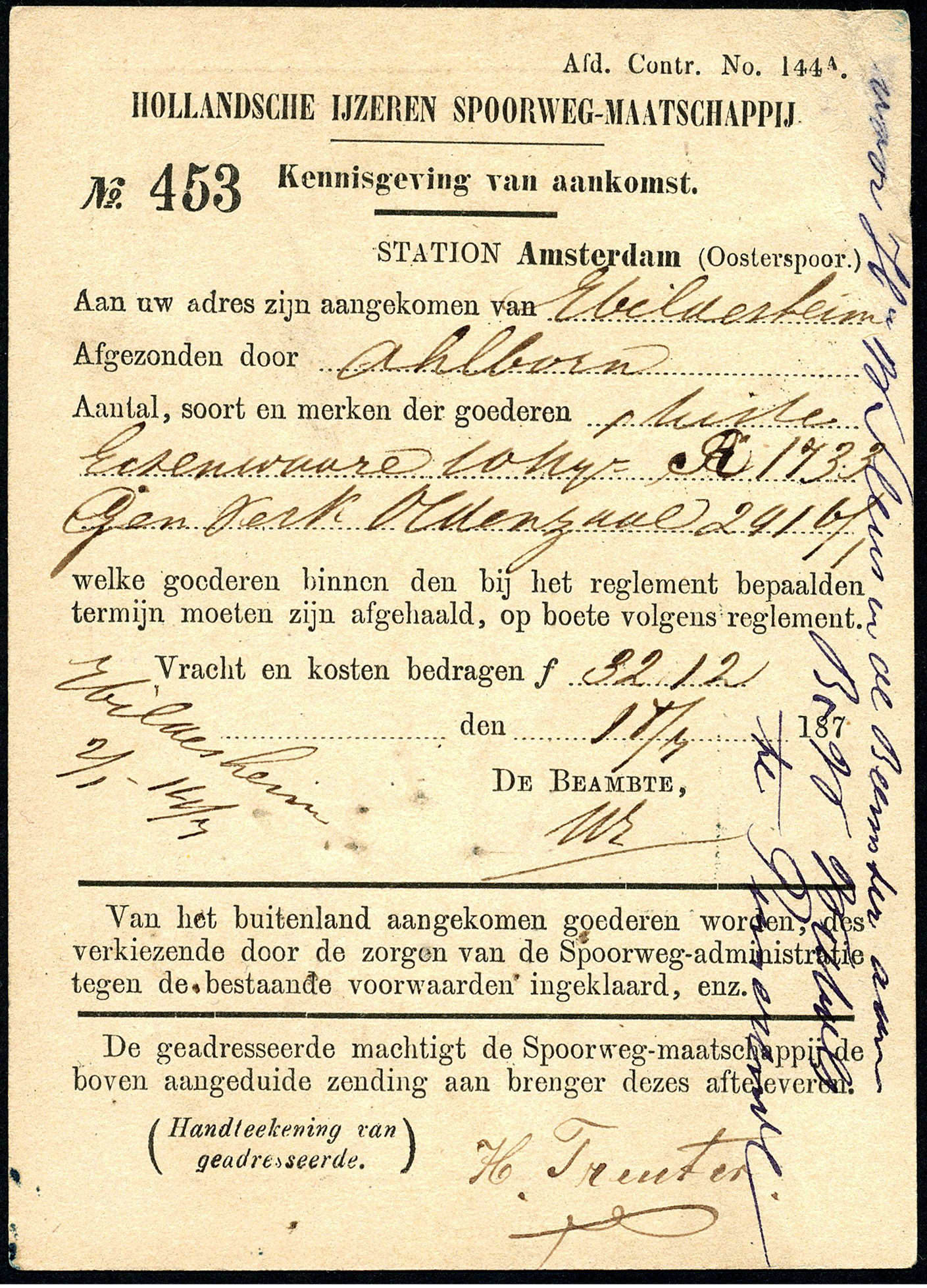 Spoorwegbriefkaart. Zegel 'Wapen' 2½ cent, adreslijnen nauw gepunt, basiskaart G12 aan achterzijde verticaal bedrukt, Hollandsche IJzeren Spoorweg-Maatschappij, Kennisgeving van aankomst No. 453, 'Afd. Contr. No. 144A', HYSM7c, met op vz. haltestempel Amsterdam in blauw en 2x kleinrond Amsterdam 18-7-1877. Schaarse kaart!