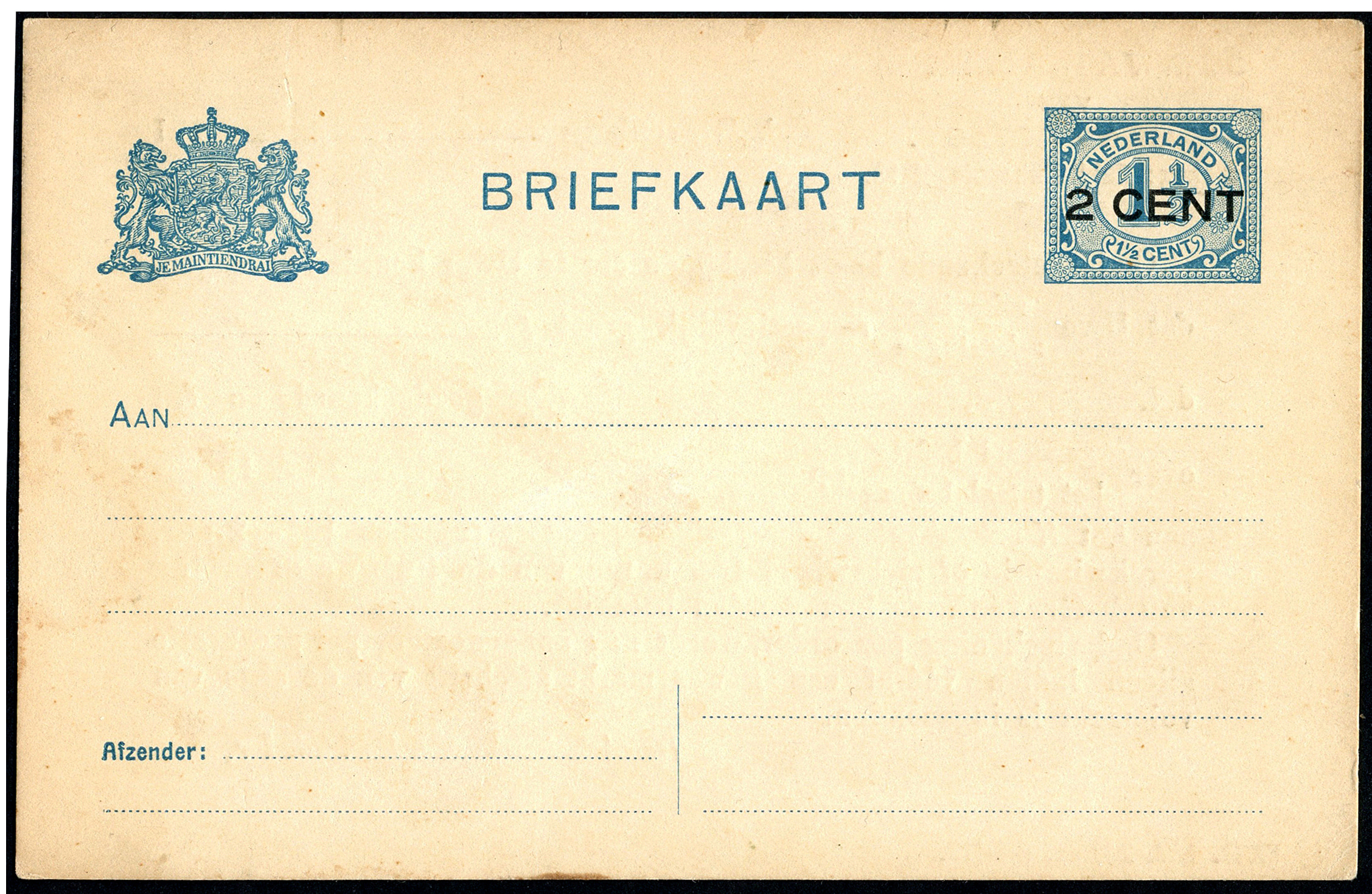 Particulier bedrukte bk. van de Duinwaterleiding van ´s-Gravenhage DW94a-IIb met op az. ´G.D. 133. 250 ex. 6-8-´18.´. Recentelijk ontdekt, alleen ongebruikt bekend. Vrijwel prachtkaart