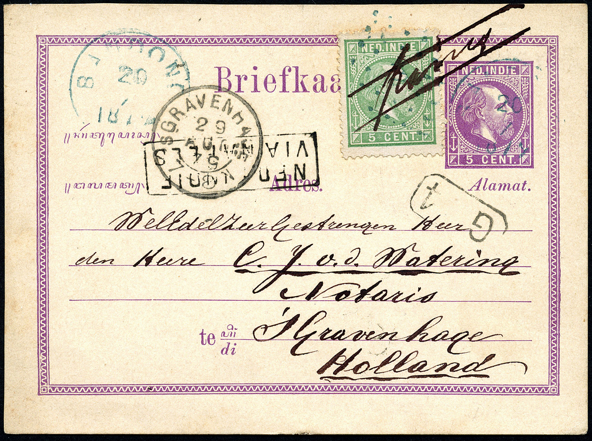 Bk. G1c bijgefr. met 5 cent (2½ cent te veel), geschreven te Ardjasarie op 19-7-1879, van Bandong 20-7-1879 (rondtempel en puntstempel 12 in blauw) via Napels naar 'sGravenhage 29-8