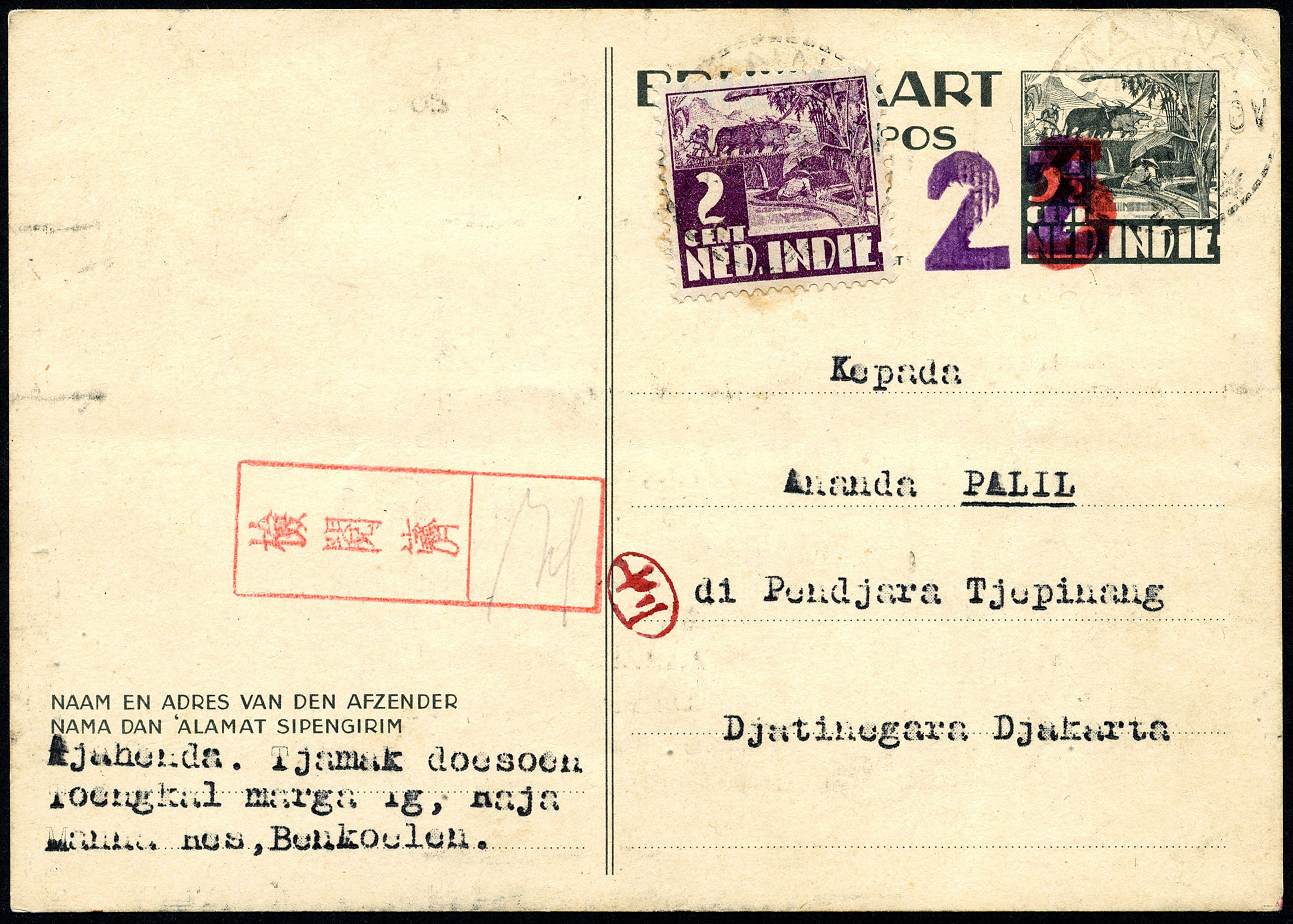 Sumatra. Benkoelen. 3½ Cent postcard type Kreisler with red 5 overprint, again re-valued with two violet 2 overprints Bu.78, 2 cent Kreisler without overprint adjacent, written in the little village of Toengkal on 6 April 2603, sent from Manna 18.7.4.10-11V to Djatinegara on Java. Very rare postcard. Ex Hiegentlich, Jacobs