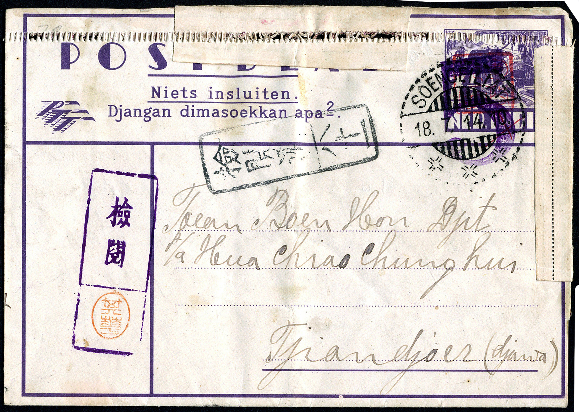 Sumatra. Banka & Billiton. 7½ Cent letter sheet with red Gunseibu In overprint re-valued with large violet 5, Bu.51 (RRR), from Soengeiliat 18.7.14.10 to Tjiandjoer (Java). Sewing machine censor on top and censor marks Bu.JC12b from Pangkalpinang and Bu.JC13c. Extremely rare, to our knowledge this is the only copy recorded. Opinion SvL: the overprints and censor marks are all genuine. Ex Jacobs