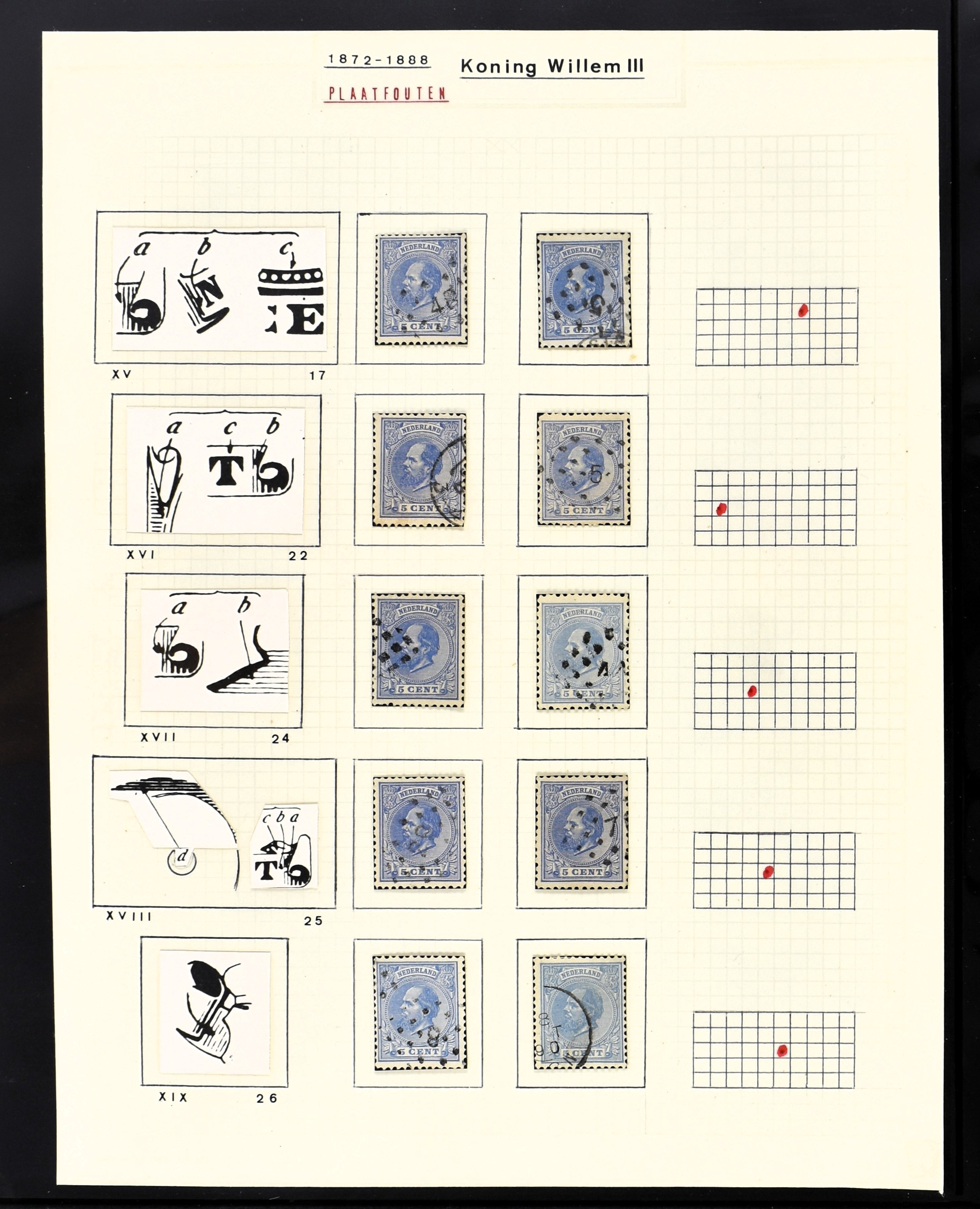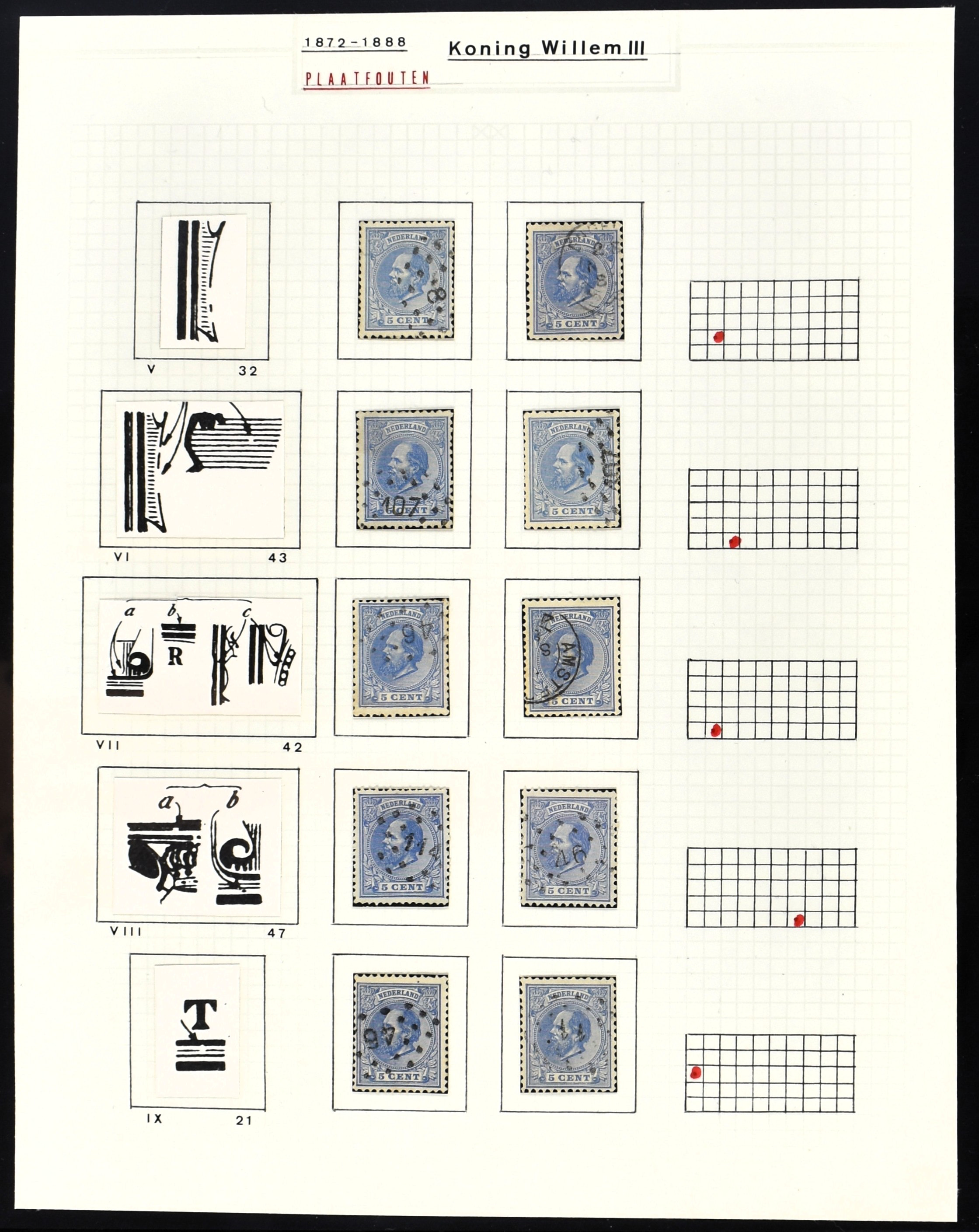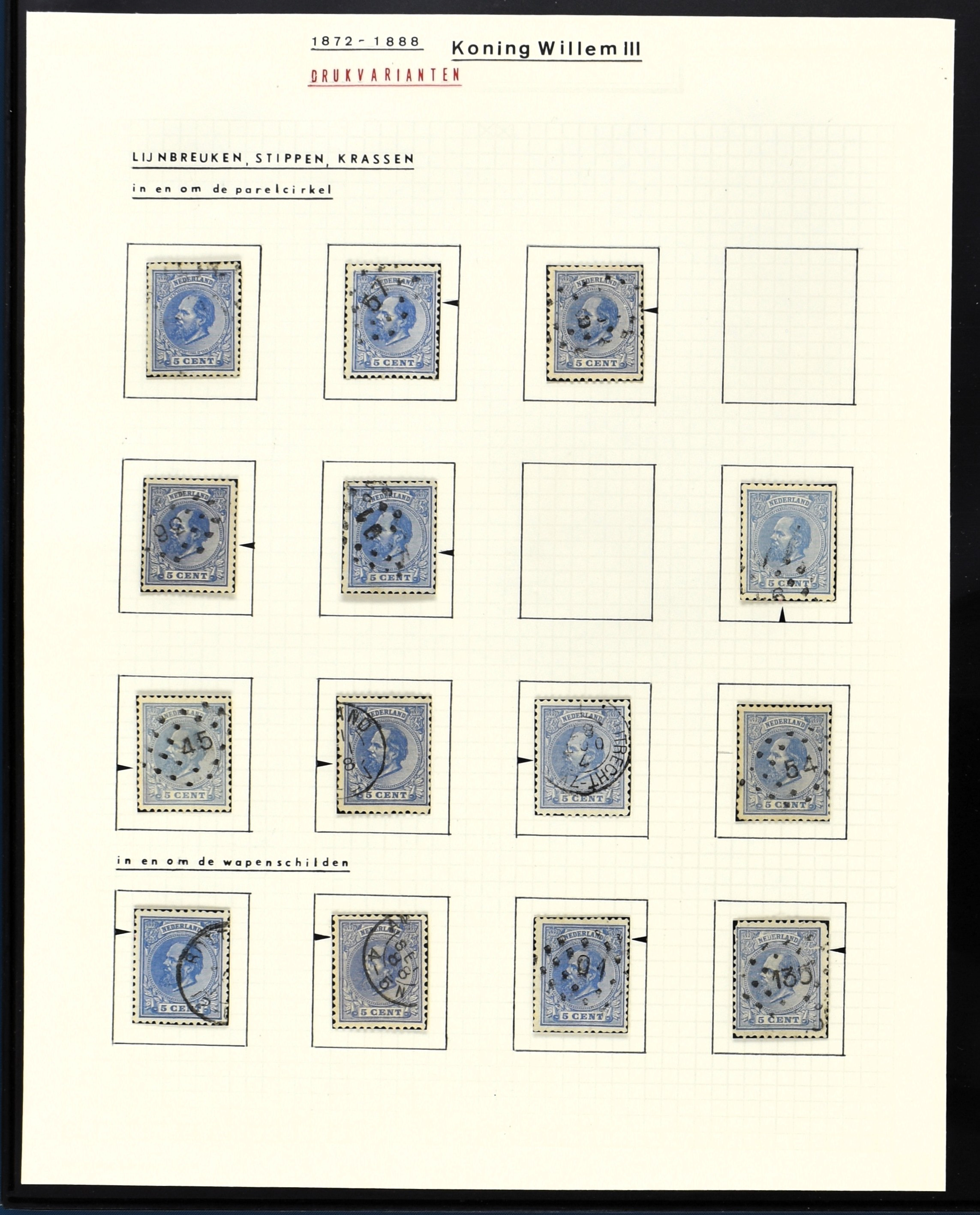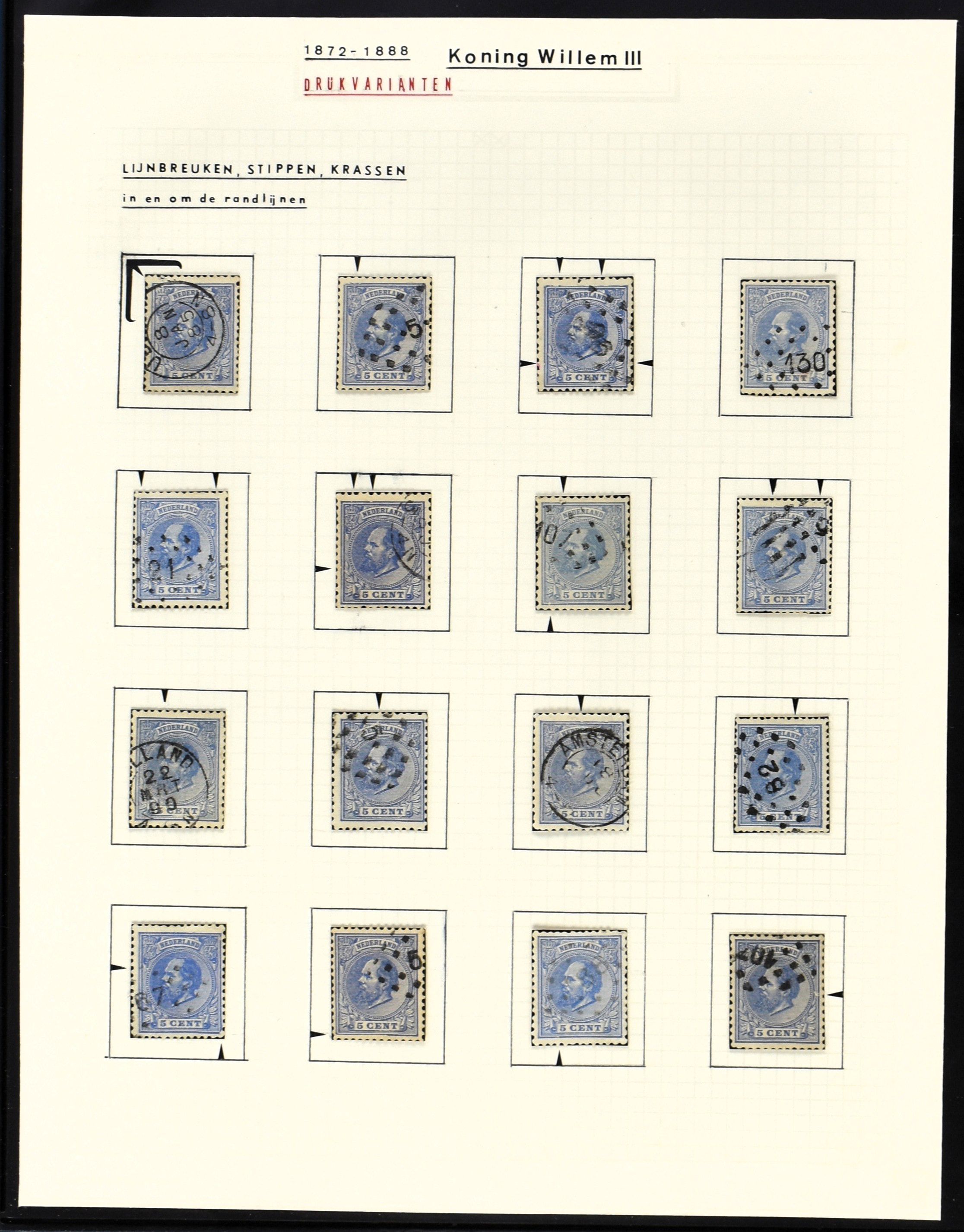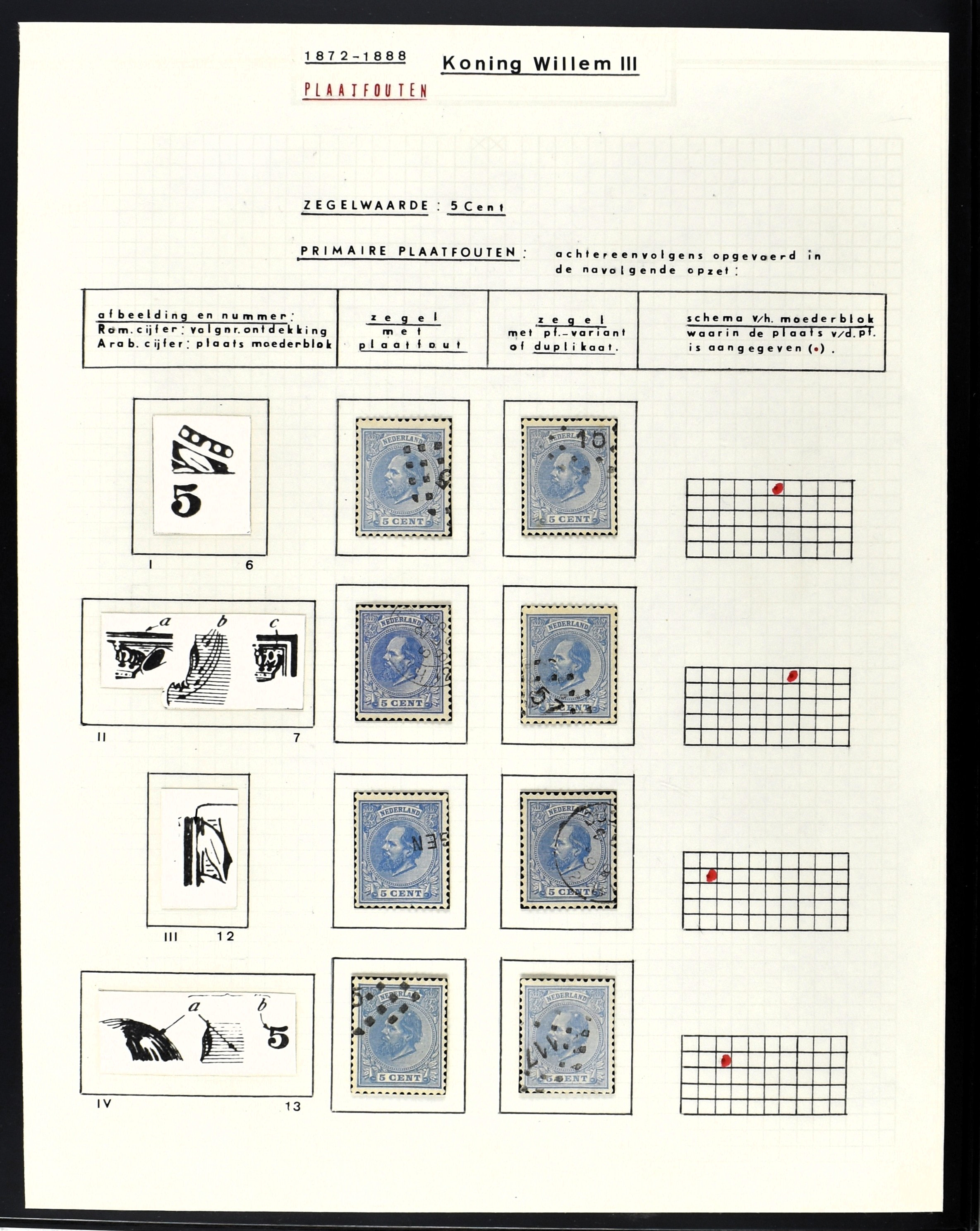 NEDERLAND 5 CENT EMISSIE 1872, uitgebreide en sterk gespecialiseerde verzameling primaire en secundaire plaatfouten, tandingen, papiersoorten, kleurnuances, perfins, poststukken o.a. briefkaarten ook met plaatfouten, in 8 Lindner ringbanden. Tevens literatuur in ringband en Handboek Emissie 1872 A. Dekker cs. Spannende koop!