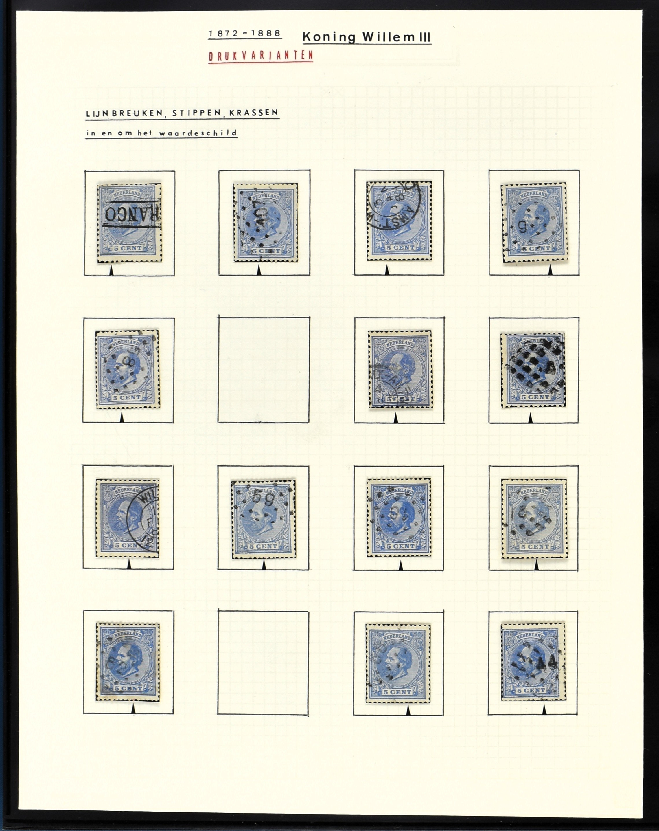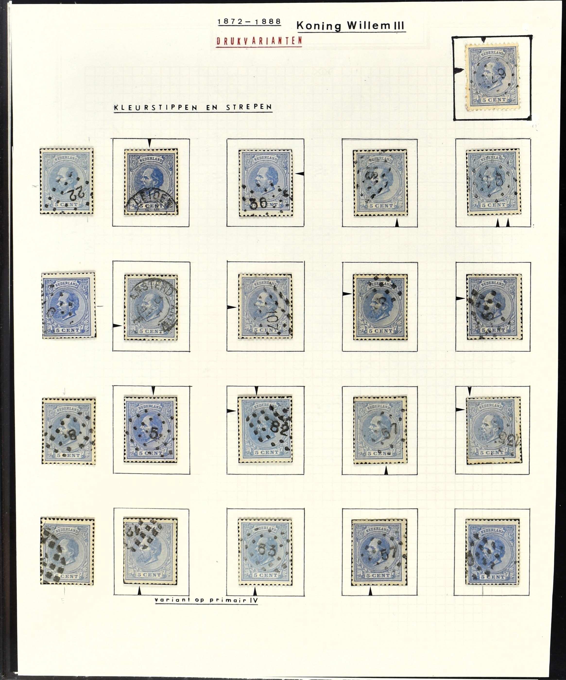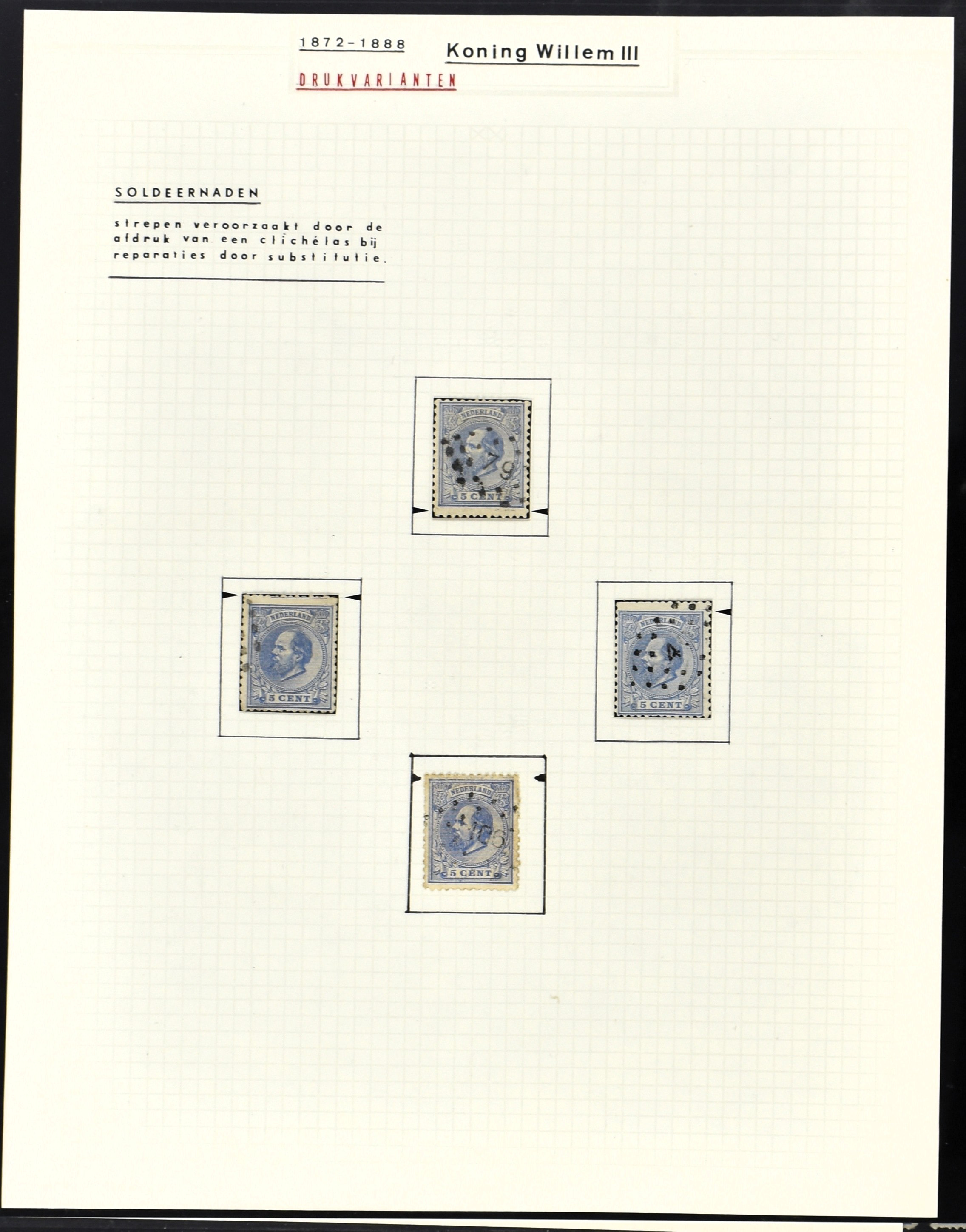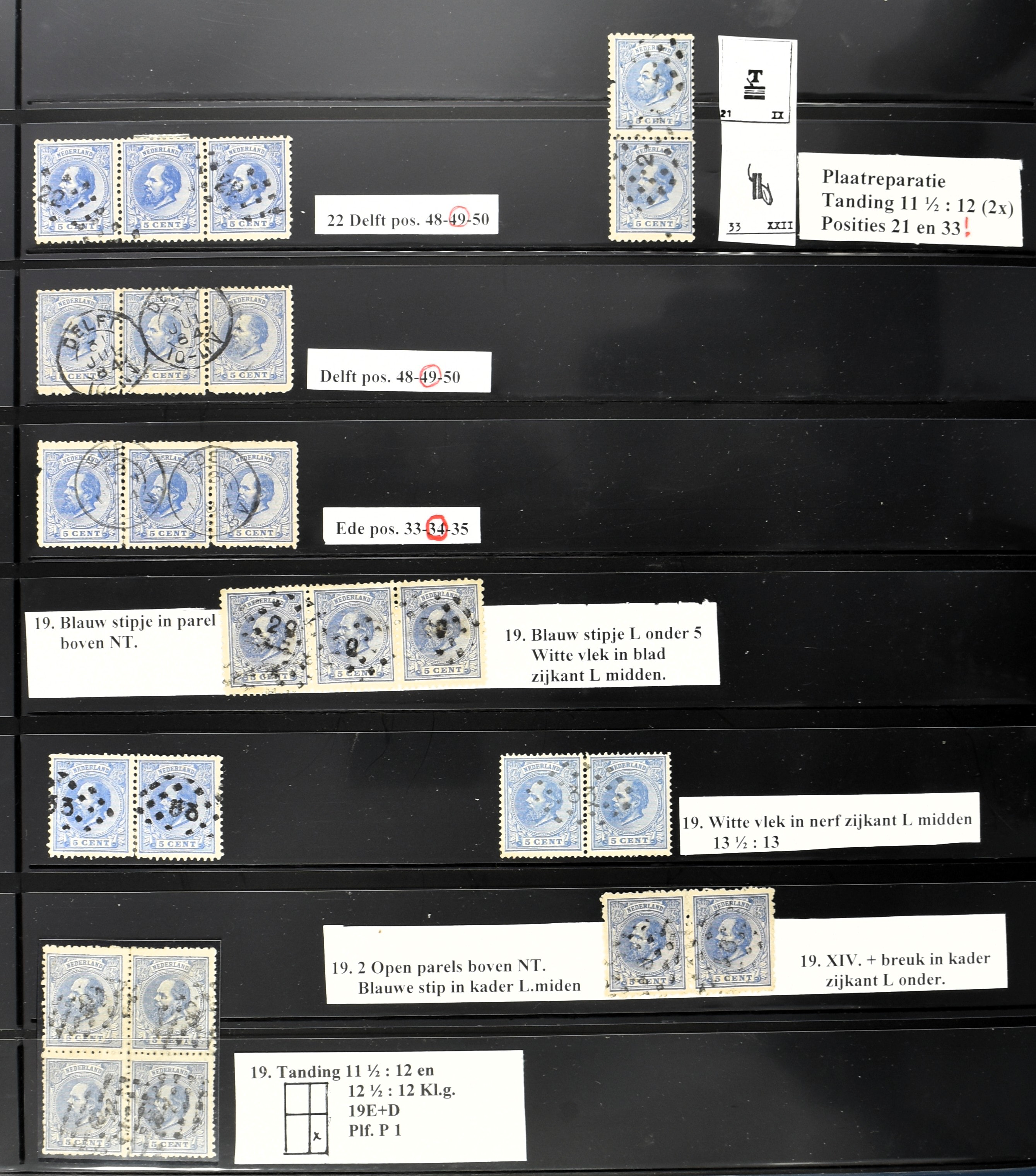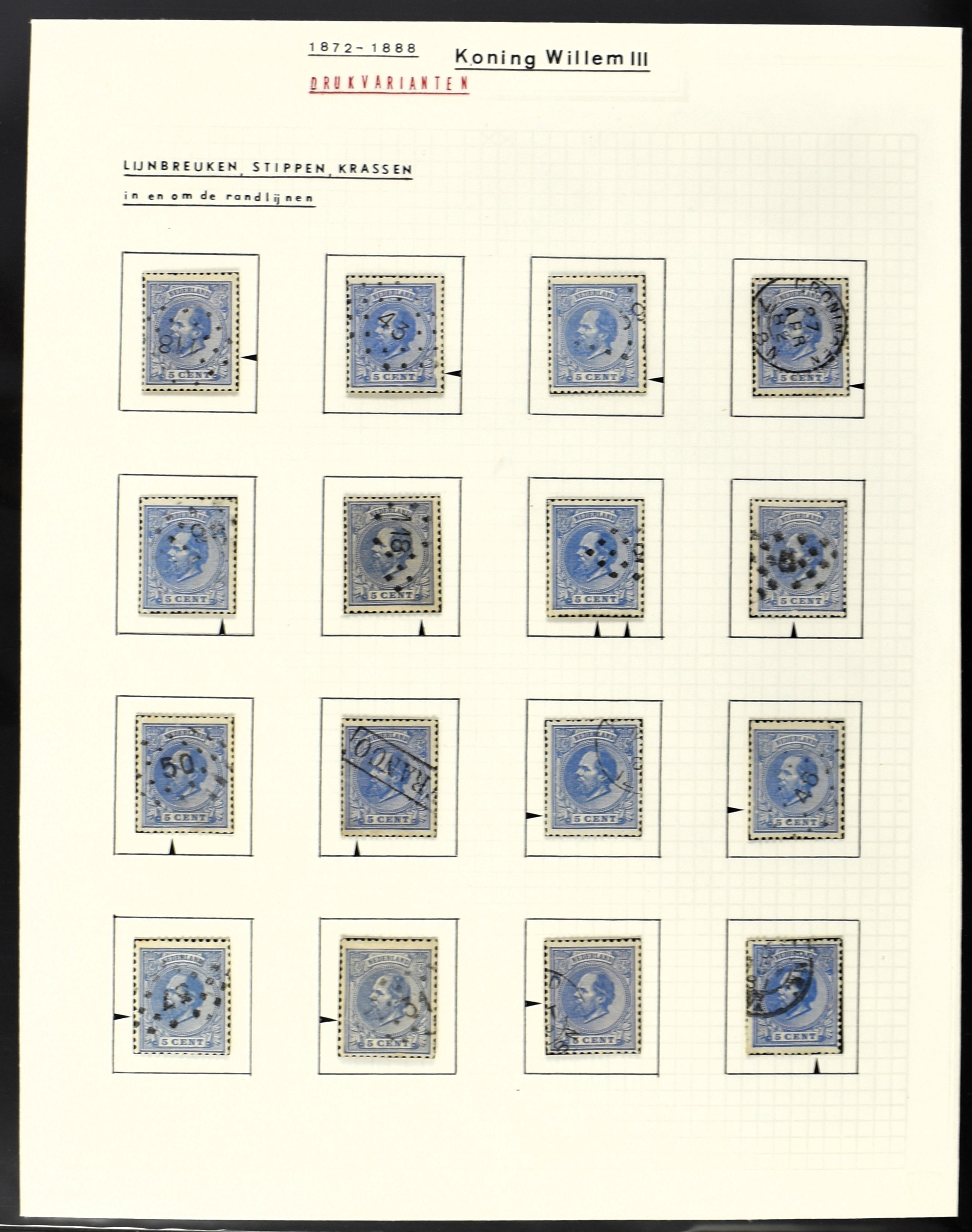 NEDERLAND 5 CENT EMISSIE 1872, uitgebreide en sterk gespecialiseerde verzameling primaire en secundaire plaatfouten, tandingen, papiersoorten, kleurnuances, perfins, poststukken o.a. briefkaarten ook met plaatfouten, in 8 Lindner ringbanden. Tevens literatuur in ringband en Handboek Emissie 1872 A. Dekker cs. Spannende koop!