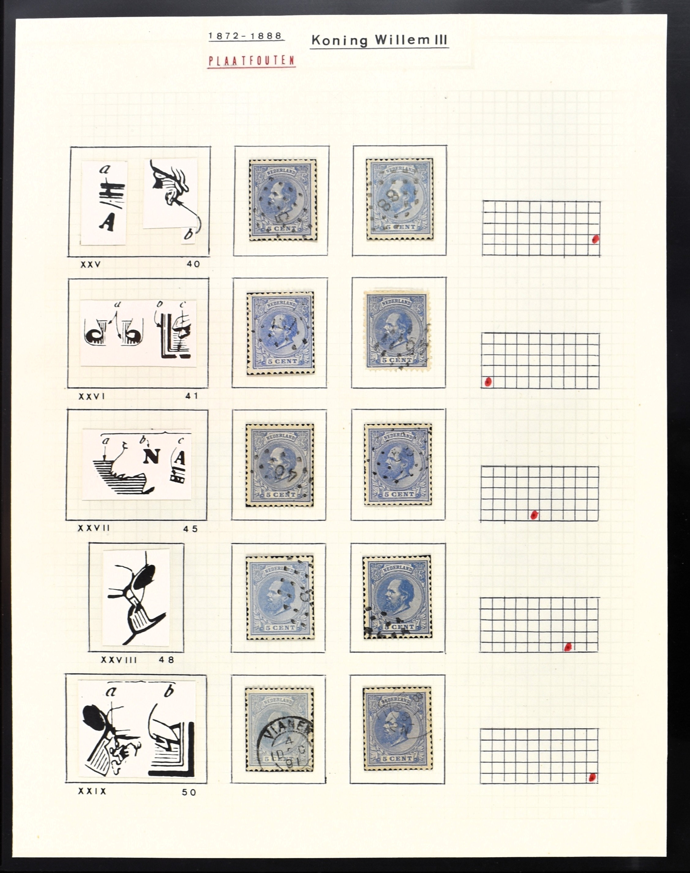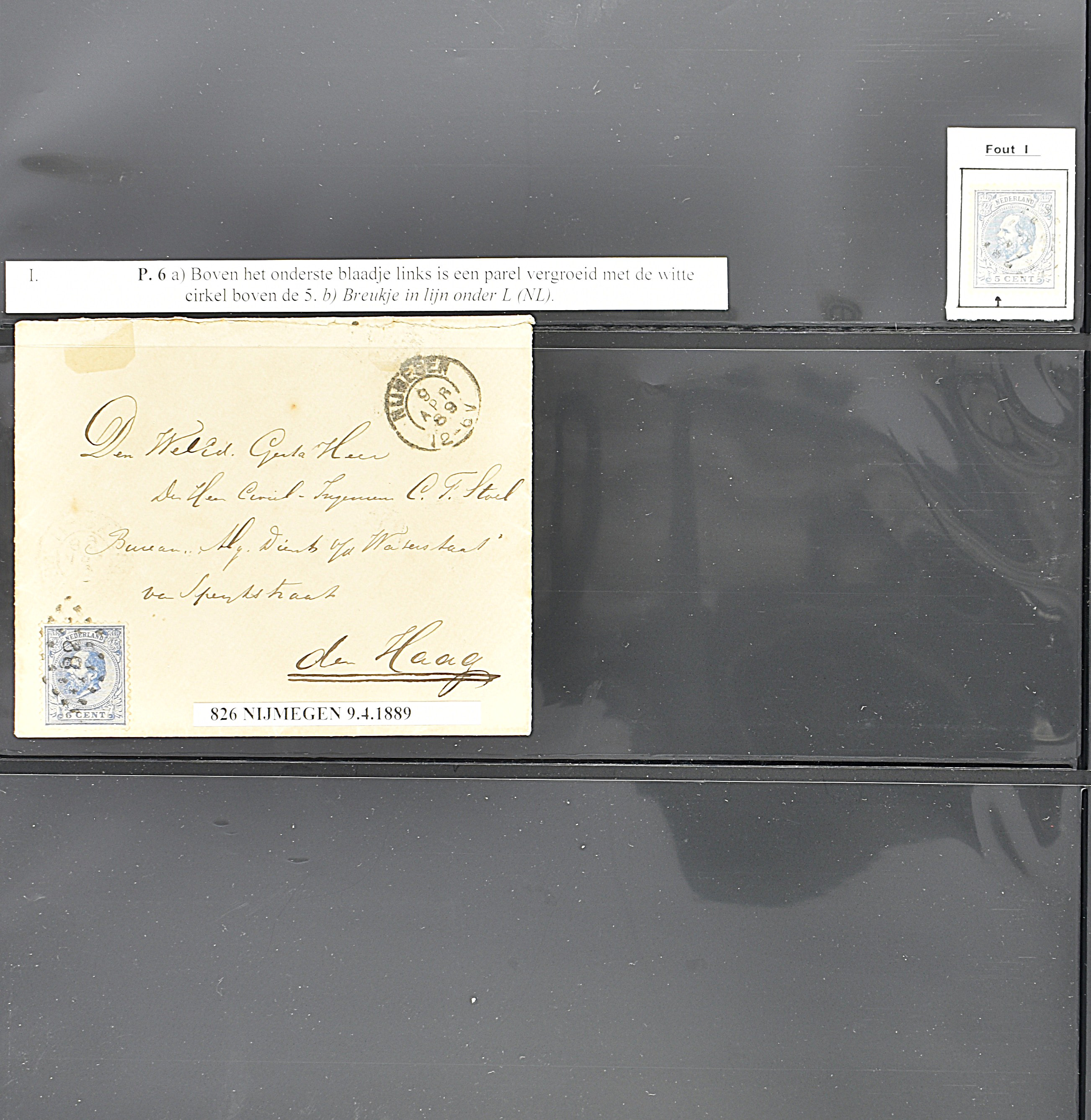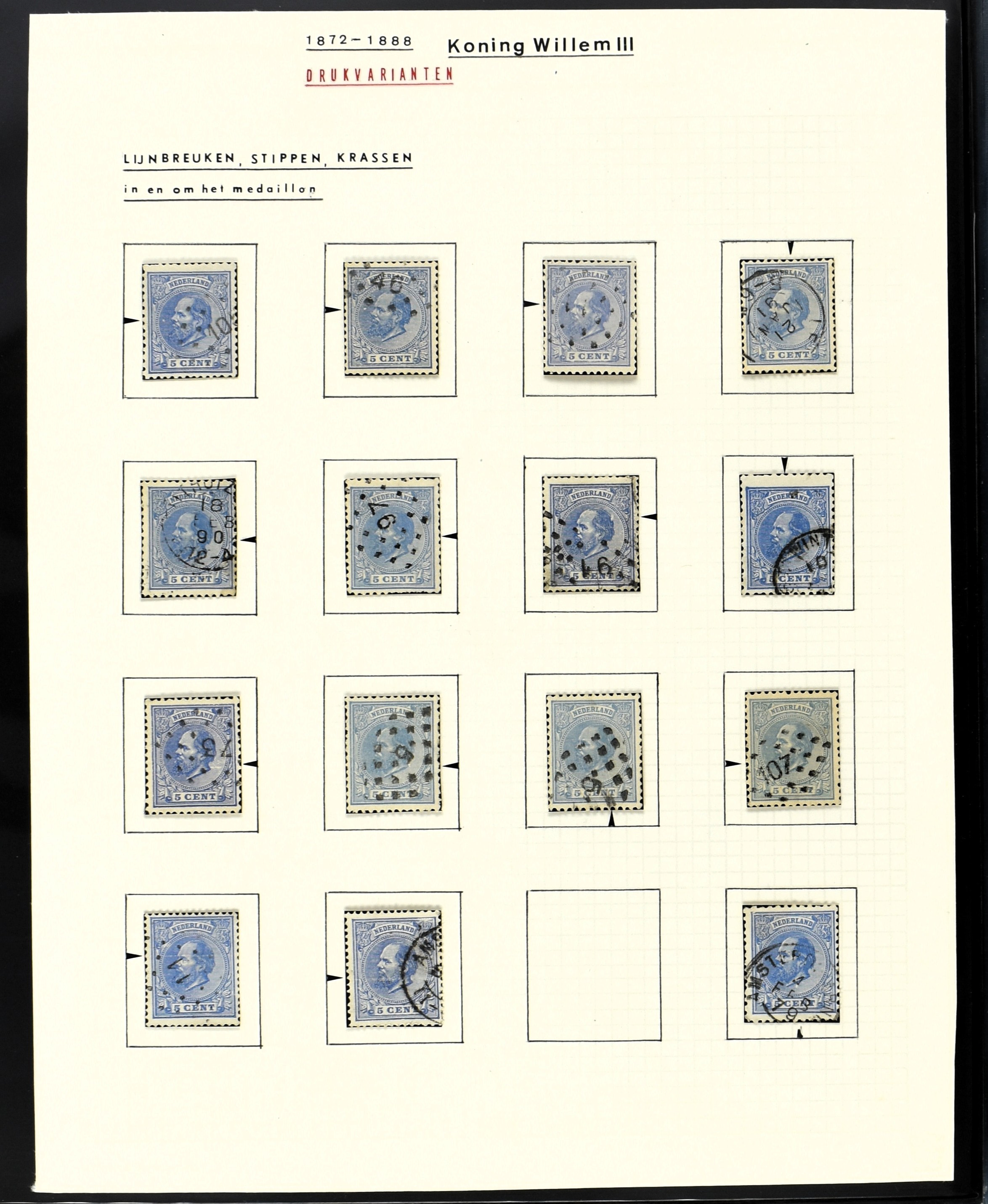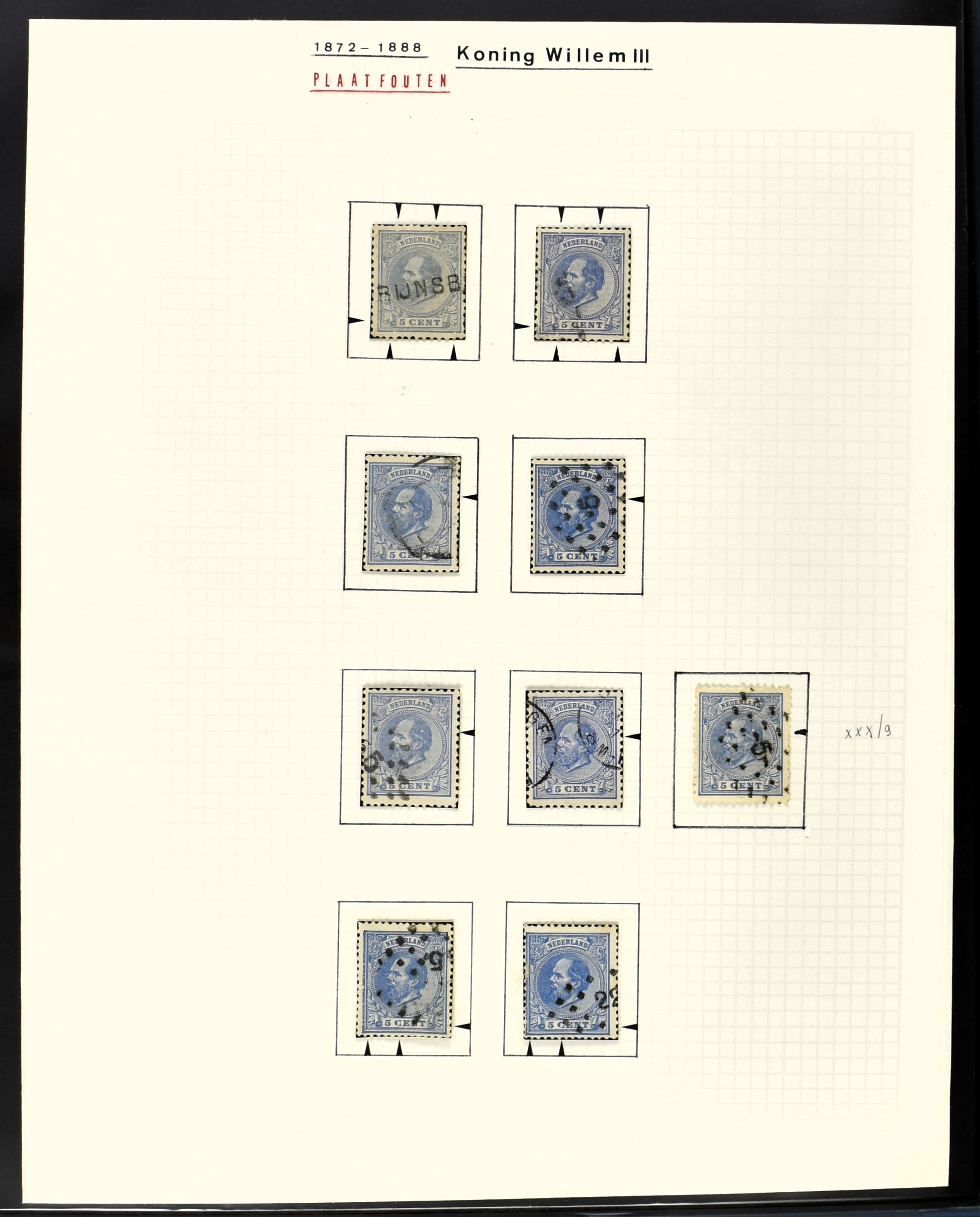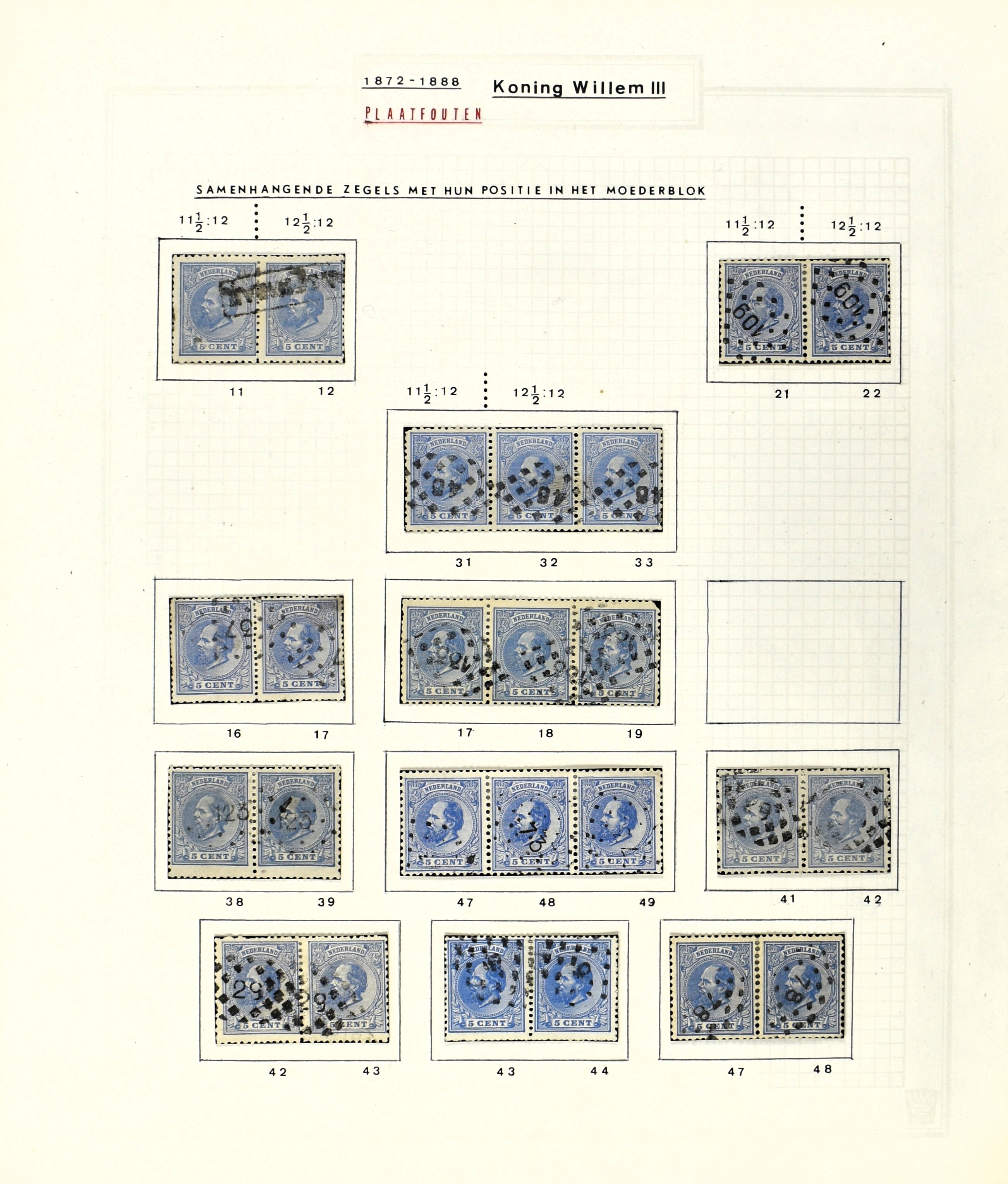 NEDERLAND 5 CENT EMISSIE 1872, uitgebreide en sterk gespecialiseerde verzameling primaire en secundaire plaatfouten, tandingen, papiersoorten, kleurnuances, perfins, poststukken o.a. briefkaarten ook met plaatfouten, in 8 Lindner ringbanden. Tevens literatuur in ringband en Handboek Emissie 1872 A. Dekker cs. Spannende koop!