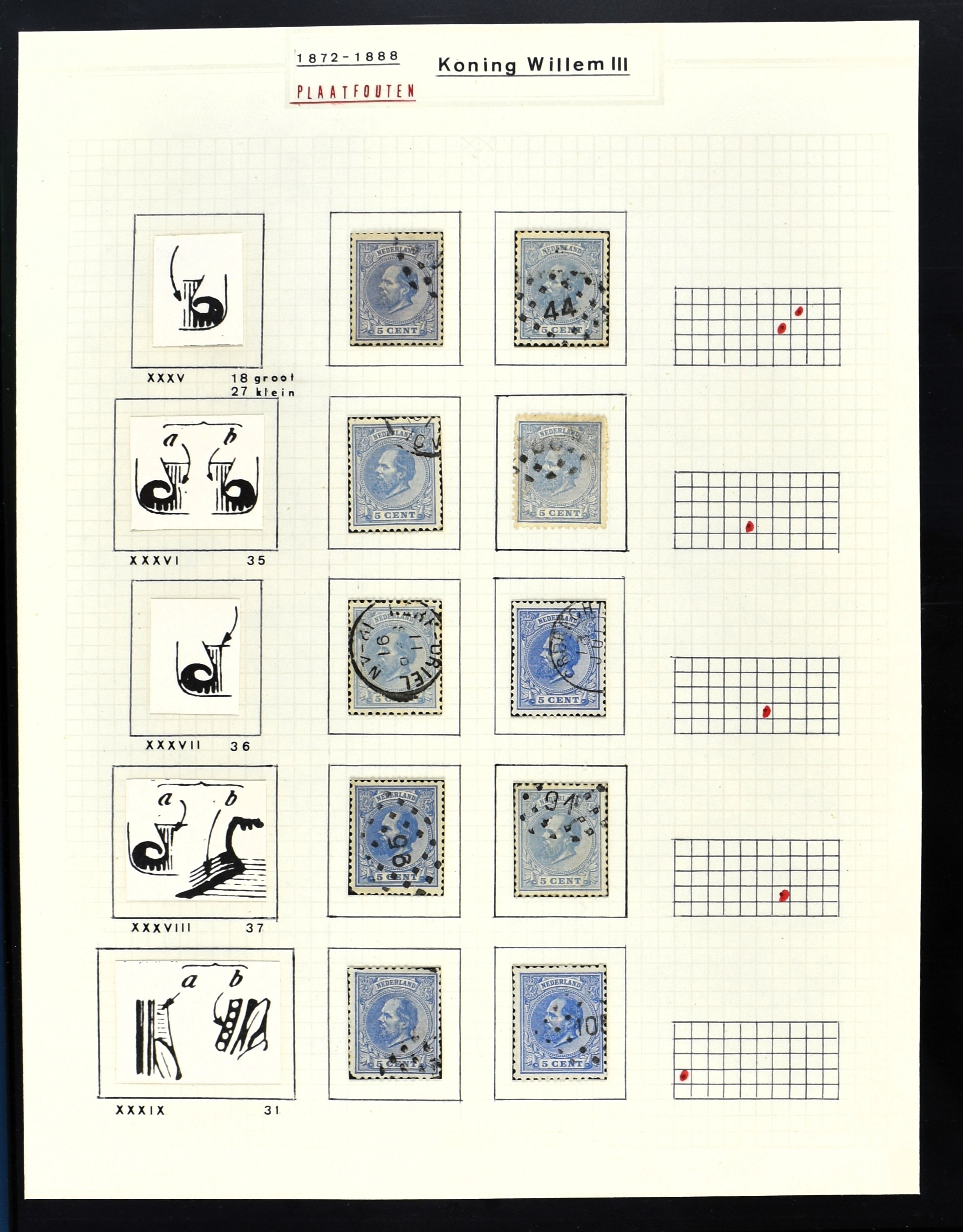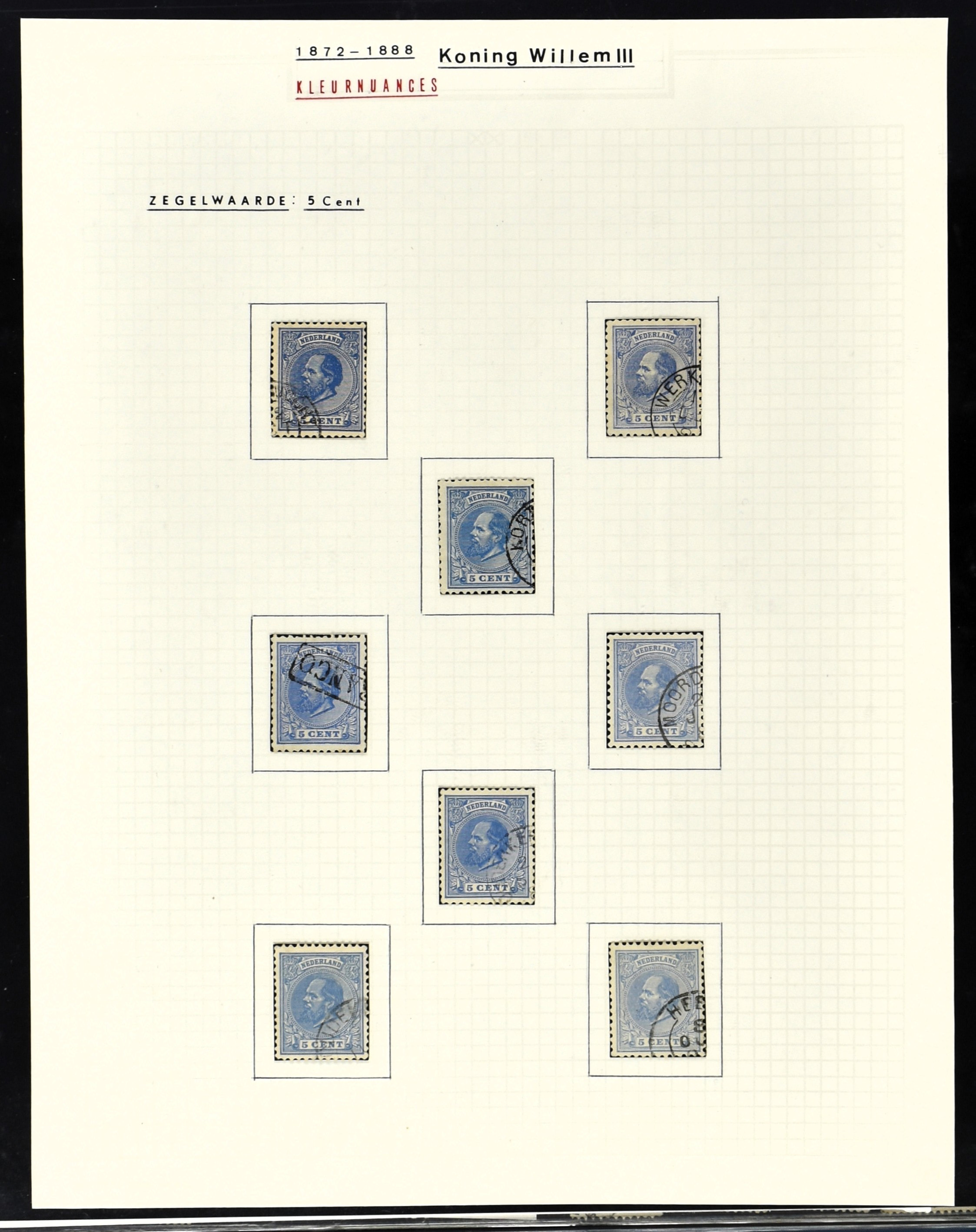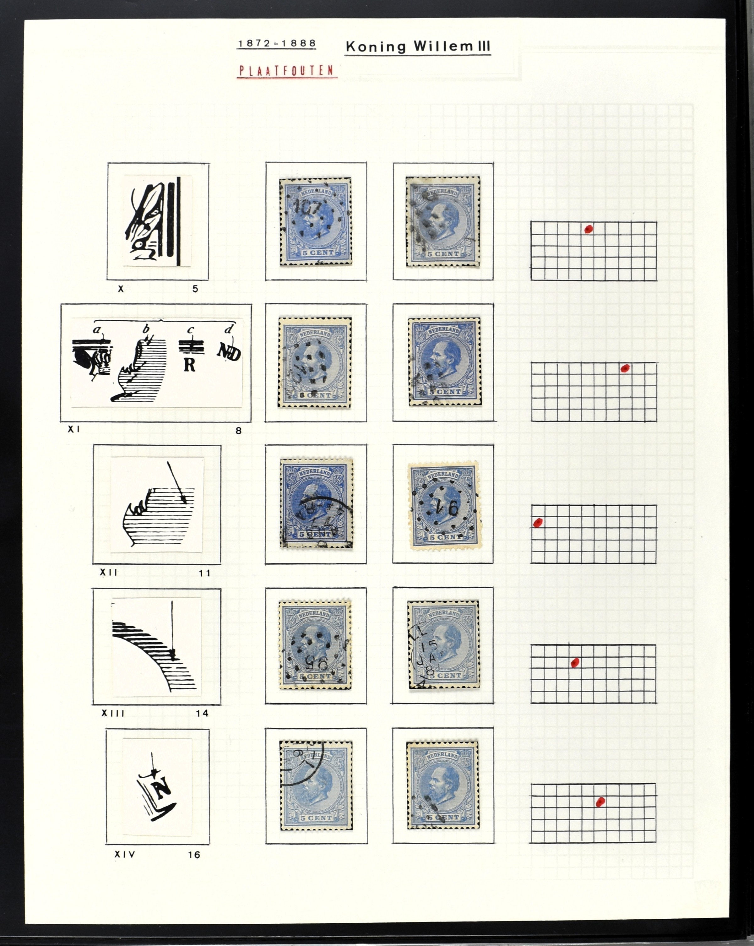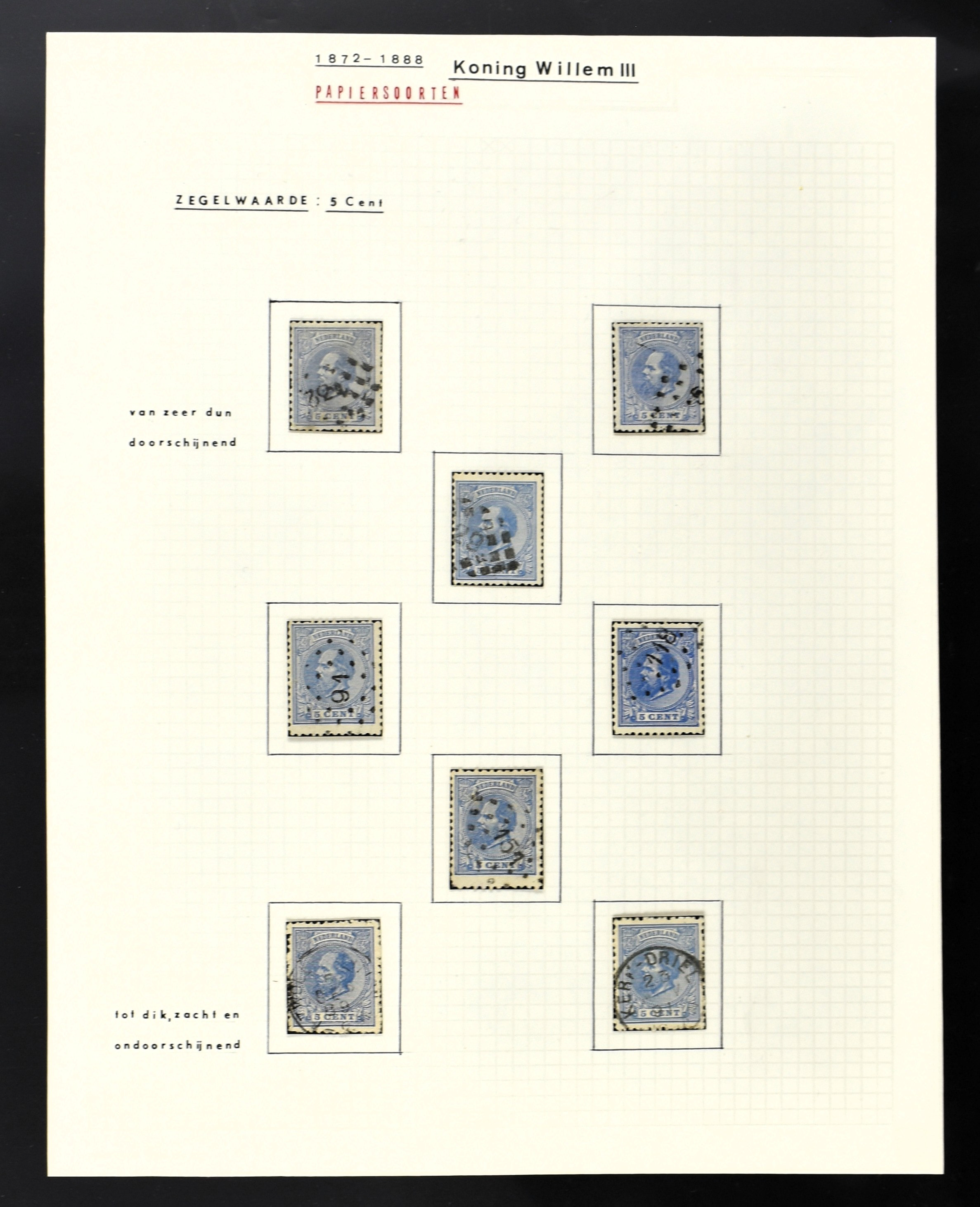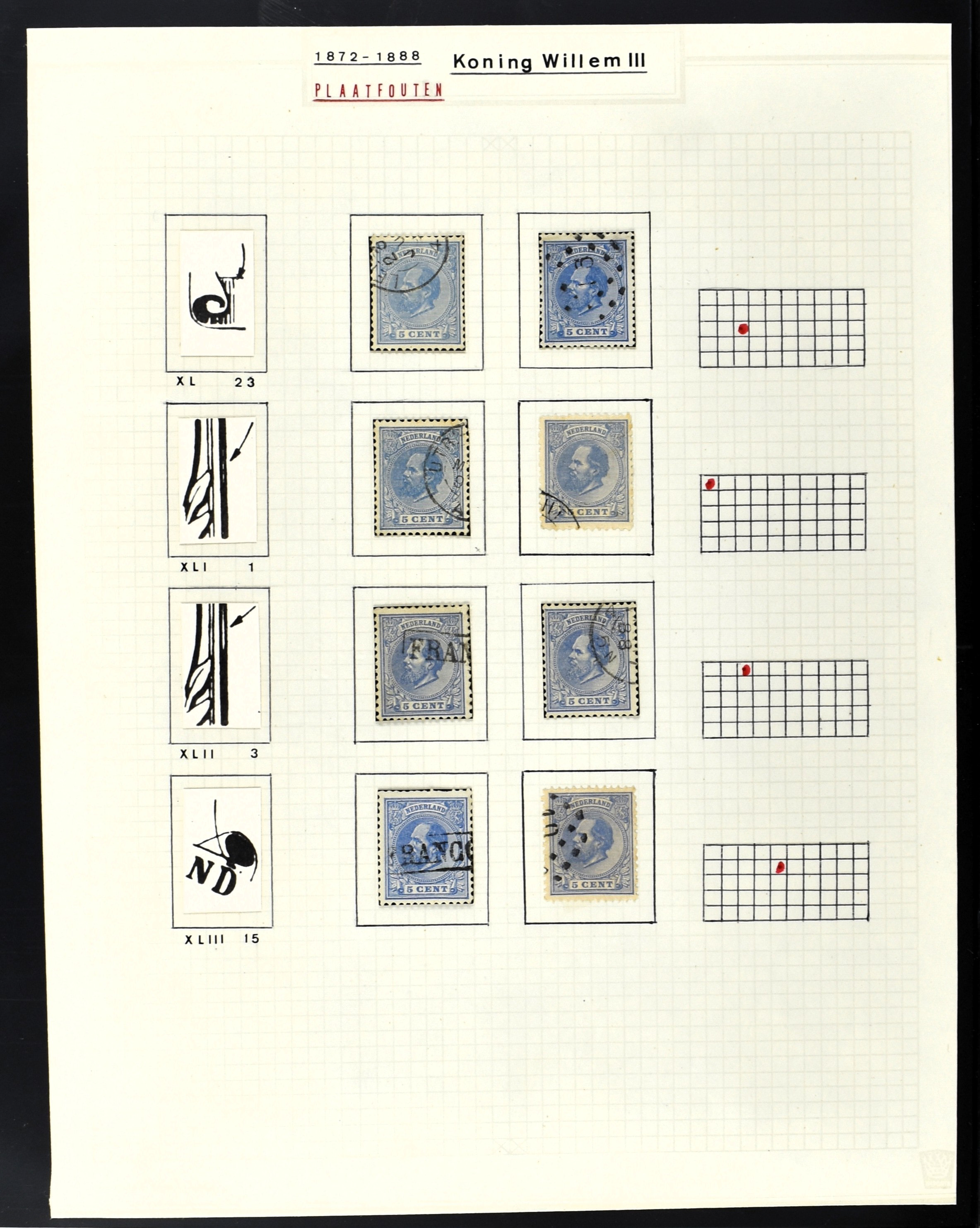 NEDERLAND 5 CENT EMISSIE 1872, uitgebreide en sterk gespecialiseerde verzameling primaire en secundaire plaatfouten, tandingen, papiersoorten, kleurnuances, perfins, poststukken o.a. briefkaarten ook met plaatfouten, in 8 Lindner ringbanden. Tevens literatuur in ringband en Handboek Emissie 1872 A. Dekker cs. Spannende koop!