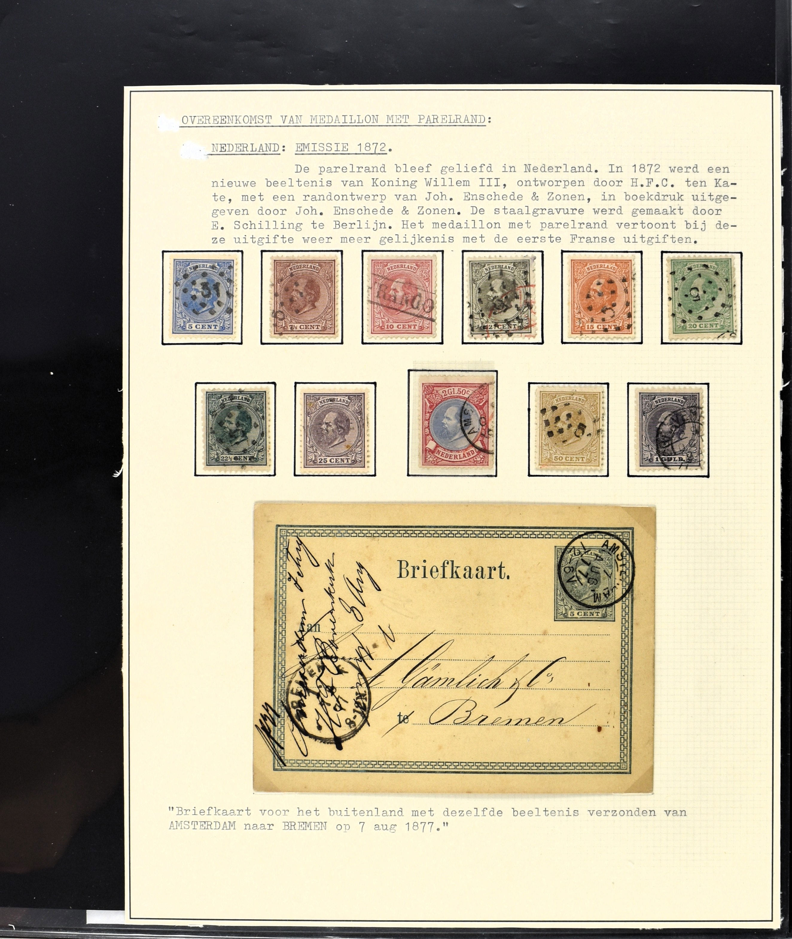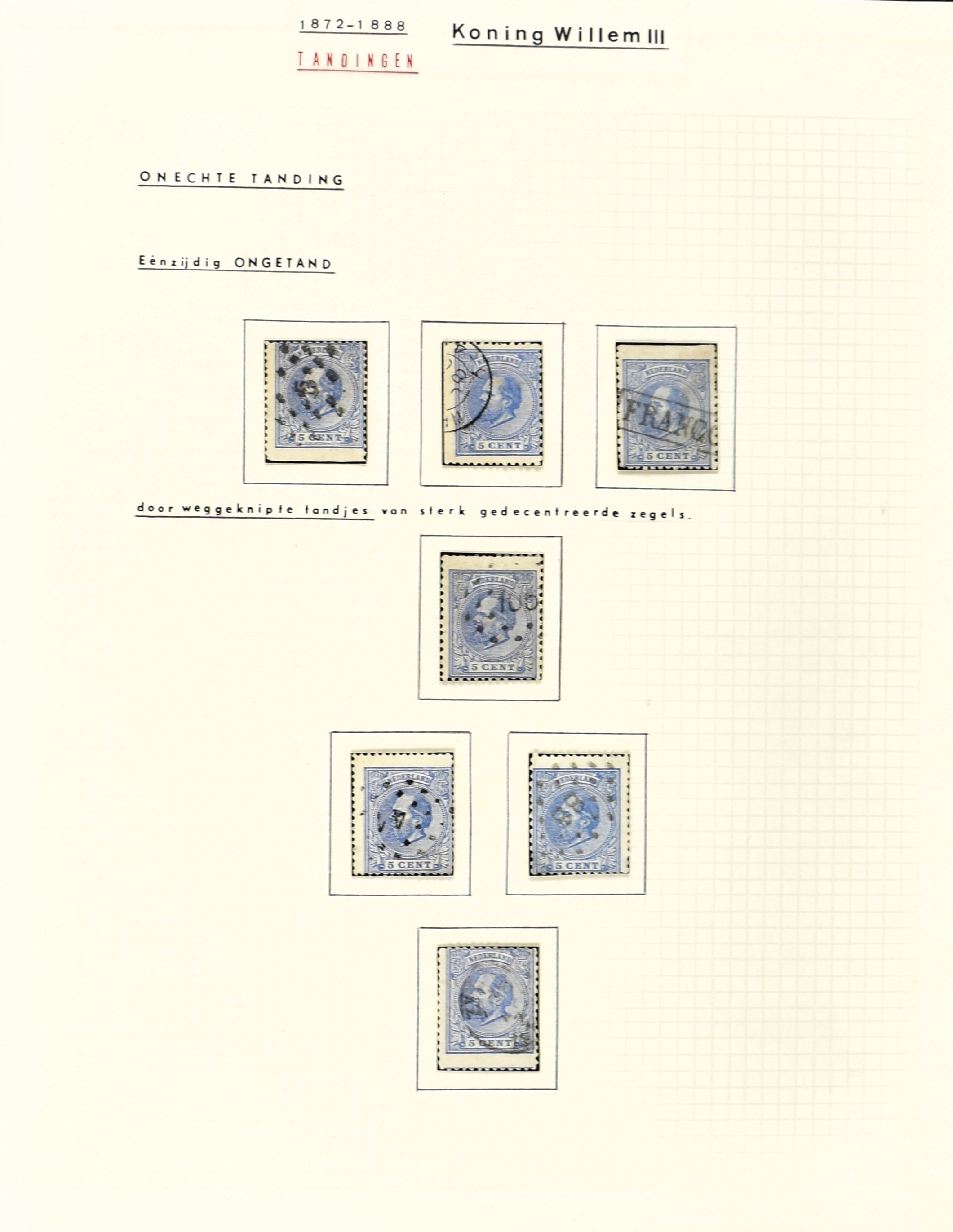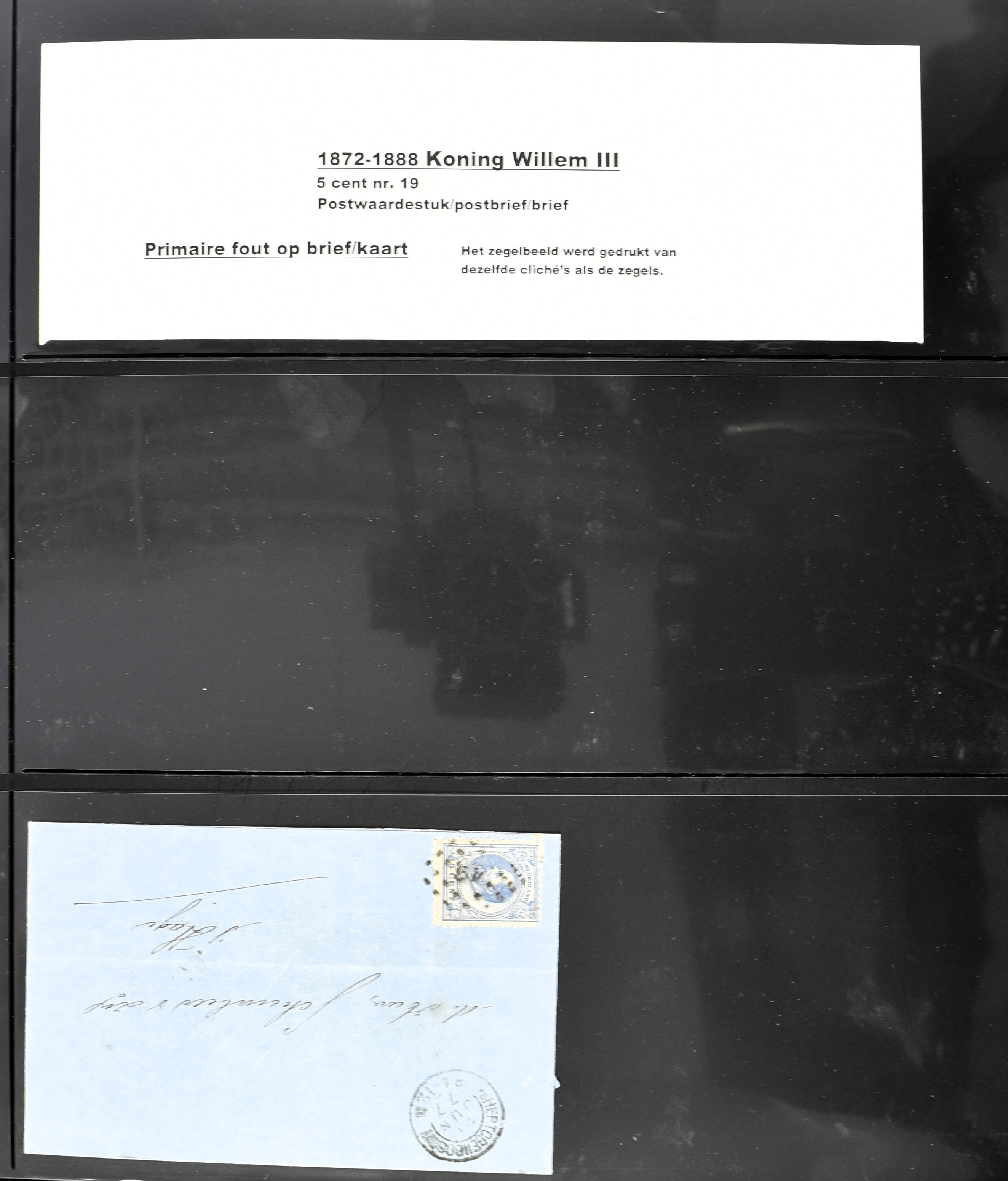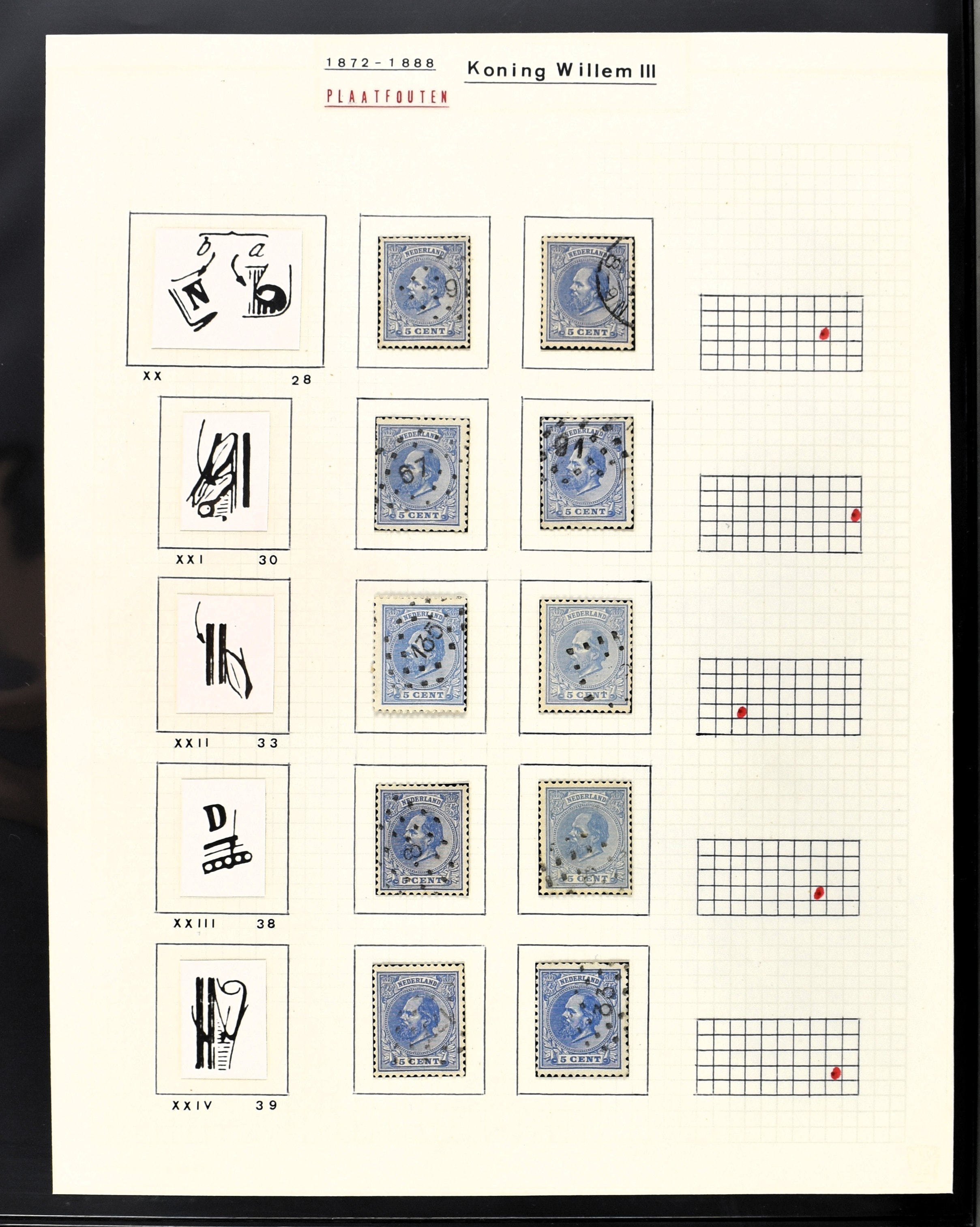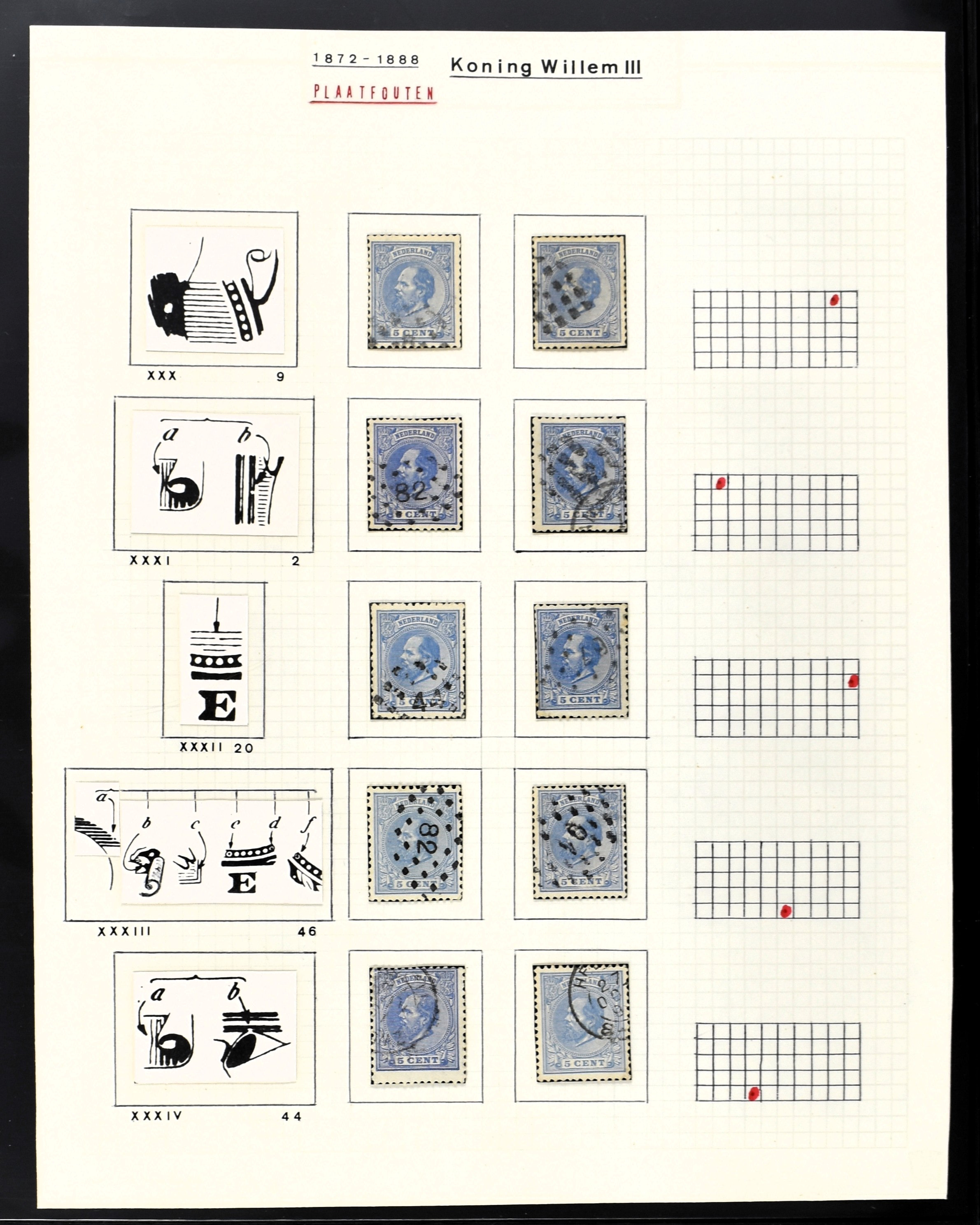 NEDERLAND 5 CENT EMISSIE 1872, uitgebreide en sterk gespecialiseerde verzameling primaire en secundaire plaatfouten, tandingen, papiersoorten, kleurnuances, perfins, poststukken o.a. briefkaarten ook met plaatfouten, in 8 Lindner ringbanden. Tevens literatuur in ringband en Handboek Emissie 1872 A. Dekker cs. Spannende koop!