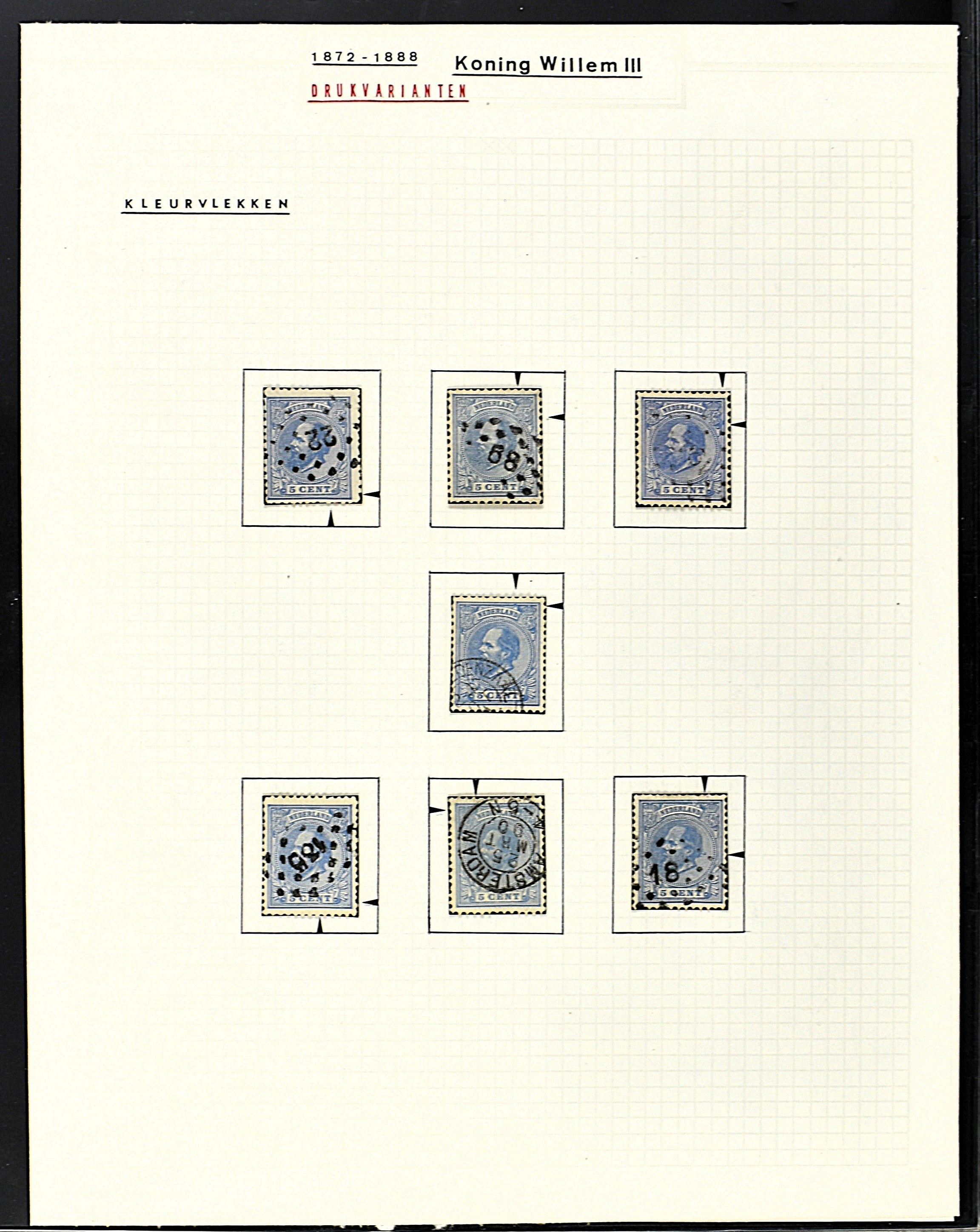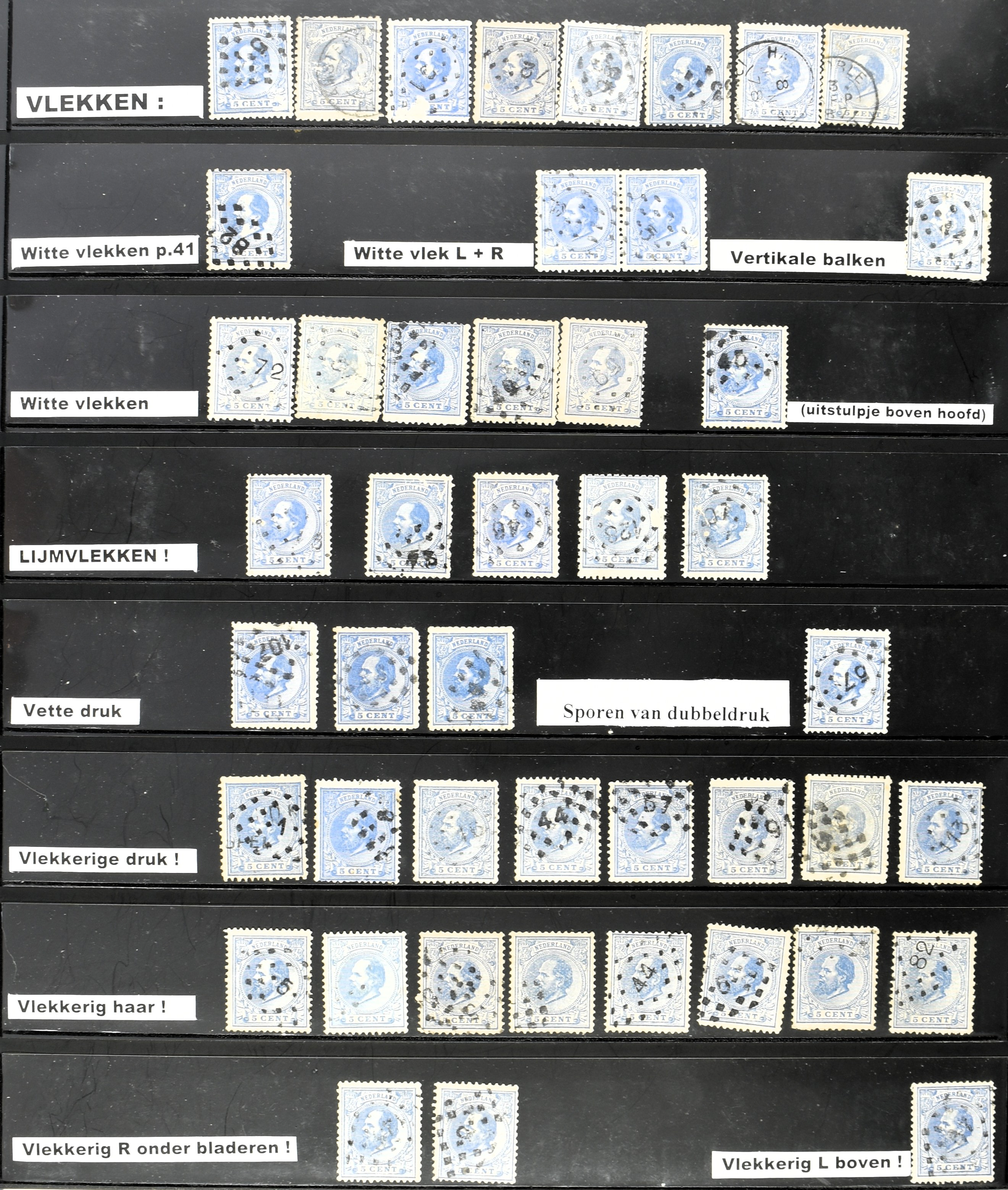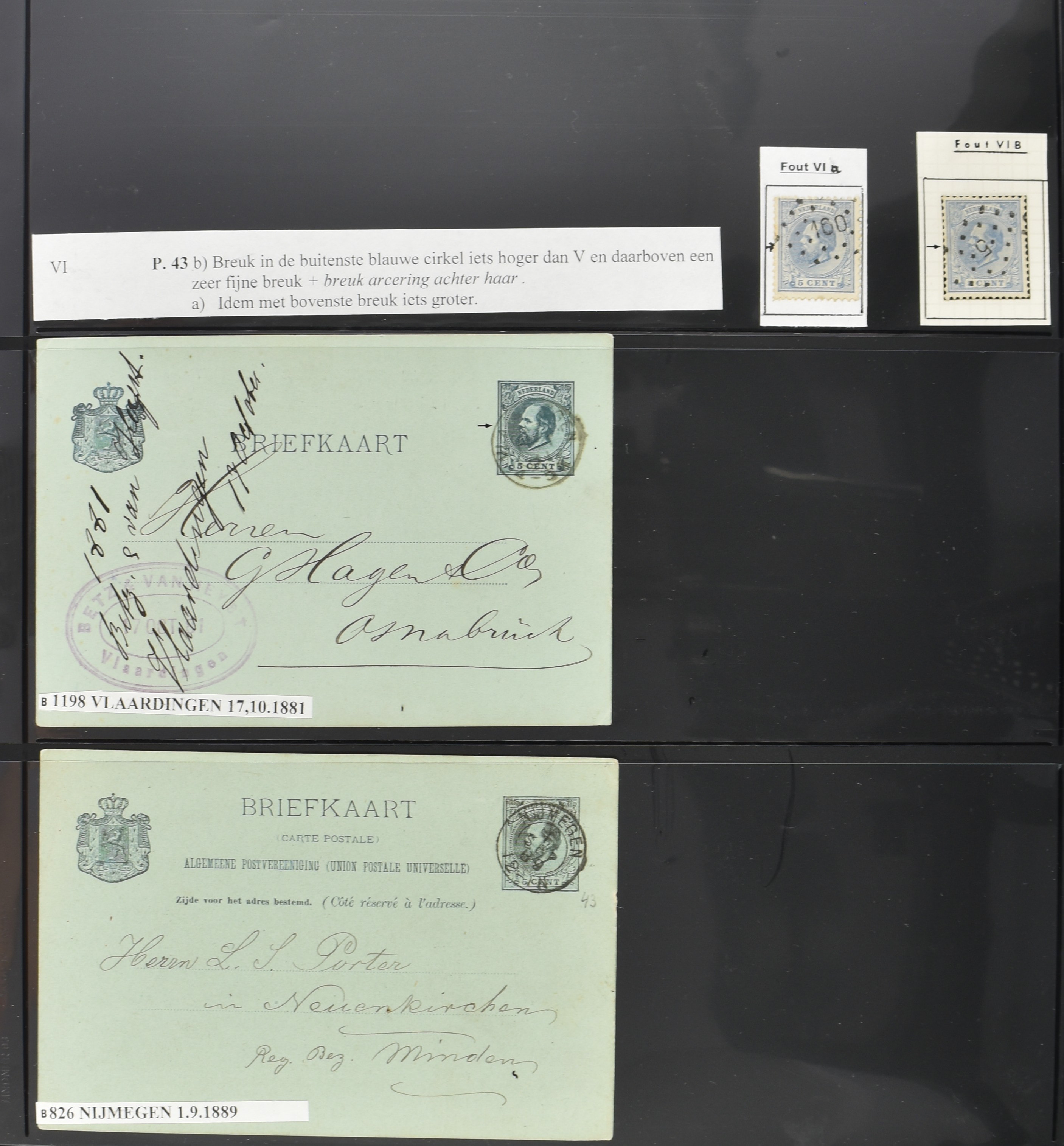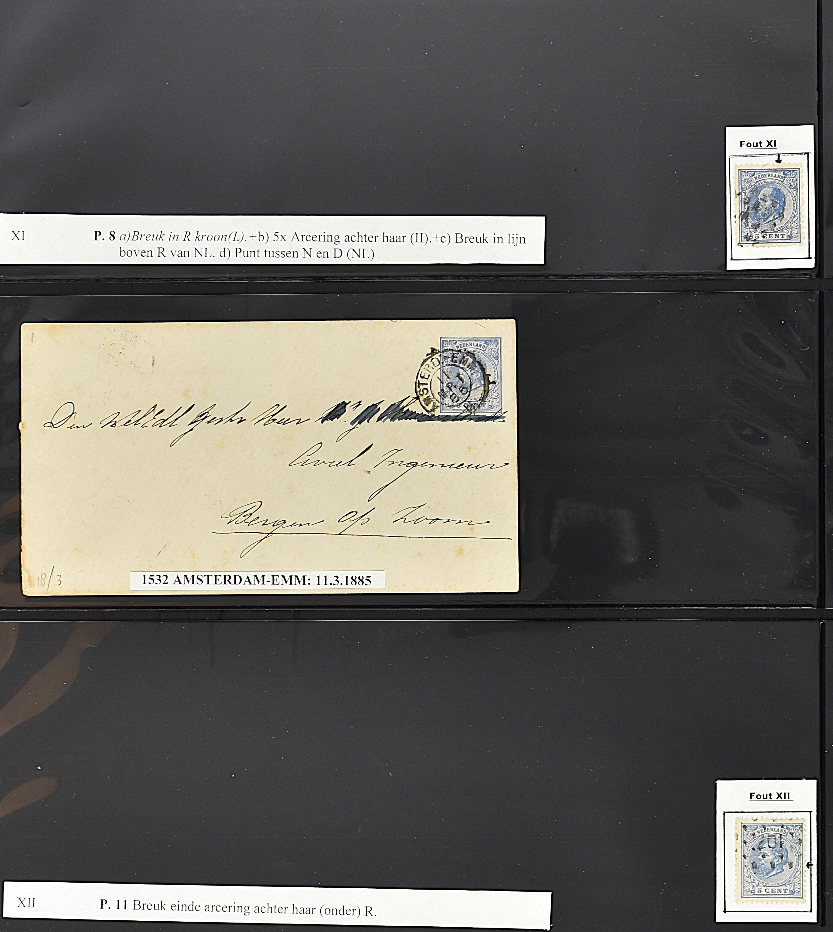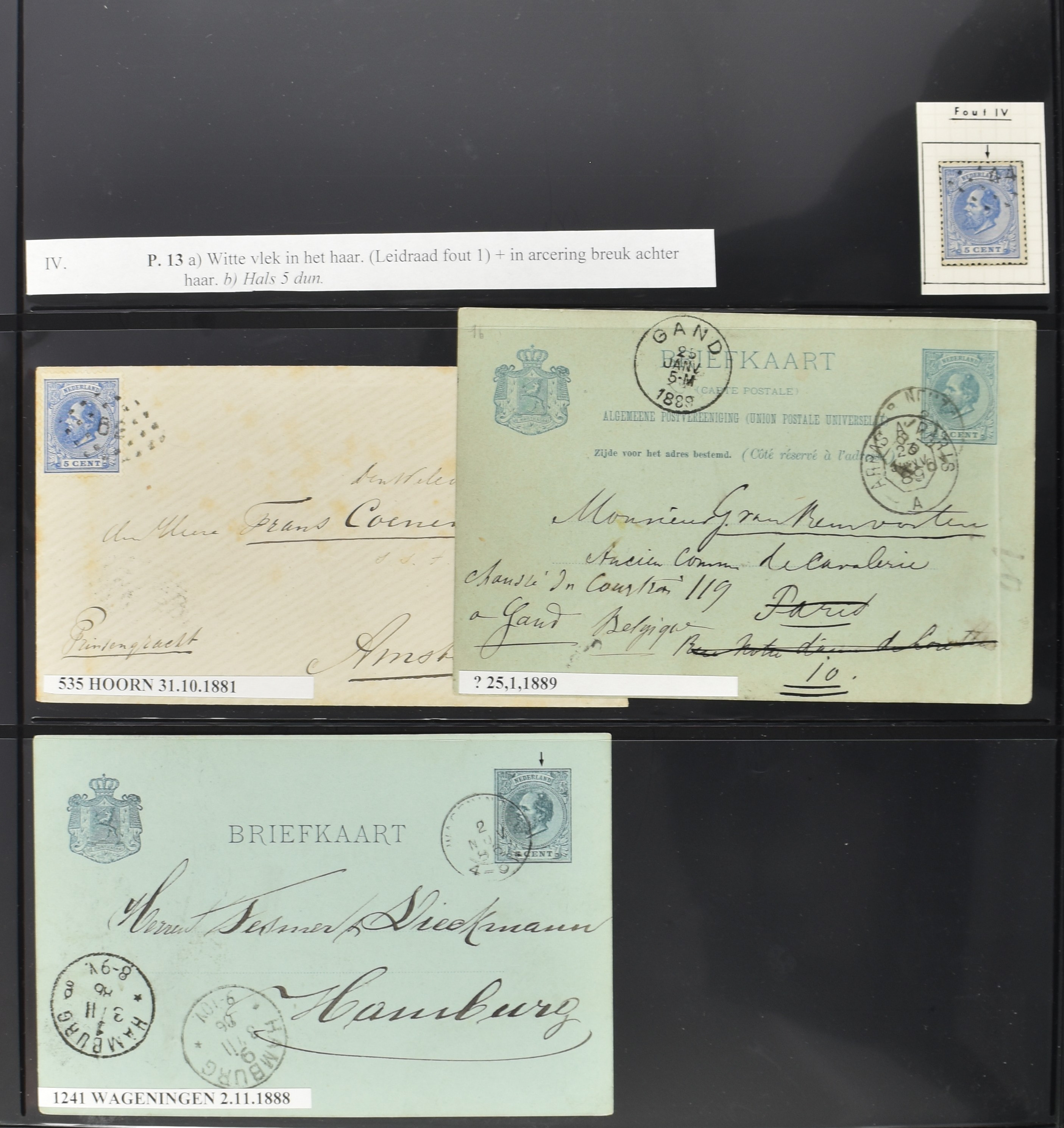 NEDERLAND 5 CENT EMISSIE 1872, uitgebreide en sterk gespecialiseerde verzameling primaire en secundaire plaatfouten, tandingen, papiersoorten, kleurnuances, perfins, poststukken o.a. briefkaarten ook met plaatfouten, in 8 Lindner ringbanden. Tevens literatuur in ringband en Handboek Emissie 1872 A. Dekker cs. Spannende koop!