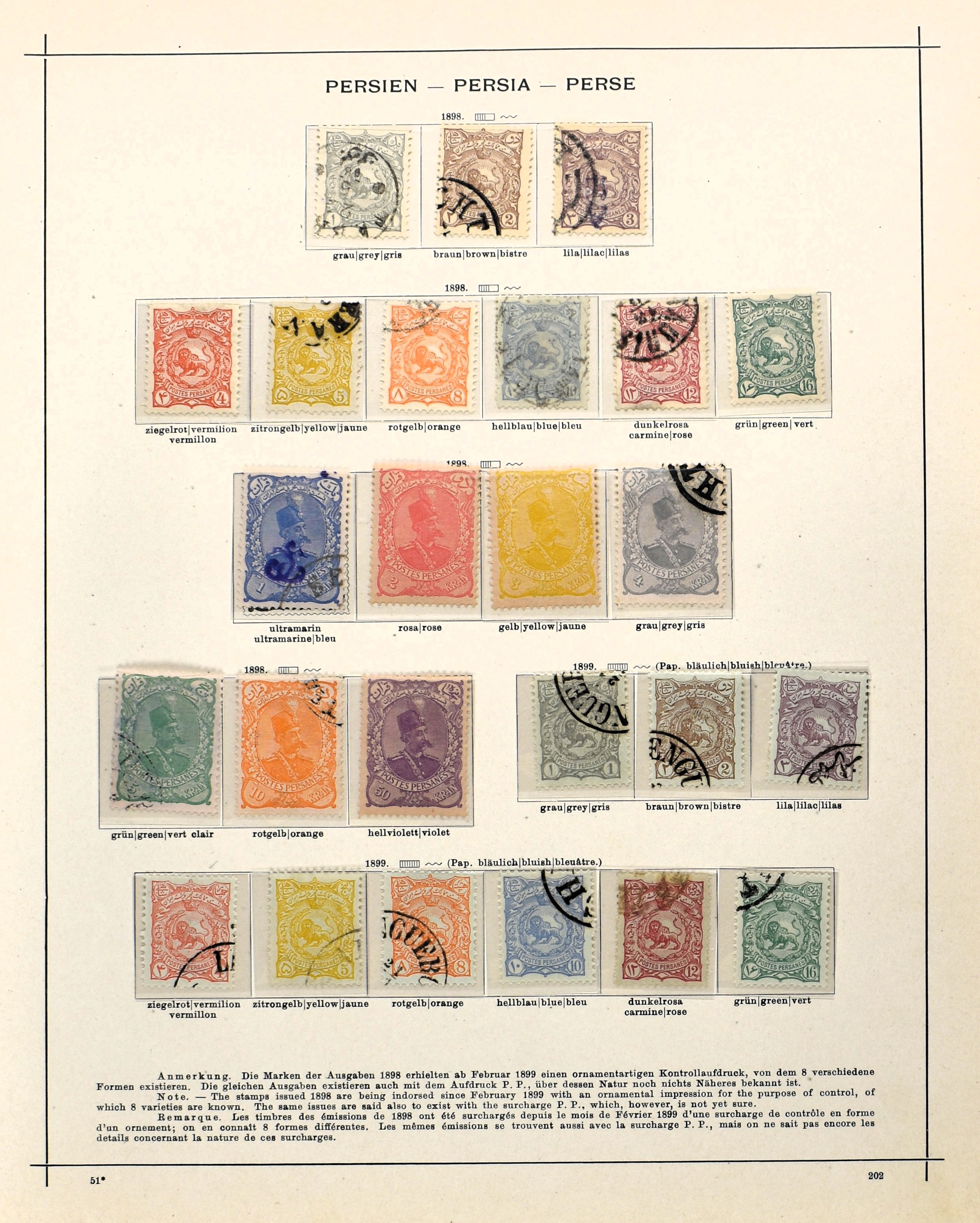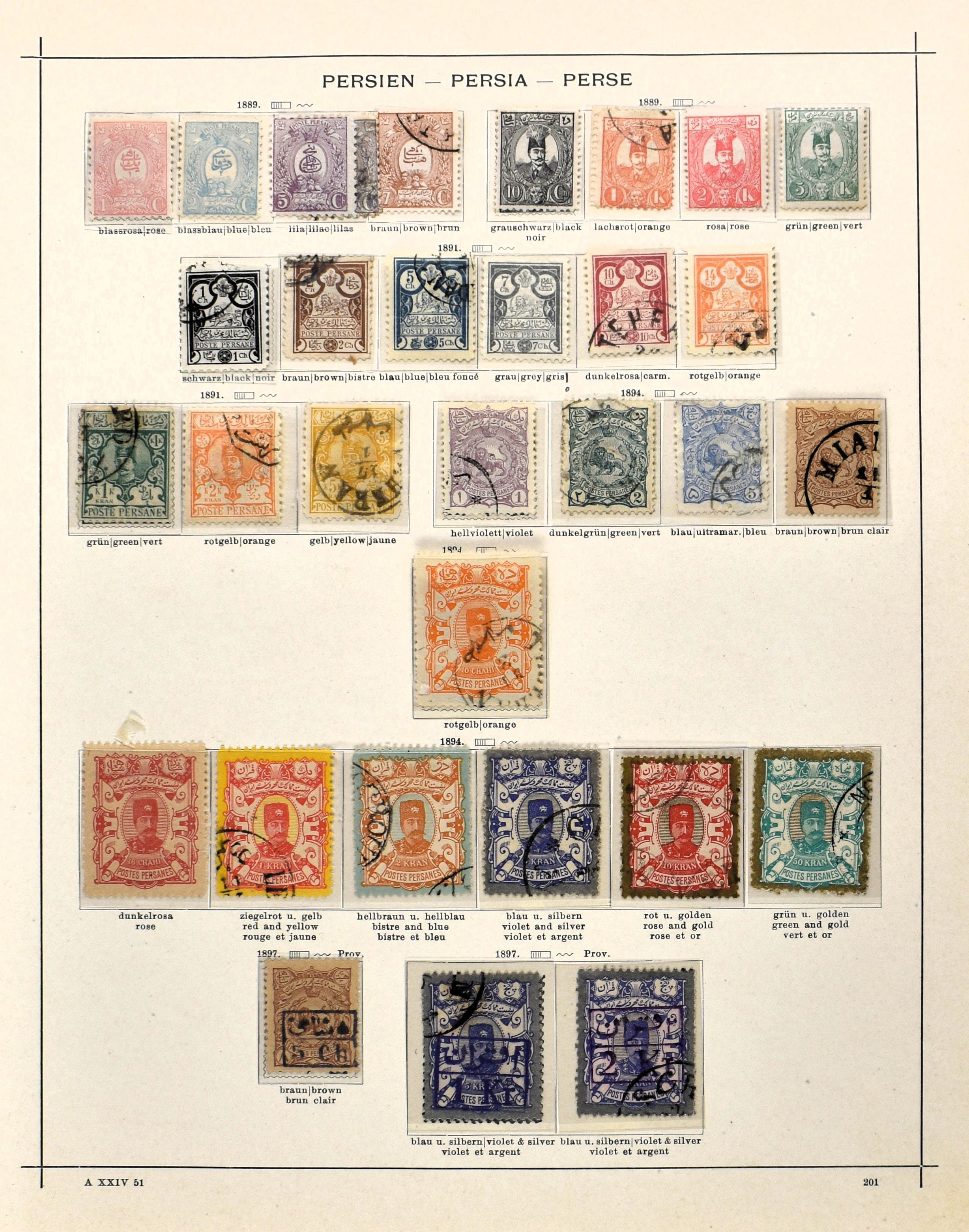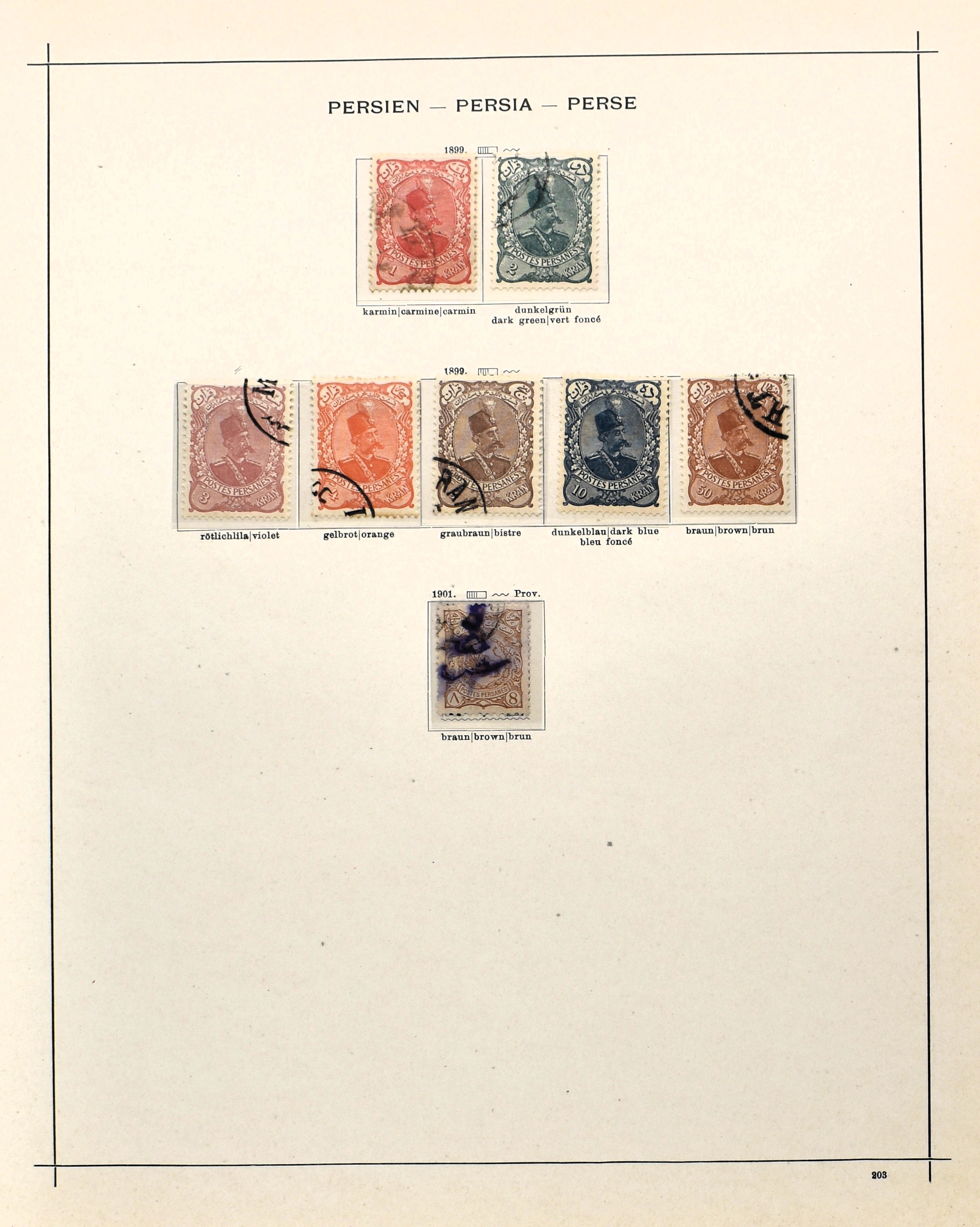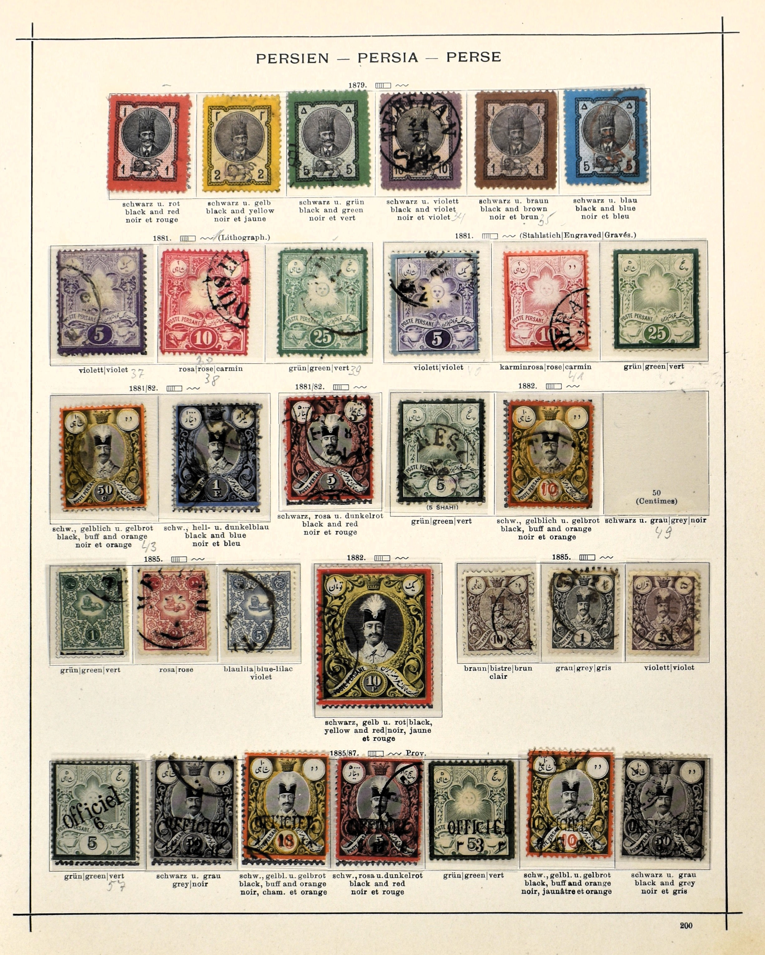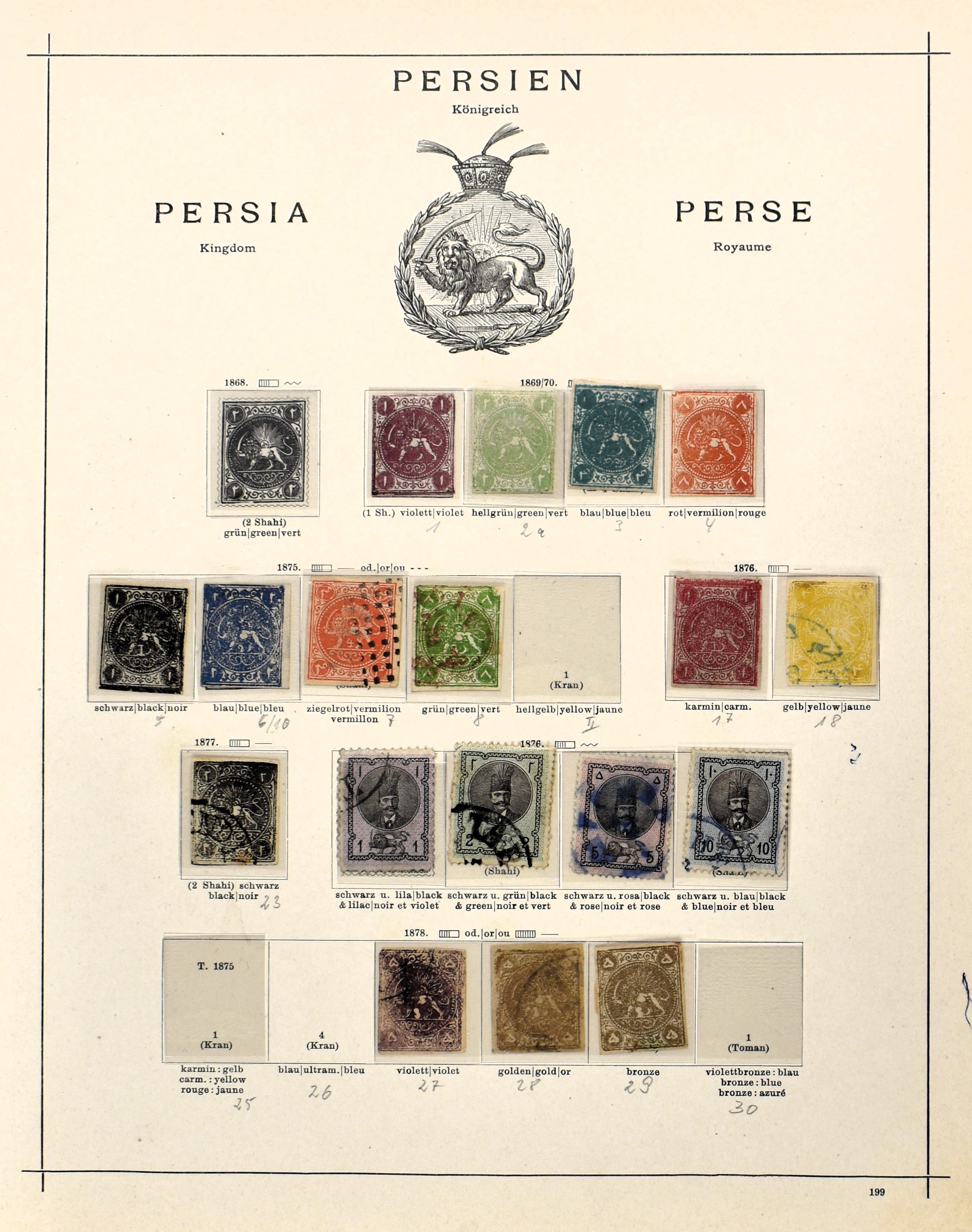 PERSIA 1868-1899, o/(*)/* on album pages with several good numbers such as Mi. 1/4, 5/8, 23, 27, 28, 29, 42*, 56/57* and 74*. Nice collection with a high catalogue value!
