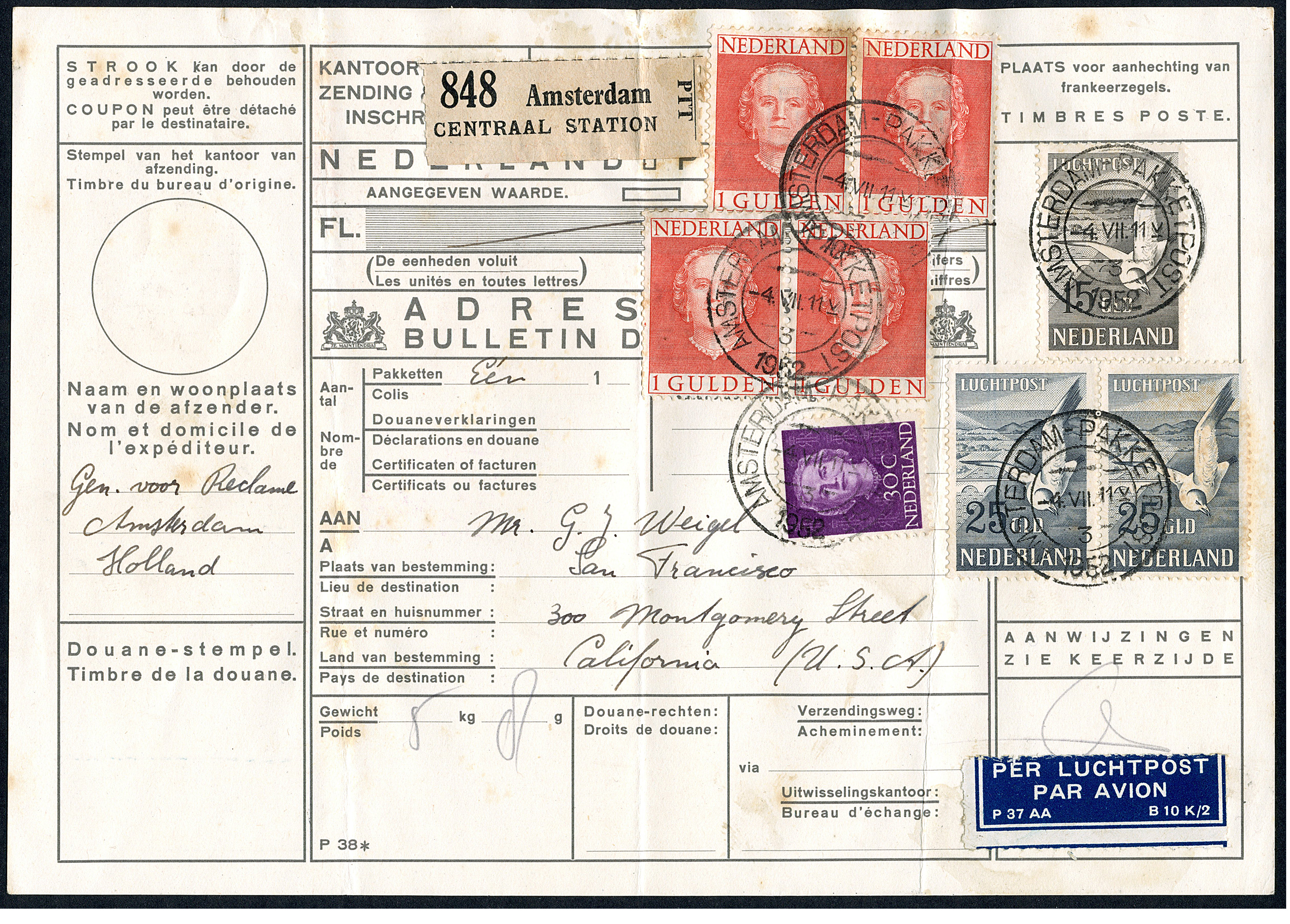 LP12, 15 gulden Zeemeeuw (prachtex.), LP13, 25 gulden Zeemeeuw in paar (linker zegel prachtex., rechter zegel iets minder fris), 30 cent en 2 paren van de 1 gulden op complete adreskaart (enkele vouwen, niet door de luchtpostzegels) voor een postpakket van 5.800 gram, afgestempeld Amsterdam-Pakketpost 4-7-1952, naar San Francisco. Het port voor een gewicht tussen 5 en 6 kg bedraagt ƒ 6,90 cent, het luchtrecht 12x ƒ 5,20 = ƒ 62,40 cent, tezamen ƒ 69,30 (zie: HPN Tarieflijst I-98. Zeer zeldzaam poststuk!