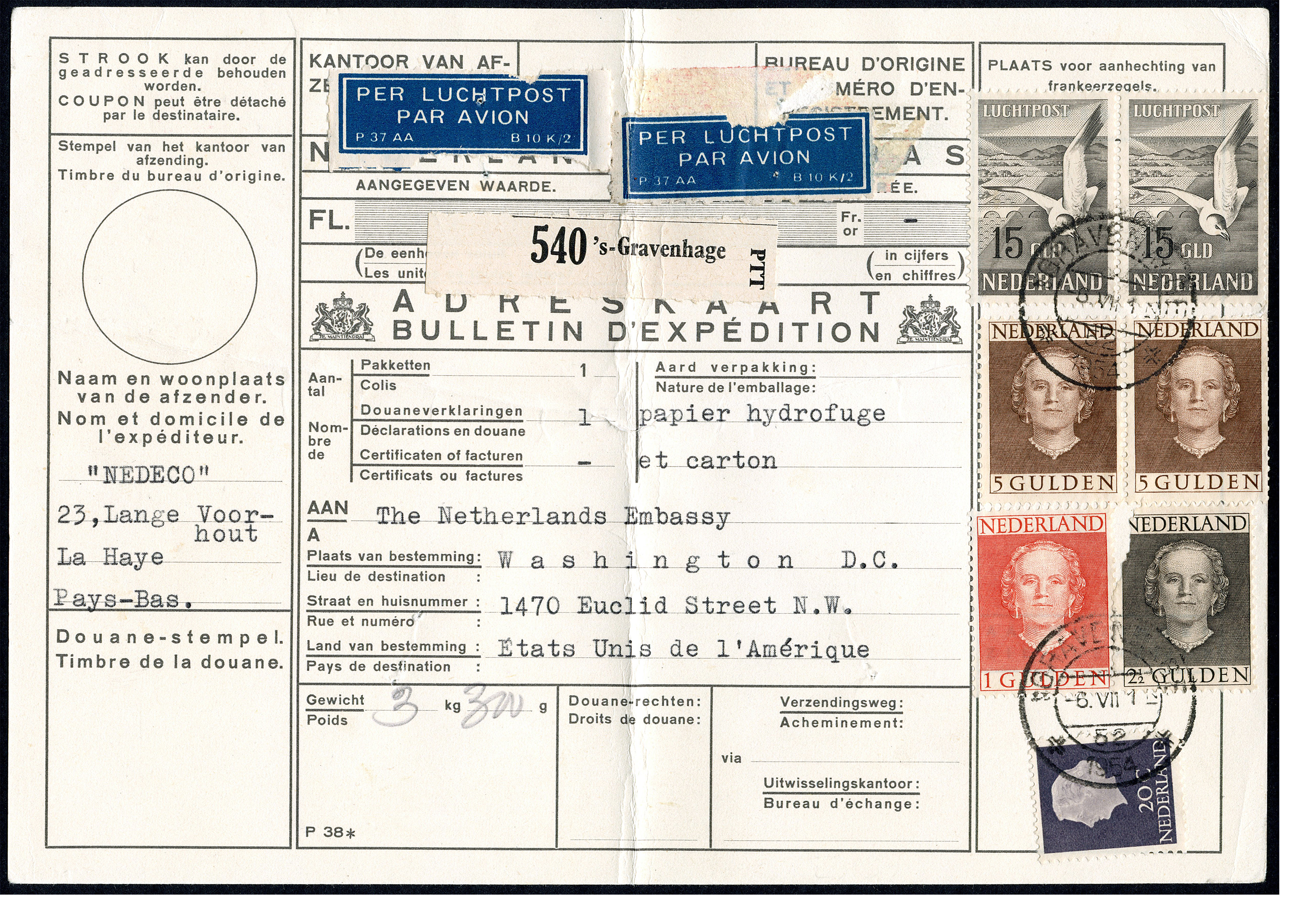 LP12, 15 gulden Zeemeeuw in prachtpaar, 20 cent, 1 gulden, 2½ gulden (beschadigd) en 5 gulden in paar (vouw) op complete adreskaart (enkele vouwen, niet door de luchtpostzegels) voor een postpakket van 3.300 gram, afgestempeld 'sGravenhage 6-7-1954, naar Washington. Het port voor een gewicht tussen 3 en 4 kg bedroeg ƒ 4,50 en het luchtrecht 7x ƒ 5,60 = ƒ 43,70 (zie: HPN Tarieflijst I-98. Zeer zeldzaam poststuk!