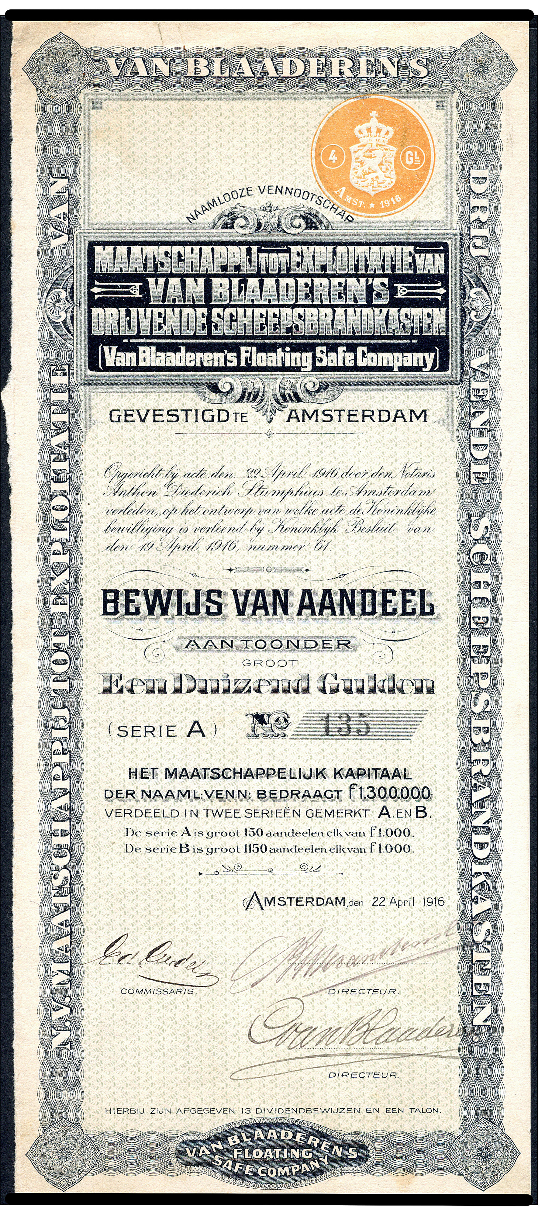 Bewijs van Aandeel, Serie A, aan toonder, groot 1000 gulden, met ingedrukte zegel van 4 gulden, ondertekend door o.a. C. van Blaaderen, en bijbehorende talon