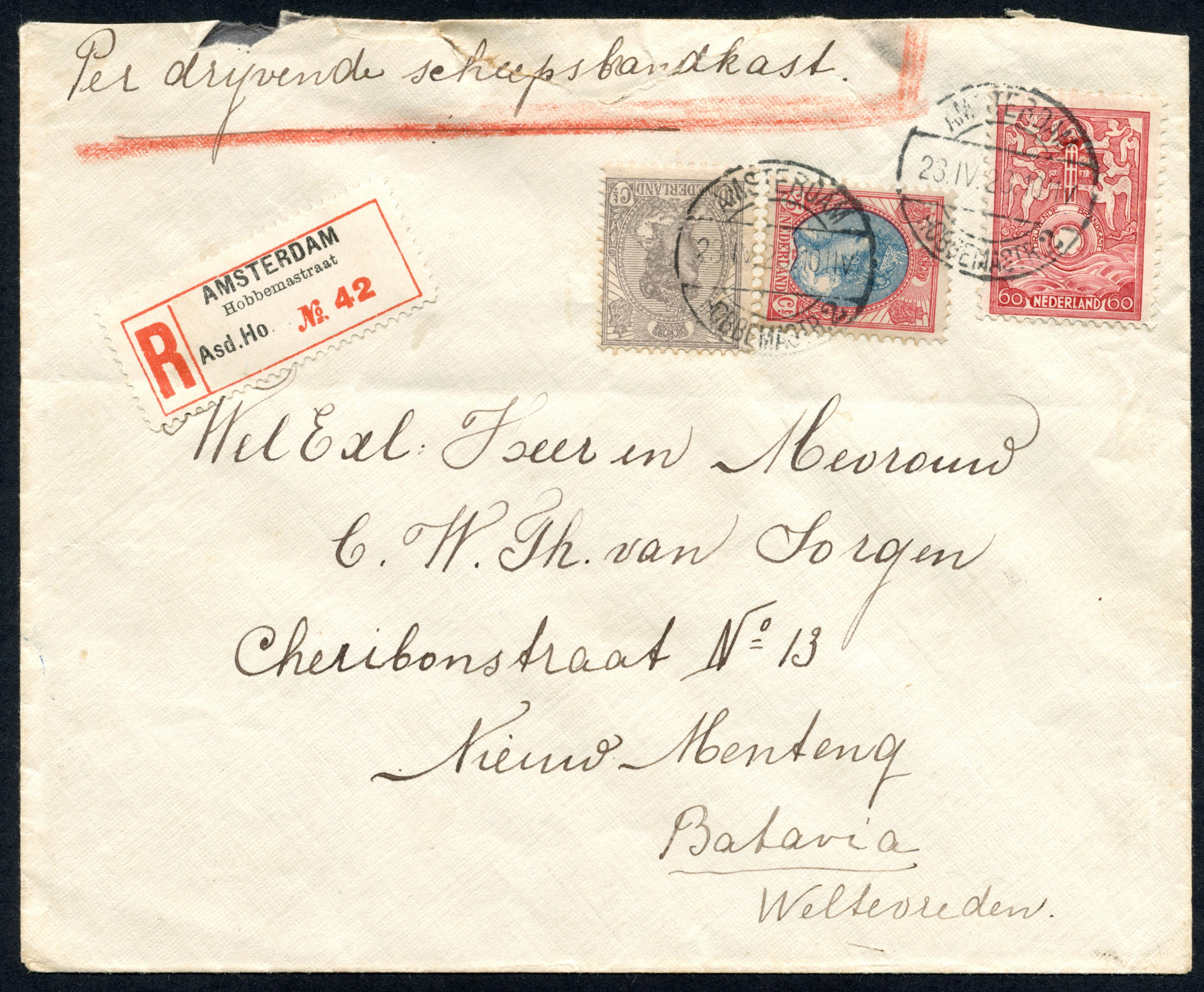 BK2, 60 cent Brandkast plus 10 en 25 cent Bontkraag op wat ruw geopende envelop van Amsterdam / Hobbemastraat 2 23-4-1923 aangetekend en per scheepsbrandkast naar Nieuw Menteng in Batavia (geen aankomststempel)
