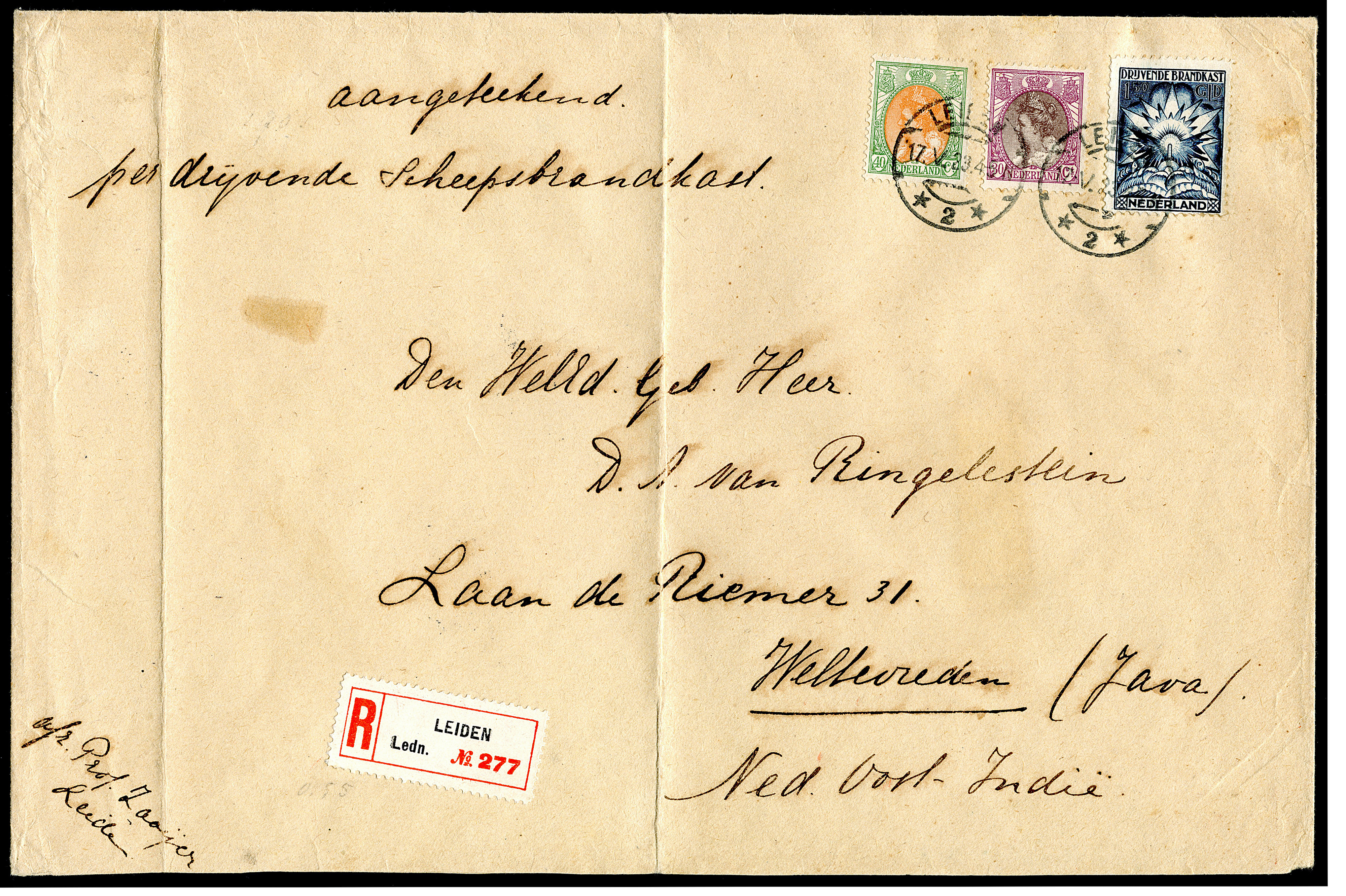 BK4, 1½ gulden Brandkast op grootformaat envelop (2 vouwen) gefrankeerd met nrs. 72 en 73 van een hoogleraar te Leiden 17-5-1923 aangetekend en per scheepsbrandkast naar Weltevreden 30-6-1923. Het gewicht staat niet aangeven maar moet tussen de 180-200 gram zijn geweest. Tarief per zeepost: port 55 cent + R-recht 15 cent = 70 cent, brandkastrecht 150 cent. De brief is correct gefrankeerd. Zie: Fil. Inf. (22), juni 1989, p.7520-131 (= Bijlage 1). Hoogst zeldzaam poststuk!