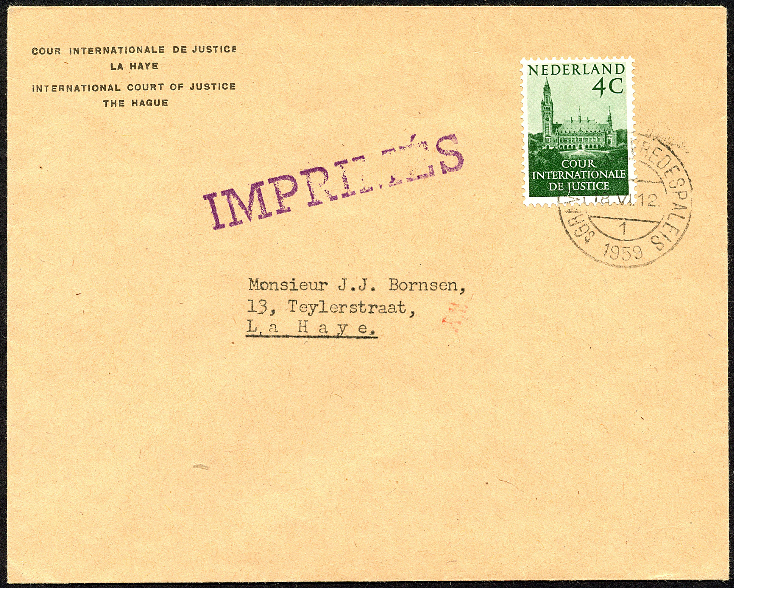 4 Cent Courzegel D29 op open Courcouvert, waarin drukwerk zat, afgest. 'sGravenhage-Vredespaleis 18-6-1959