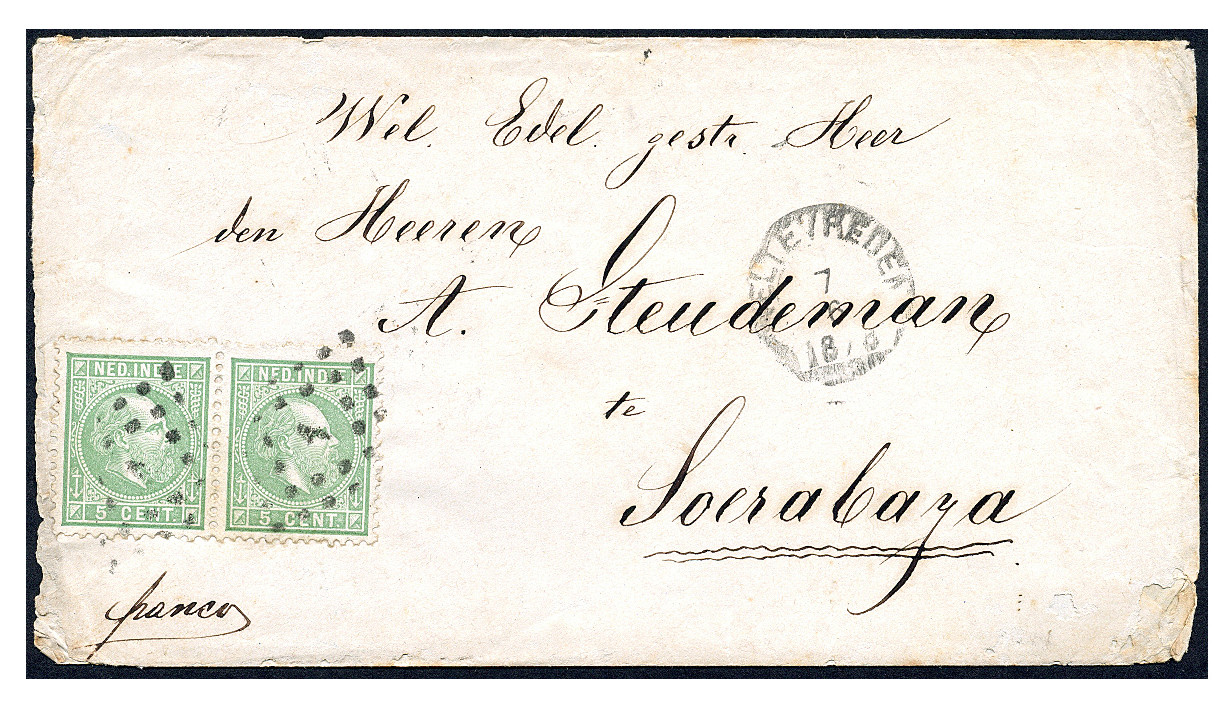 5 Cent in gecombineerde tanding 11½ : 12 + 12½ : 12 gr.g. in prachtpaar nrs. 8G + 8F op envelop (met wat leeftijdssporen) van Weltevreden 7-6-1878 naar Soerabaja 12-6-1878. Zeer zeldzaam en zeker op poststuk! NVPH cat. voor gebruikt: -.-