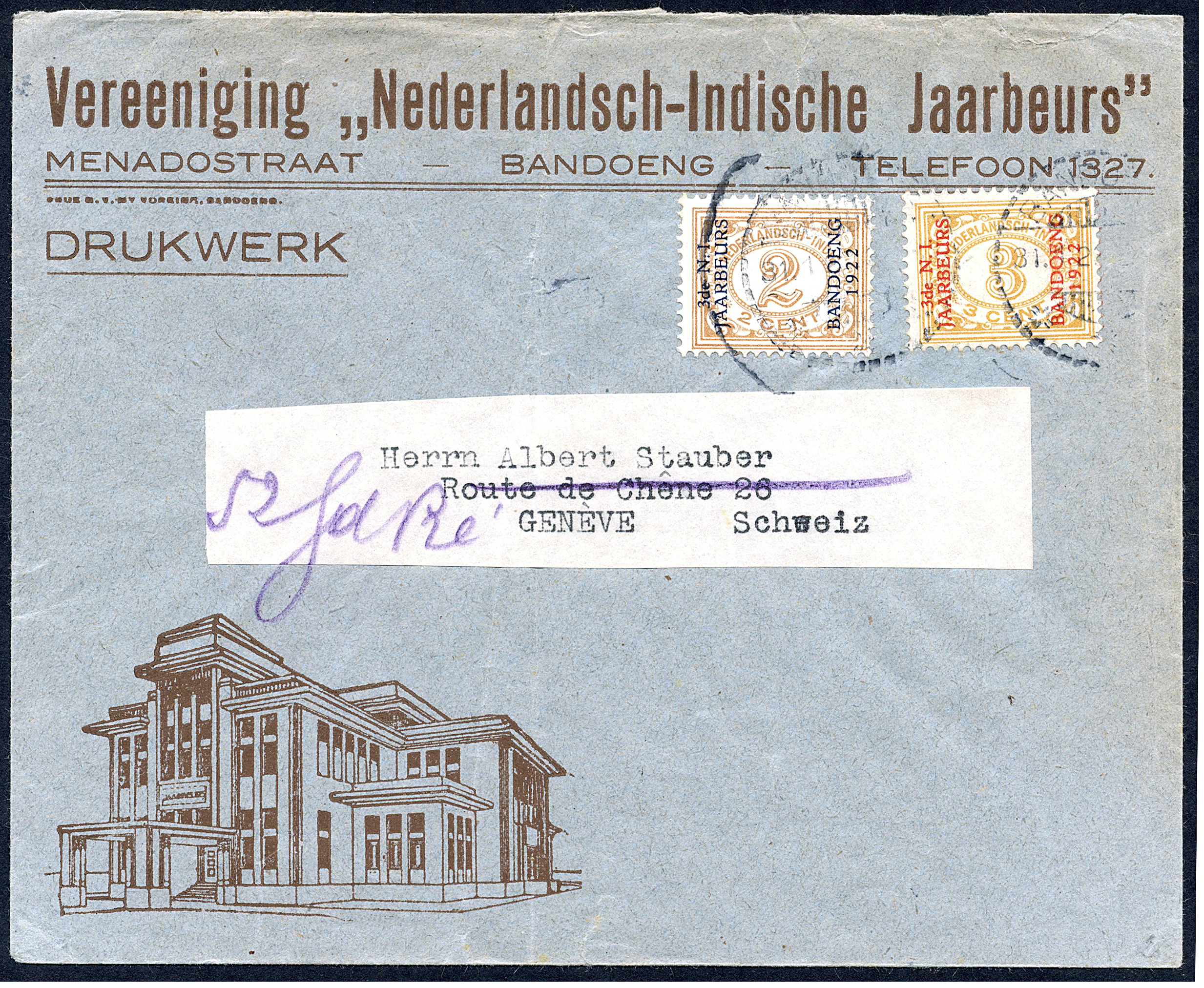 150, 152, Jaarbeurszegels van 2 en 3 cent op speciale Jaarbeursenveloppe (klep ontbreekt, verticale vouw) als drukwerk van Bandoeng 31-1-1923 naar Genève. Zeldzaam gebruikt op poststuk en dat zeker naar het buitenland! Drukwerktarief naar UPU-lidstaten van 1-2-1921 tot 1-10-1925 is 5 cent