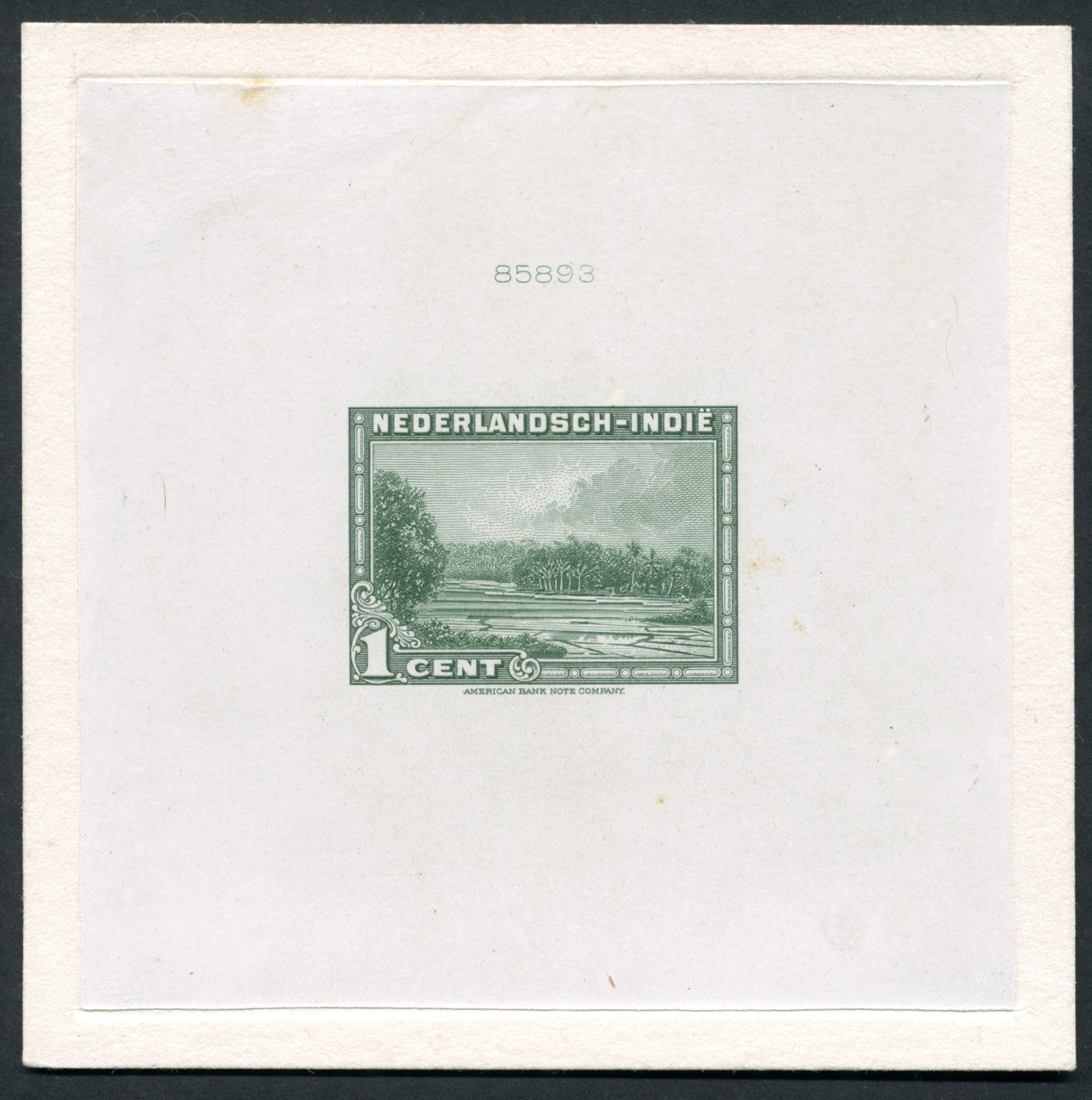 304, 1 cent type Bevrijding 1945 in de gekozen kleur geelgroen als stempelproef in plaatdruk op dun papier met getal 85893 op een kartonnetje, PC.286. Prachtex. (miniem bruin plekje boven links). Schaars! Fl. 500
