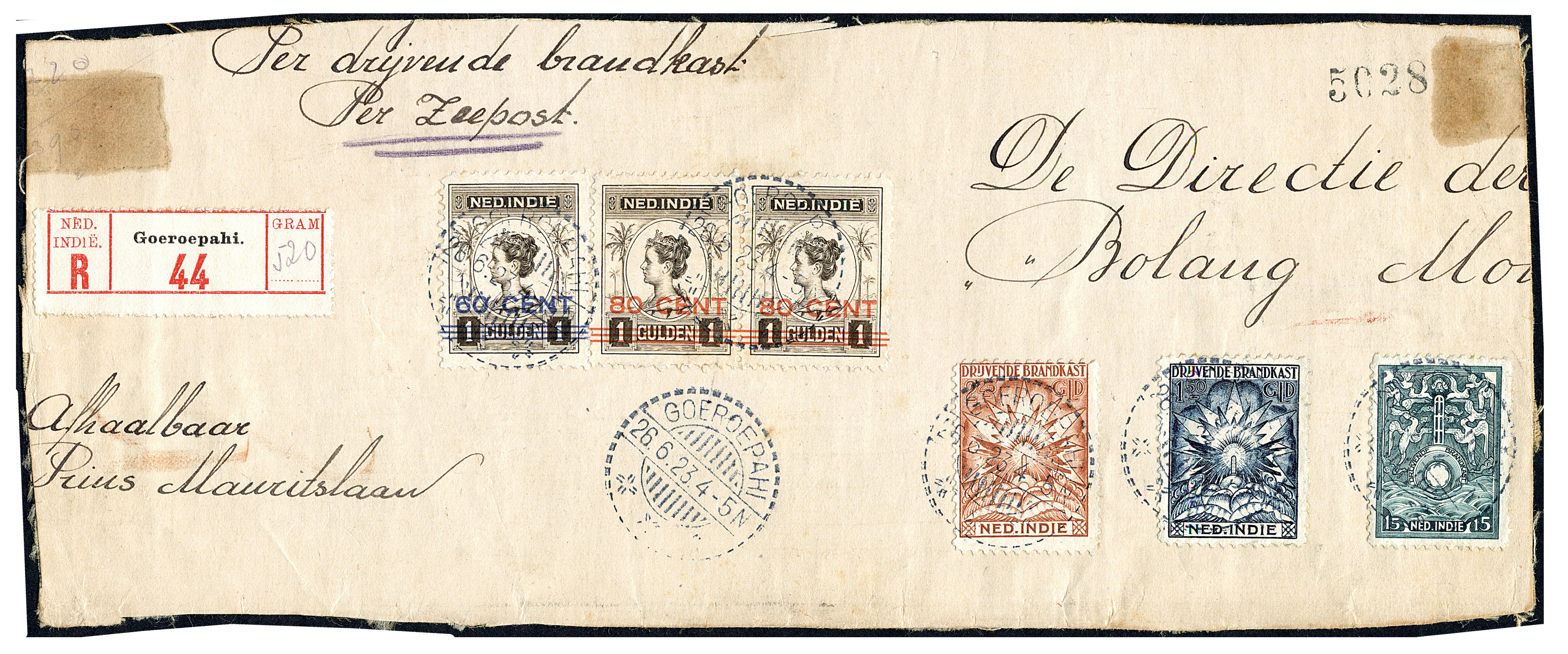 BK1, 4/5 tezamen met nrs. 147 en 148 in paar (alle zegels prachtexemplaren) op een gedeelte van de voorzijde van een poststuk van 520 gram, verzonden van Goeroepahi 26-6-1923 aangetekend en per scheepsbrandkast naar Den Haag, waar het stuk kon worden afgehaald aan de Prins Mauritslaan. De afzender is de Exploratie en Exploitatie Maatschappij 'Bolang Mongondou' en de geadresseerde de directie van deze maatschappij, gevestigd aan de Koningin Emmakade 156 te Den Haag. Te Goeroepahi, in Noord-Celebes, werd stofgoud gedolven. Ten behoeve van deze mijnbouwmaatschappij is er een hulppostkantoor gevestigd van 1-8-1917 tot 19-3-1926. Toen werd het goud delven daar niet meer rendabel. Hoogst waarschijnlijk is met het poststuk stofgoud verpakt geweest dat moest worden beoordeeld o.i.d. door de directie in Den Haag. Tarief: briefport 200 cent + R-recht 20 cent = 220 cent, brandkastrecht 26 x 15 cent = 390 cent, voldaan met brandkastzegels van 15 + 150 + 225 cent. Zie: Fil. Inf. (27), p.7520-135, afb. 88 met als opmerking 'Het is het enig bekende stuk met hoge waarden brandkastzegels waar geen filatelistische bijbedoelingen hebben voorgezeten.' Tentoonstellingsstuk en een van de absolute topstukken uit de Nederlands-Indische filatelie!