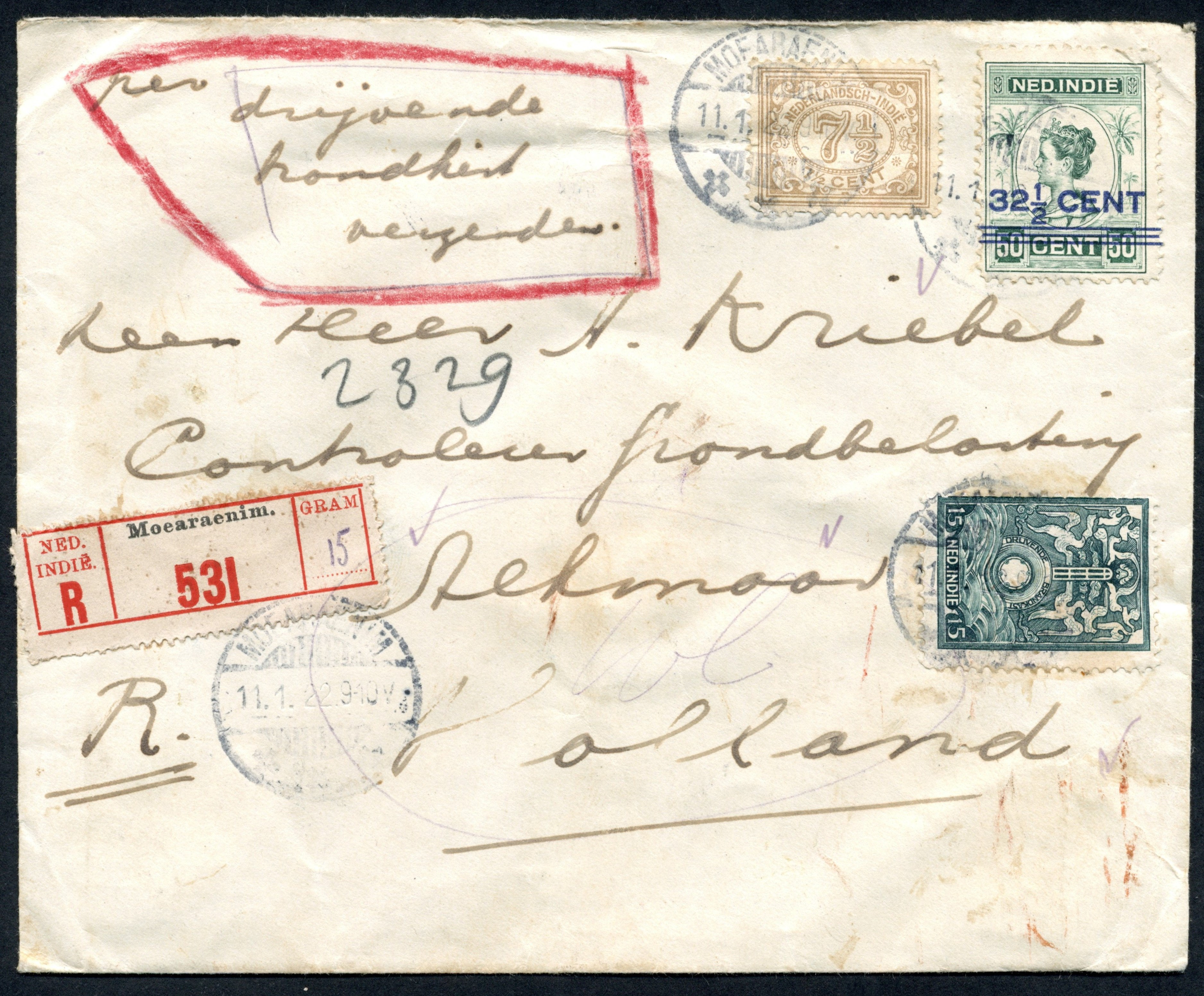 BK1, 15 cent Brandkast op envelop van 15 gram gefrankeerd met nrs. 113 en 145 van Moearaenim 11-1-1922 aangetekend over Palembang 12-1-1922 per scheepsbrandkast naar Alkmaar. Tarief: 20 cent briefport per mail + 20 cent R-recht + 15 cent brandkastrecht. Zie: Fil. Inf. (22), juni 1989, p.7520-70 en 131, afb. 59