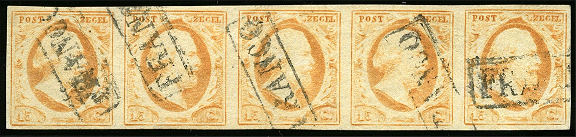 3c, pos. 46/50. Mooi gerande prachtstrip van vijf. Schaars!