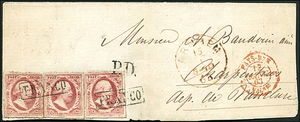 10 Cent nrs. 2n-Pl.VIII pos. 7/?/17 op briefomslag van Arnhem 15-1-1863 via Valenciennes 17-1 naar Charpentras 18-1 met op vz. tevens 'P.D.'