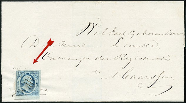 5 Cent (randstuk) op zeer frisse briefomslag van Breukelen (az. naamstempel) naar Maarssen. De zegel heeft een penvernietiging, waarschijnlijk omdat het gebroken cirkelstempel Loenen te licht is afgedrukt (volgens notitie 5-9-1855)