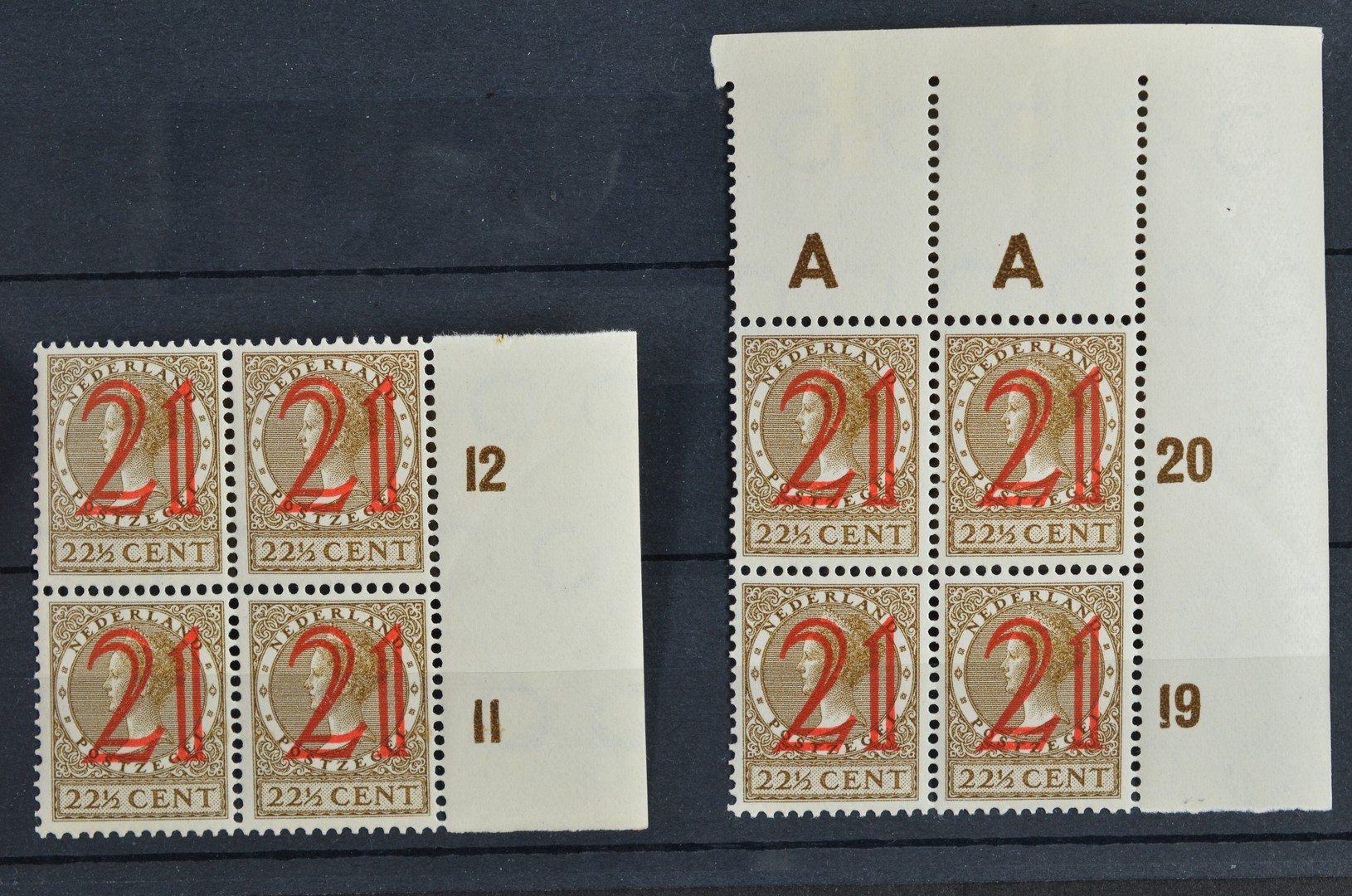 224, Hulpzegel 21 op 22½ cent Veth (8), postfris pracht rand- en hoekblok van vier. € 480