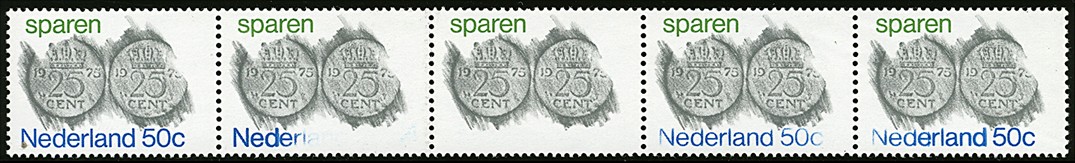 1078f, foutdruk: zonder 'Nederland 50 c.' temidden in strip van 5 waarbij meerdere variëteiten, cert. Vleeming (2015)