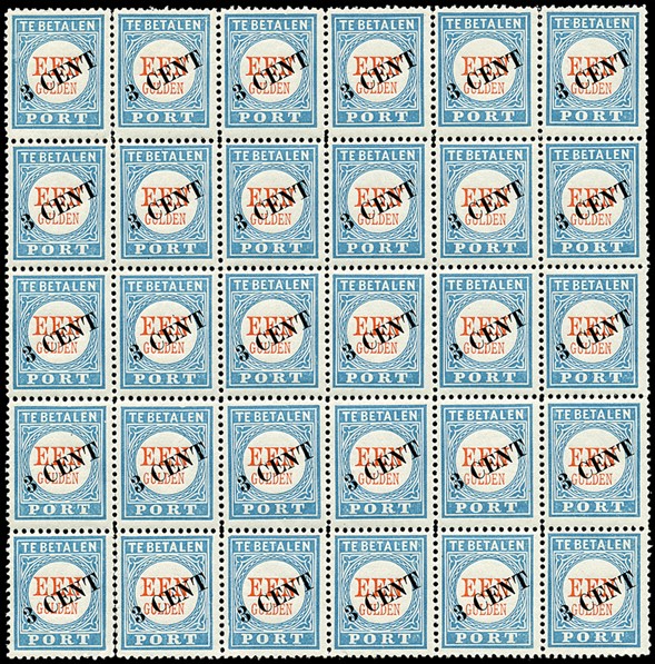27 Type III, 3 cent op 1 gulden in postfris blok van dertig. Hier en daar wat los op de tanding, enkele zegels paar halve tandjes (zie afbeelding), doch als zodanig een zeldzaam blok in bijzonder goed bewaarde kwaliteit. € 4500