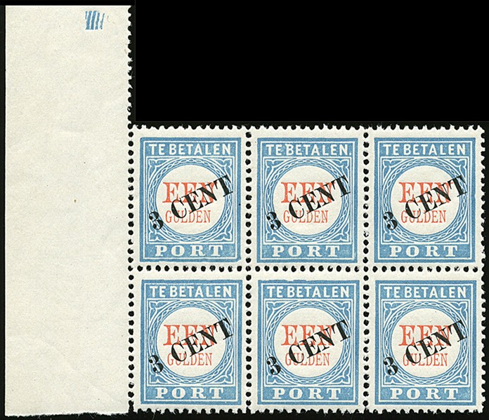 27 type III, 3 cent op 1 gulden in postfris randblok van zes met bedrukking op velrand. € 900