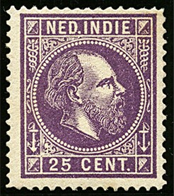 13B, 25 cent donkerpaars, Lt. 14 gr.g., ongebruikt zeer fraai ex. (boventanding verbeterd en gom niet in originele staat), ongebruikt een zeldzaam zegel ! Certificaat Vleeming (2011) € 1000