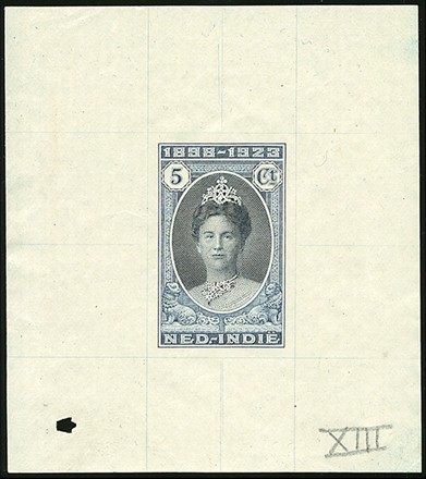 Stempelafdruk in plaatdruk van de 5 cent Jubileum 1923 op een ongetand en ongegomd velletje waarin knip en waarop met potlood geschreven 'XIII', volgens Michel kleurengids in de kleur donkerblauw (31-0-7). Luxe kwaliteit