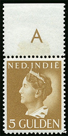 287, 5 Gulden geelbruin, postfris pracht-randstuk € 400 +