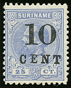 32aD, 10 cent op 25 ct. ultramarijn Kt. 11½ x 12, ongebruikt prachtex. met cert. NVPH (1993) € 825